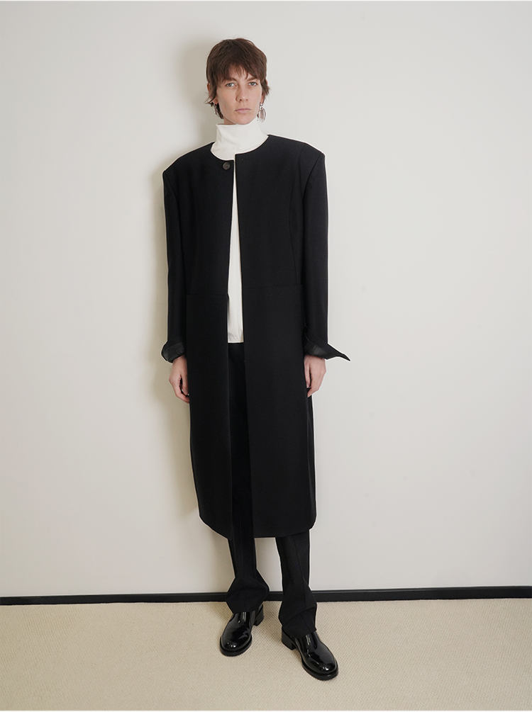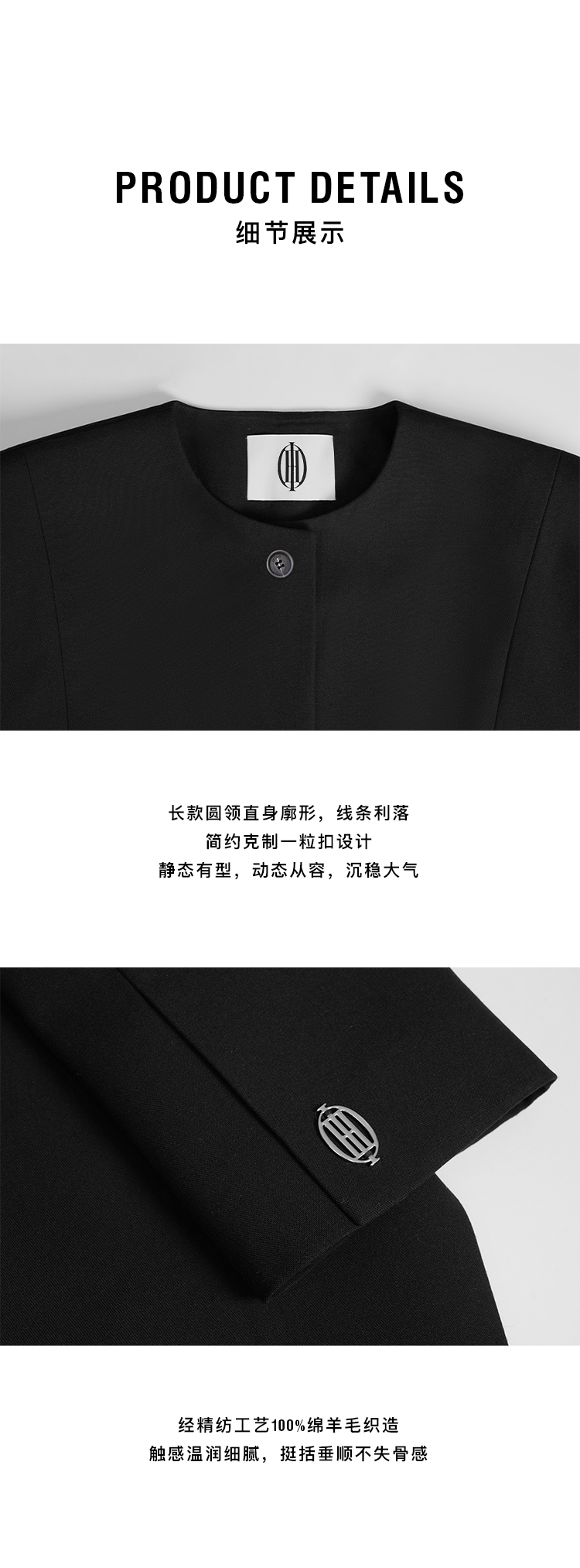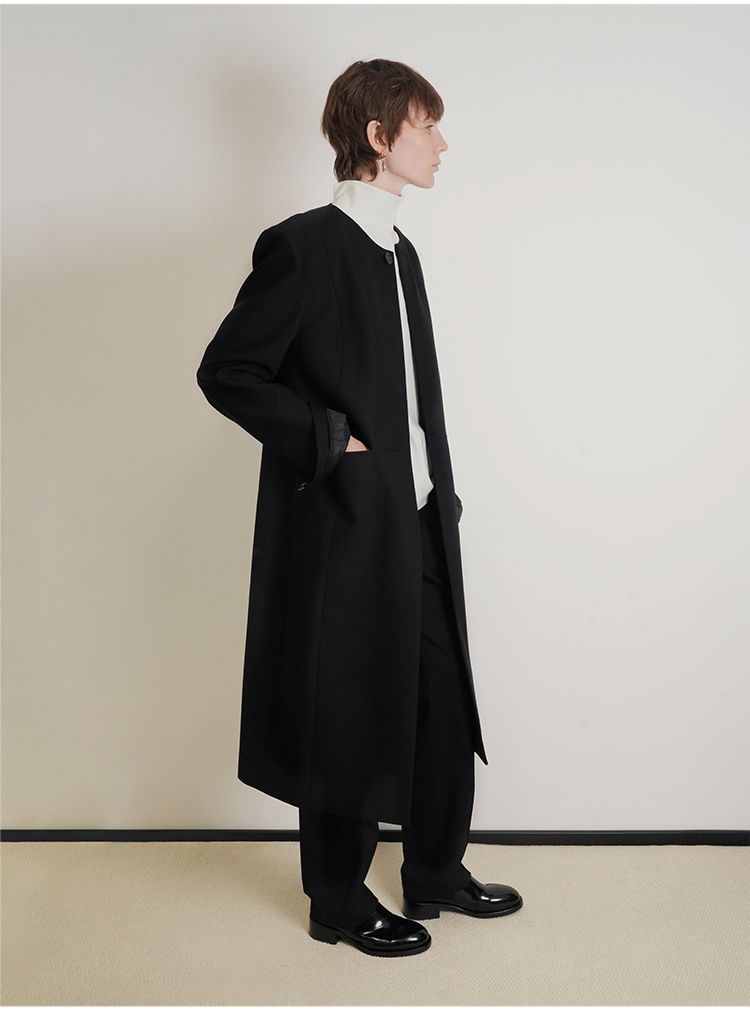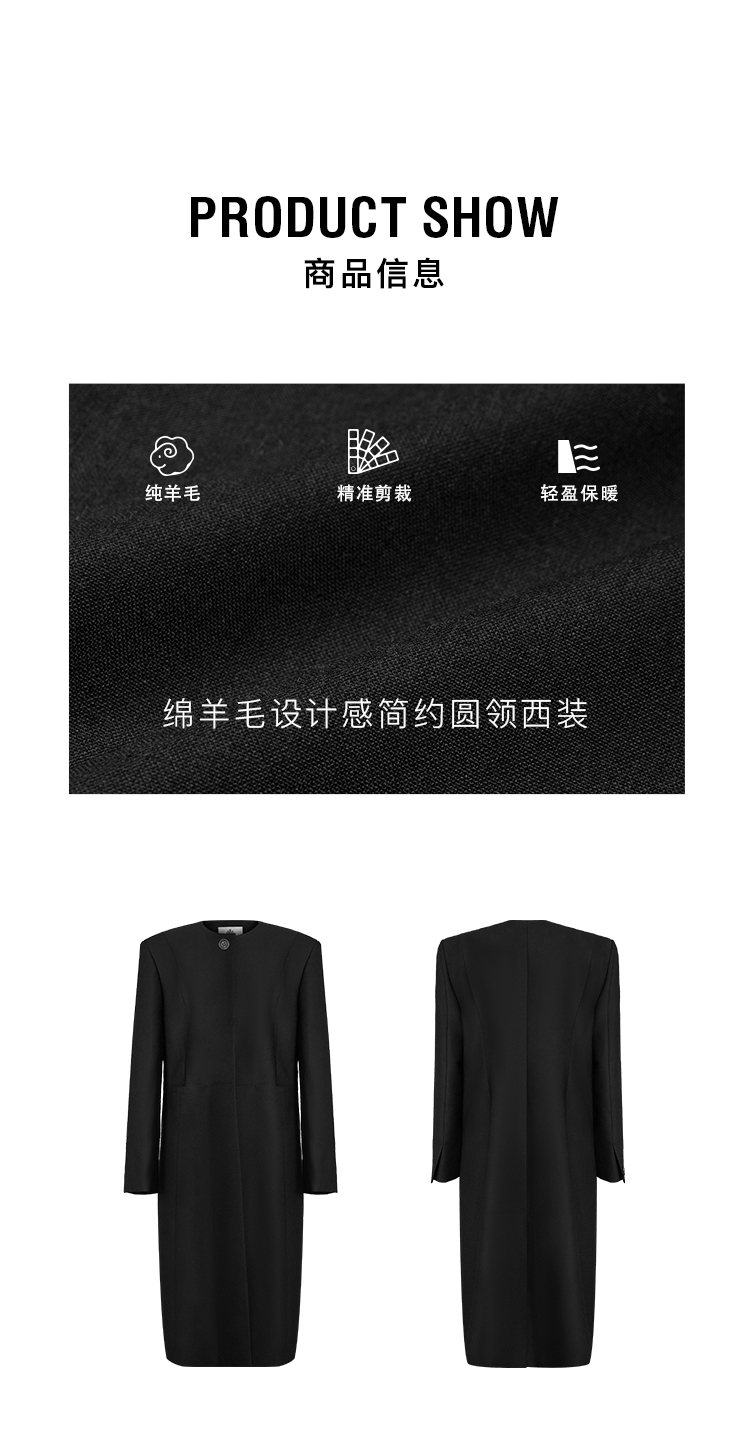 HIDEMI 绵羊毛设计感黑色简约圆领长款西装西服外套