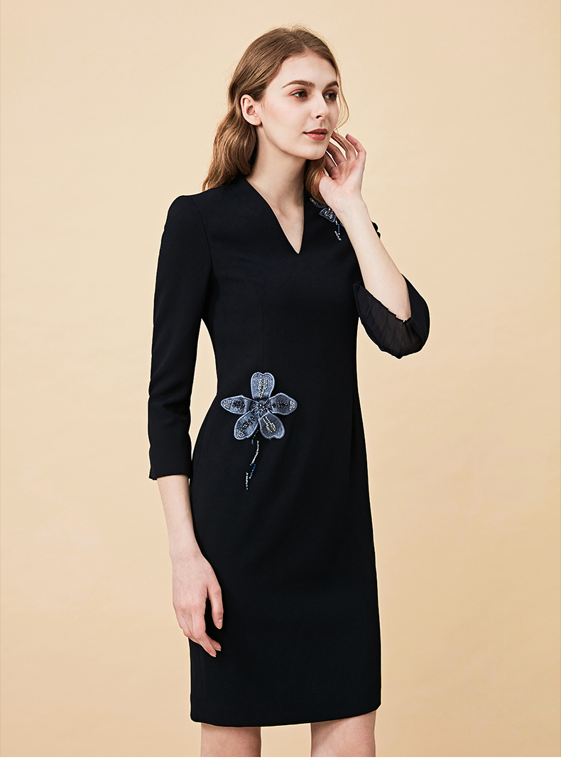 皮尔卡丹女秋季藏蓝色V领绣花长袖连衣裙气质V领淑女裙P83DL01N0