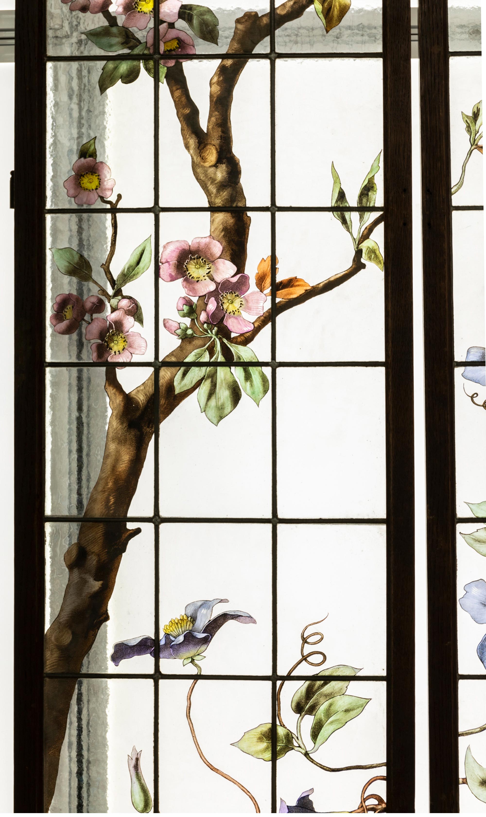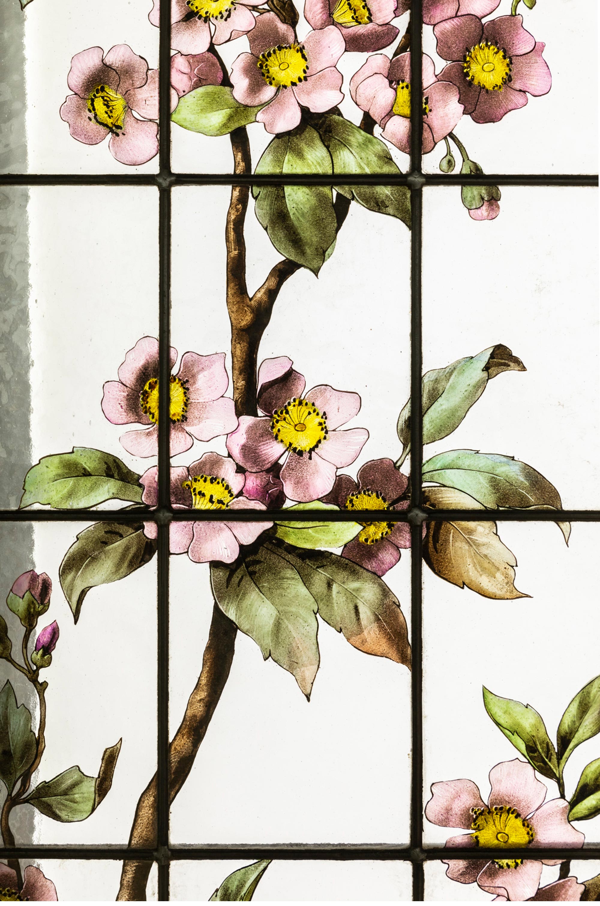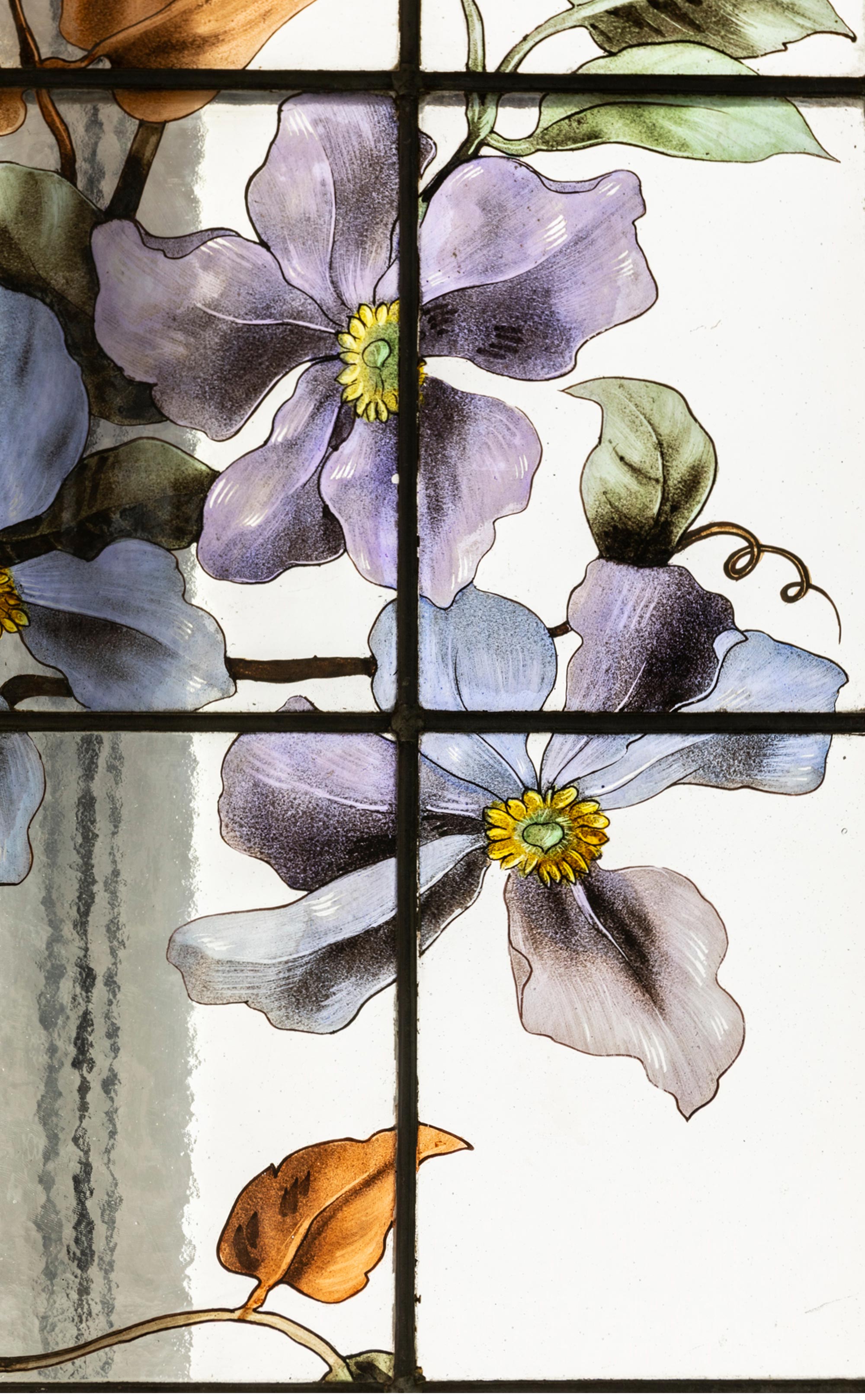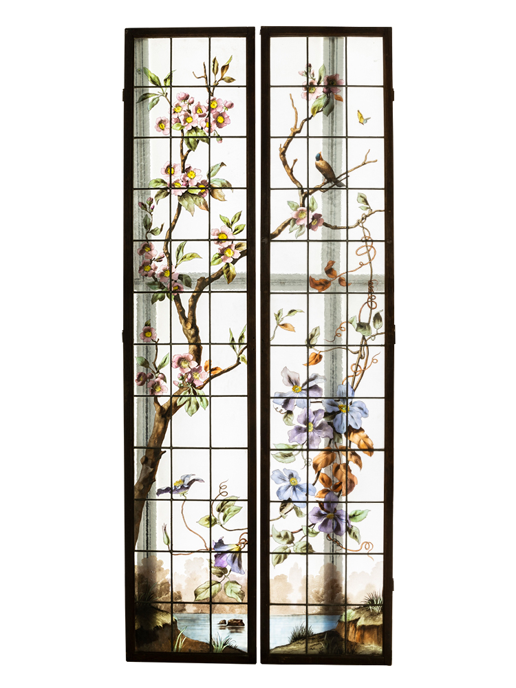 19世纪末法国新艺术时期出品水岸花开主题彩绘玻璃花窗一对