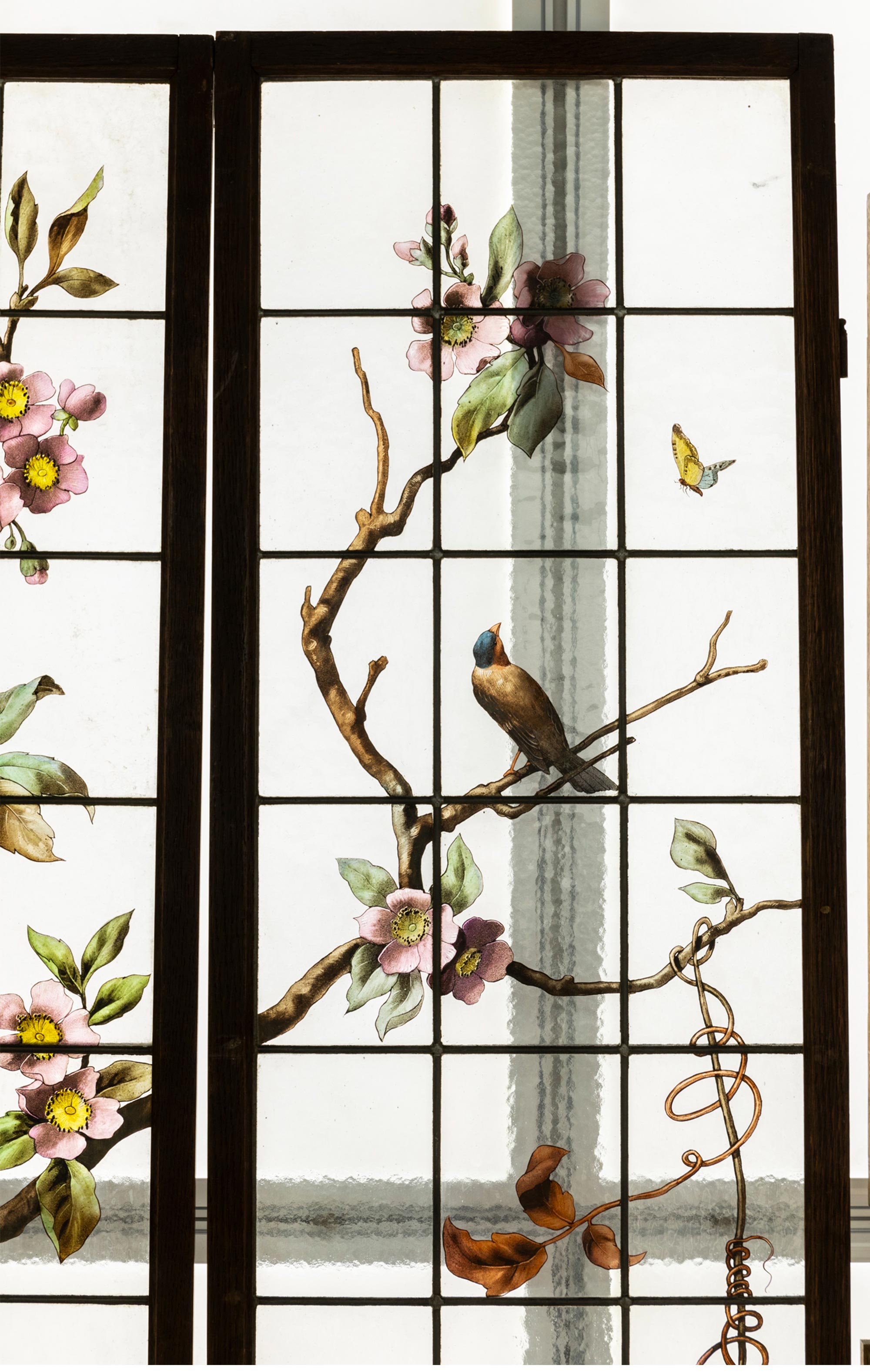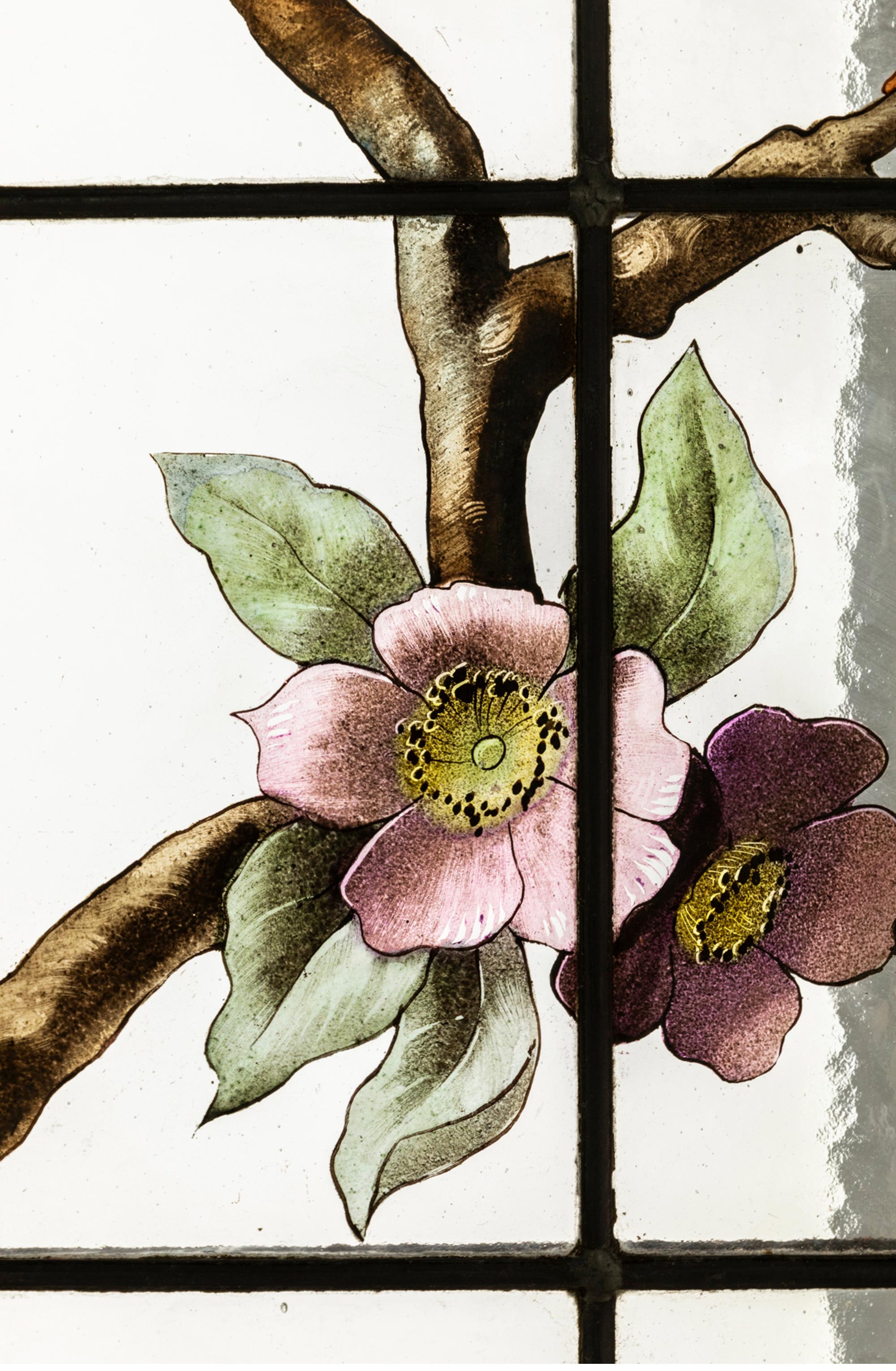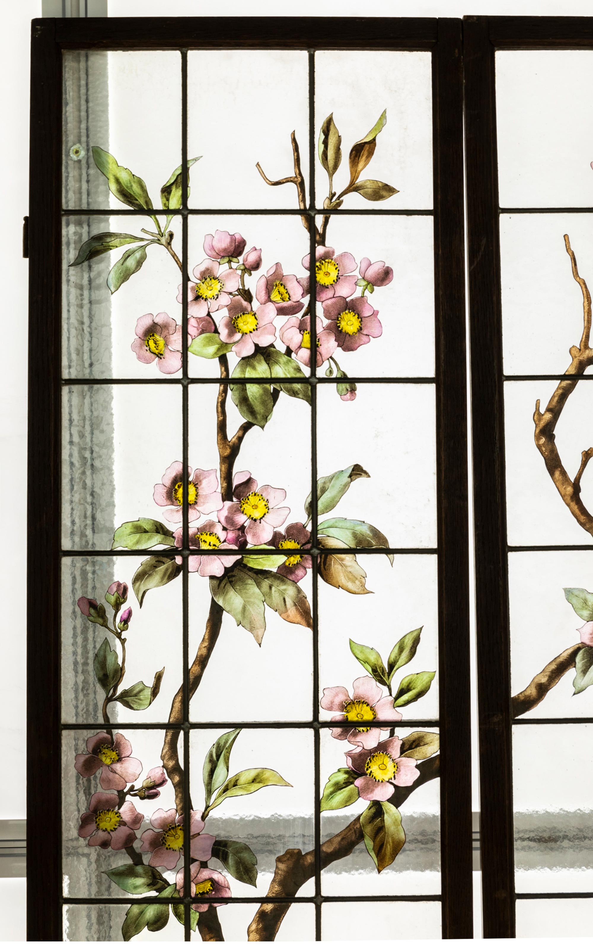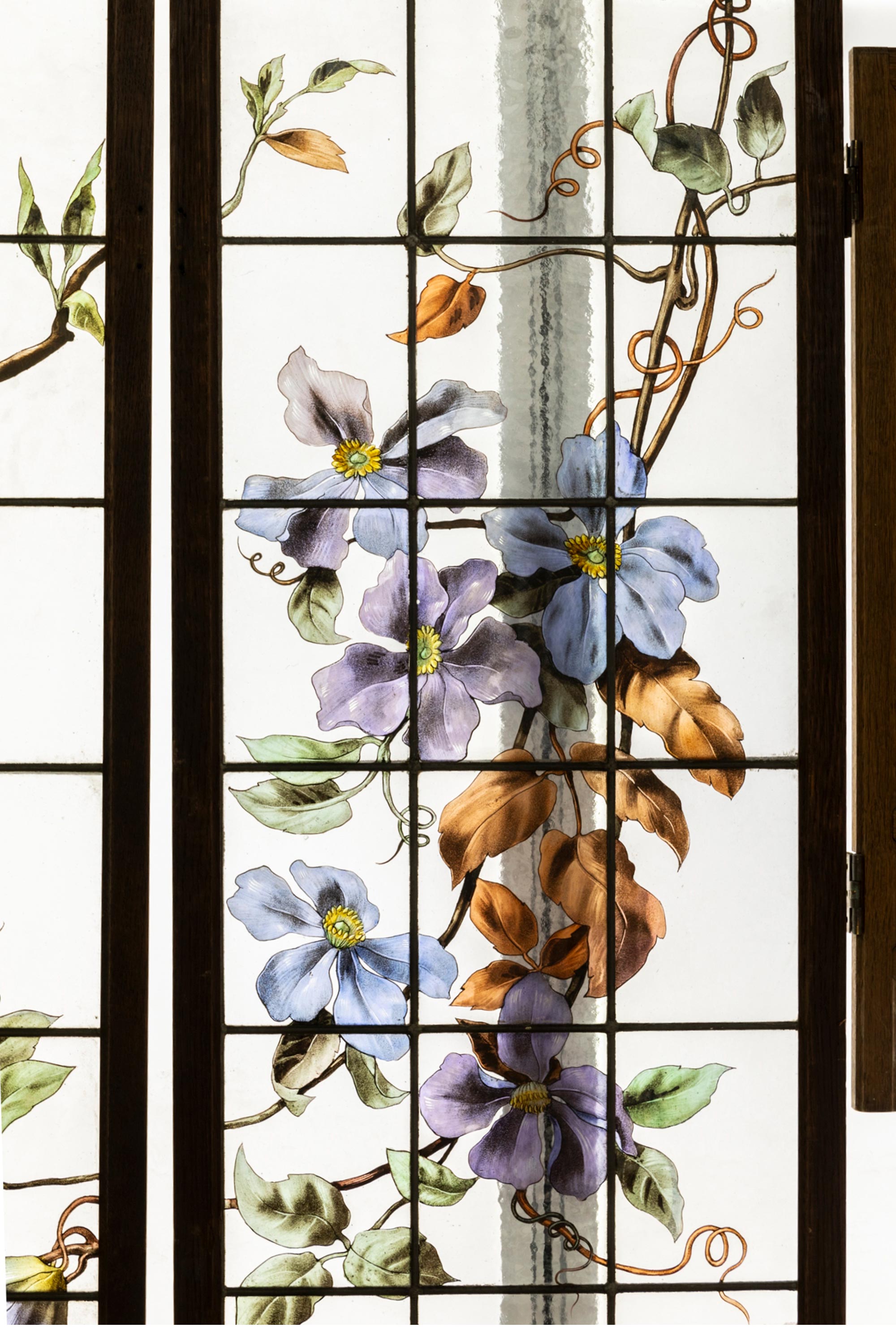 19世纪末法国新艺术时期出品水岸花开主题彩绘玻璃花窗一对