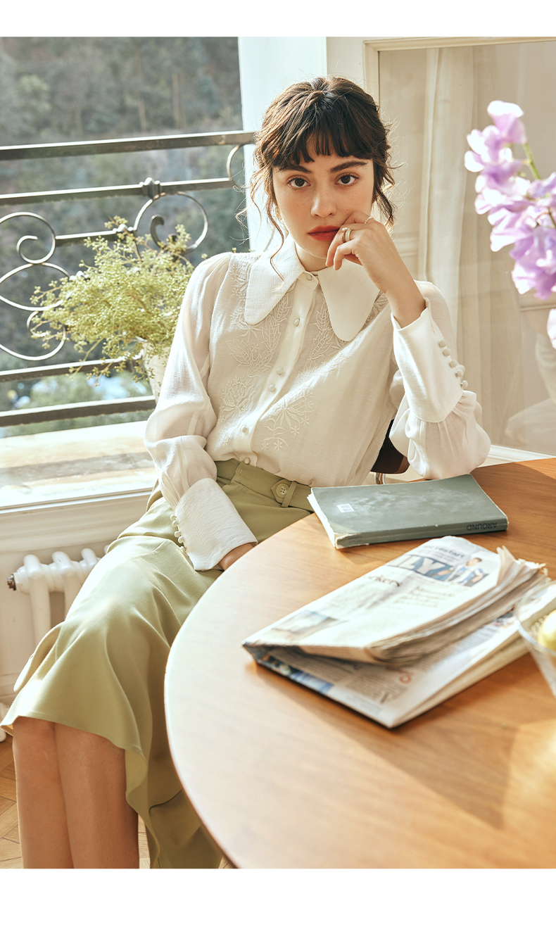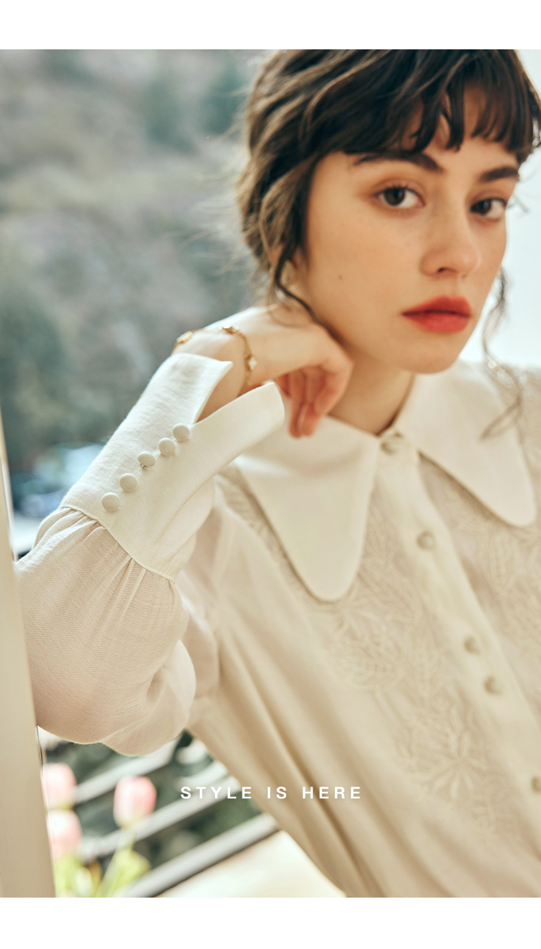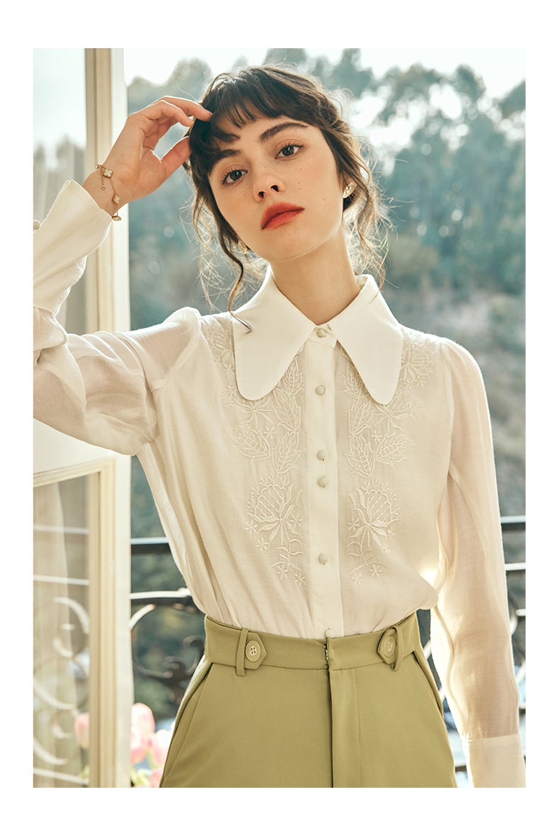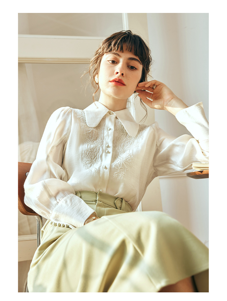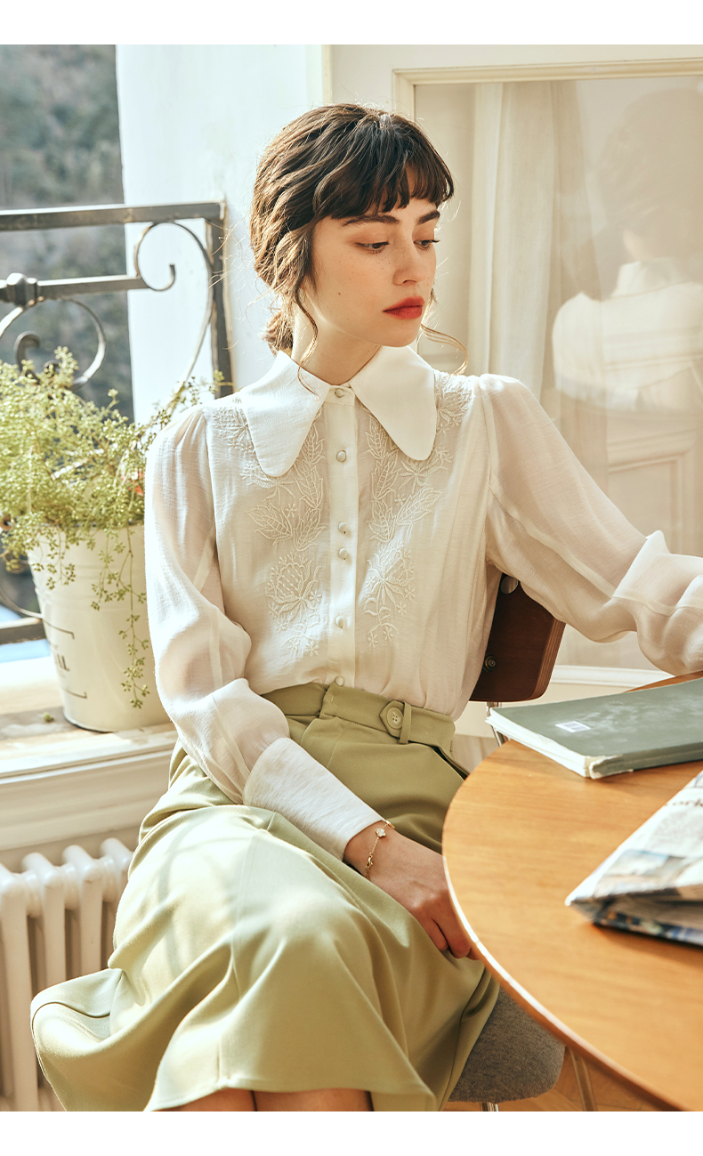 OLrain欧芮儿法式杏黄色蕾丝雪纺衫女春季2023年新款气质刺绣衬衣