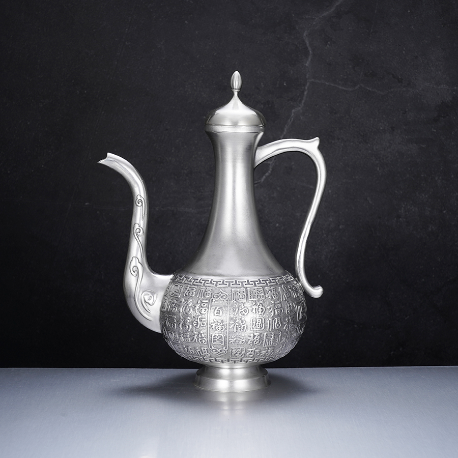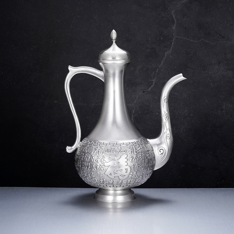 【寓意】:酒壶采“百福图”为创意,福字笔走龙蛇,韵味悠长。纯银福字酒壶,善纳酒气,巧引酒香,预兆财源广进,福随酒至。