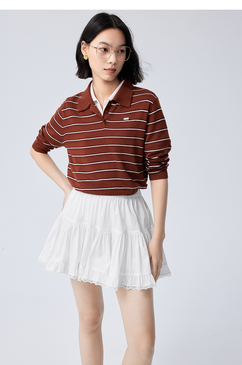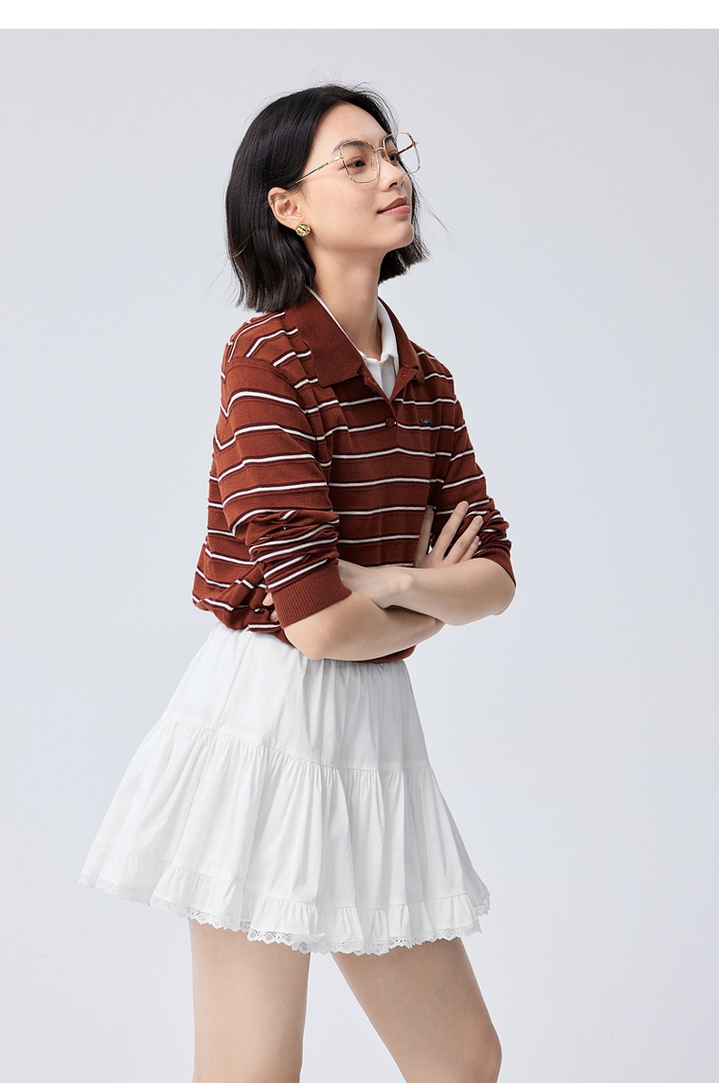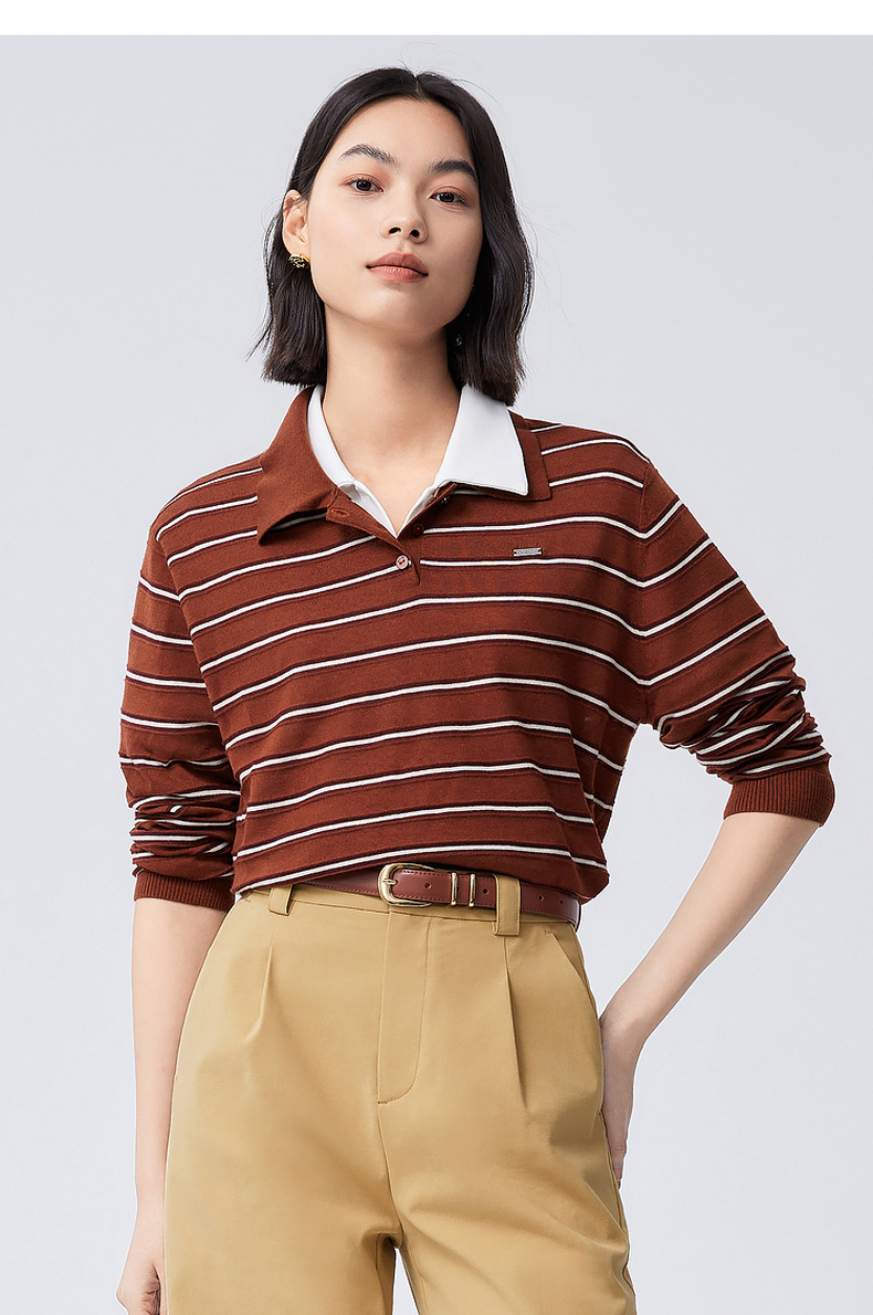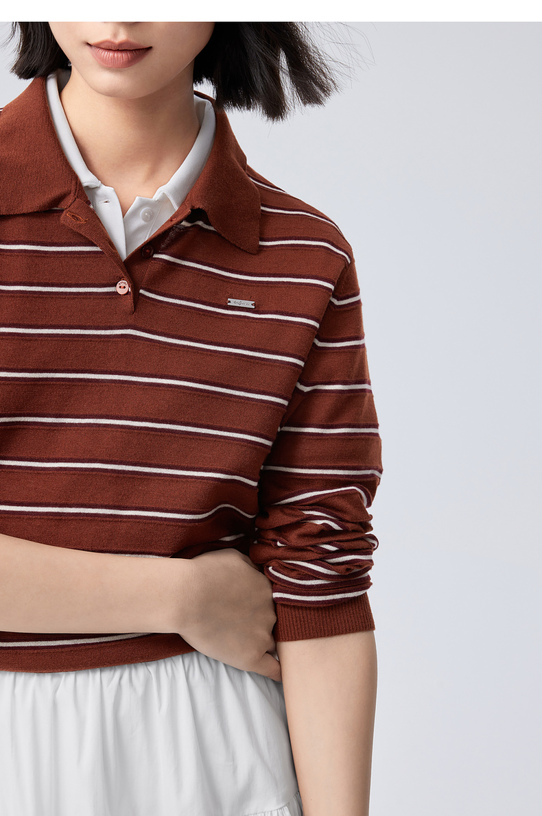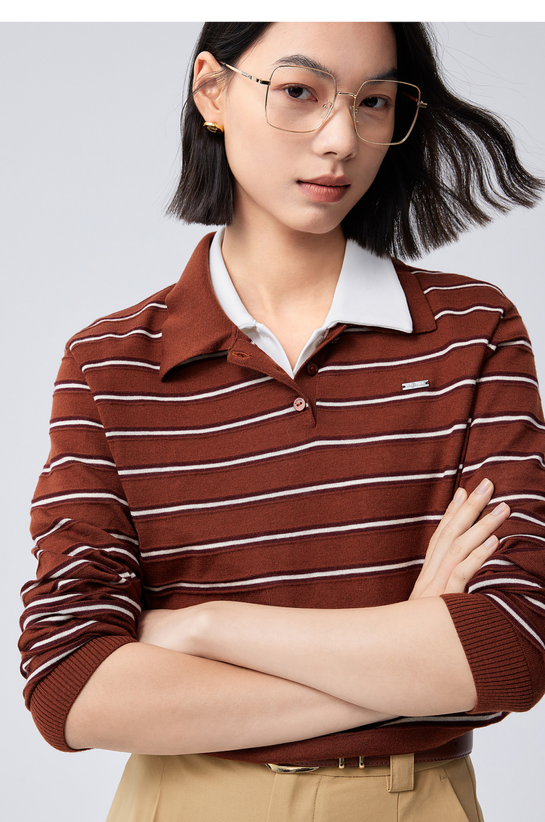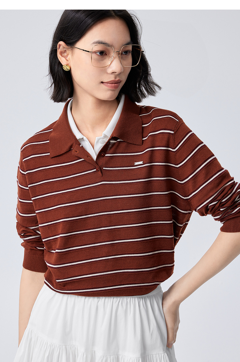 【严选】伊芙丽羊毛混纺POLO领条纹套头针织衫女2024秋装新款上衣1F7931521