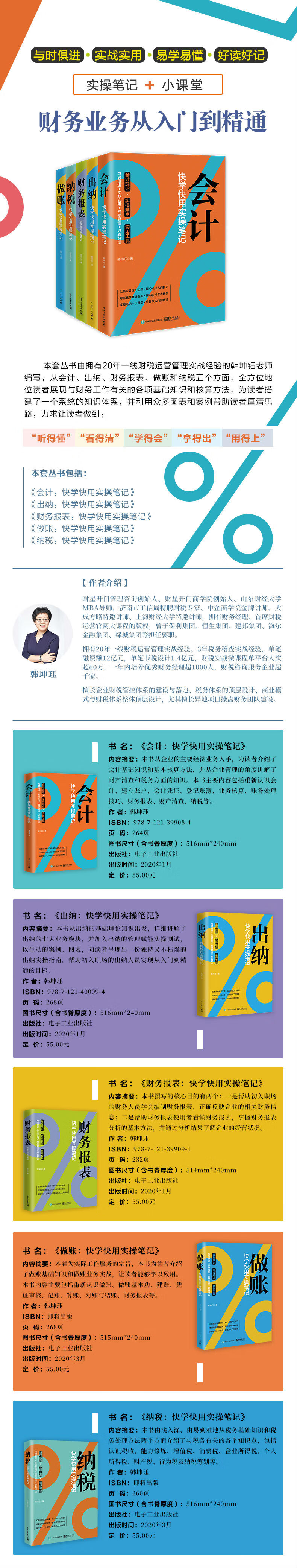 本套丛书由拥有20年一线财税运营管理实战经验的韩坤钰老师编写,从会计、出纳、财务报表、做账和纳税五个方面,全方位地位读者展现与财务工作有关的各项基础知识和核算方法,为读者搭建了一个系统的知识体系,并利用众多图表和案例帮助读者厘清思路,力求让读者做到“听得懂”“看得清”“学得会”“拿得出”“用得上”。本套丛书包括《会计:快学快用实操笔记》《出纳:快学快用实操笔记》《财务报表:快学快用实操笔记》《做账:快学快用实操笔记》《纳税:快学快用实操笔记》五本。