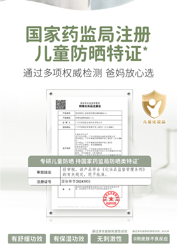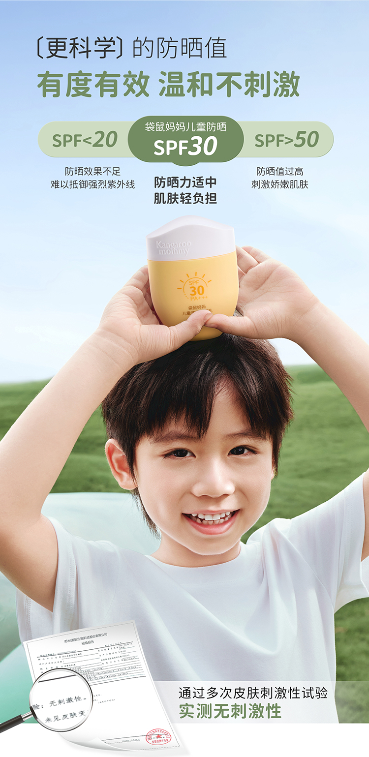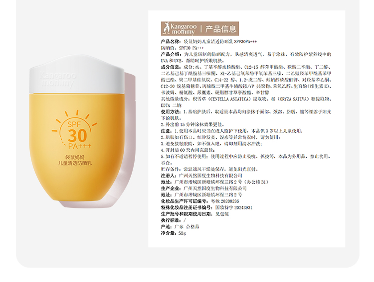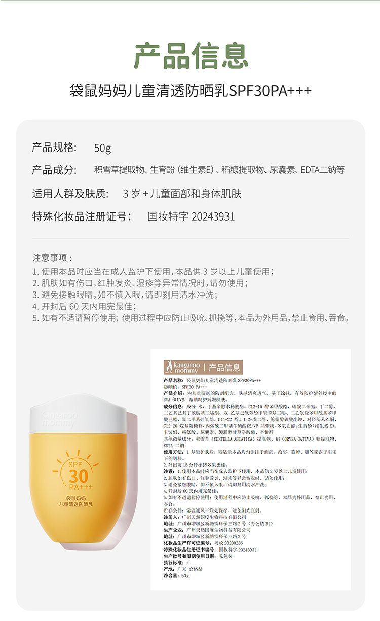 【儿童防晒乳】特证防晒 防晒红晒伤晒黑 袋鼠妈妈儿童清透防晒乳50g