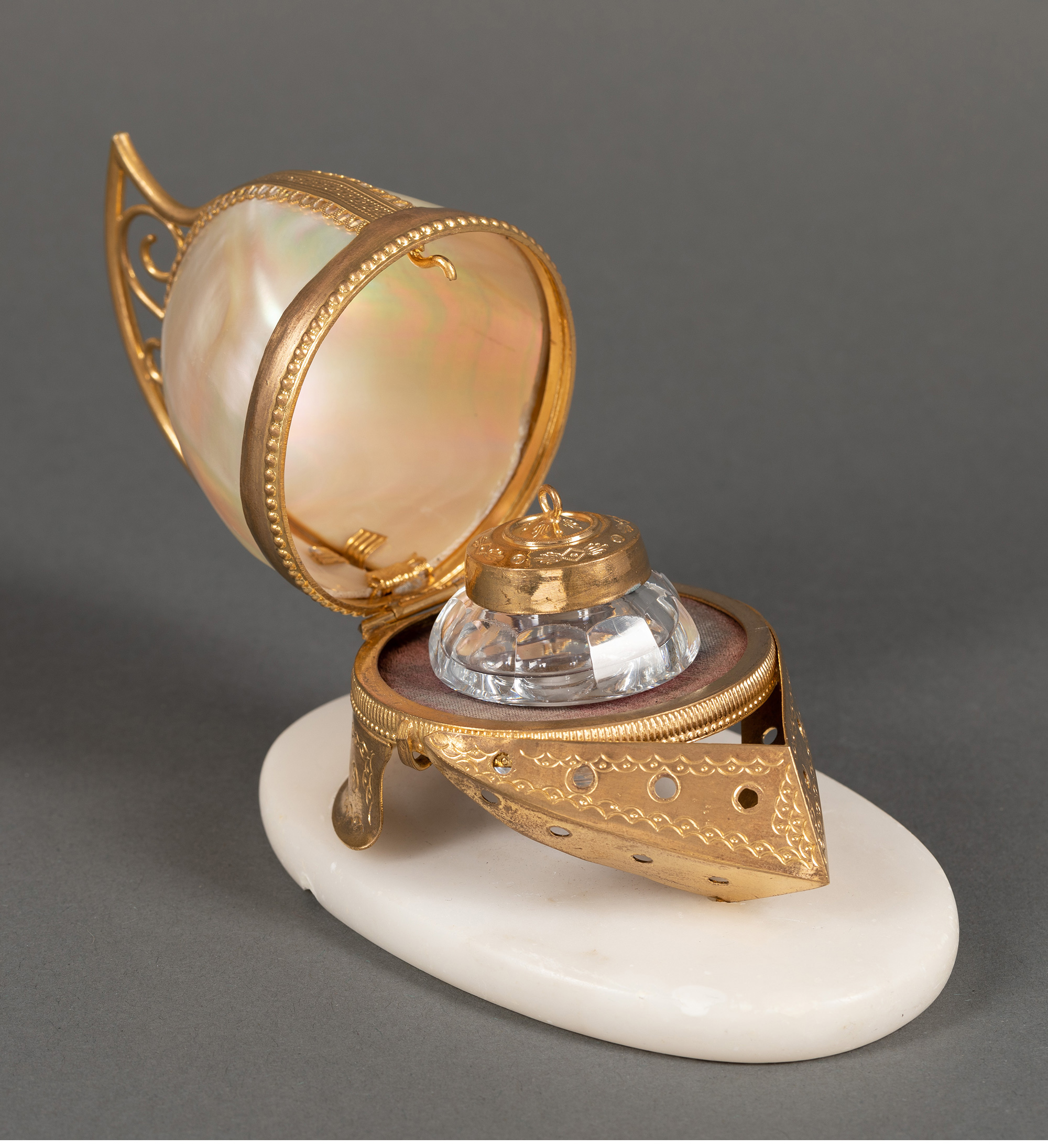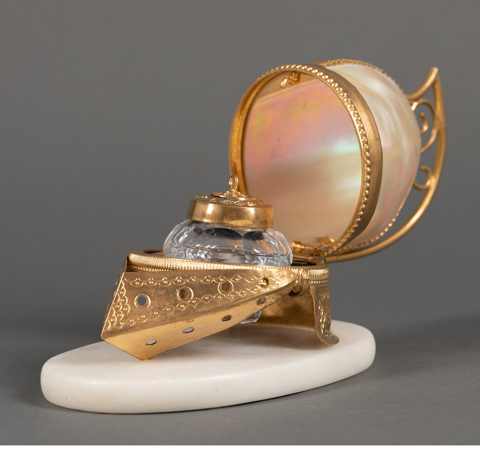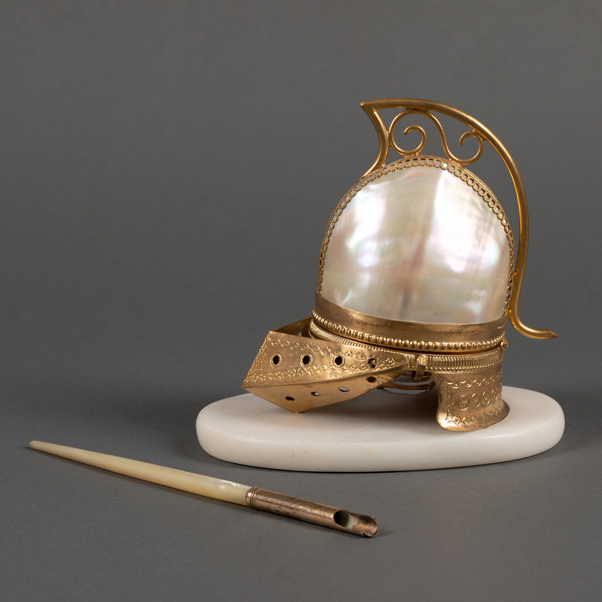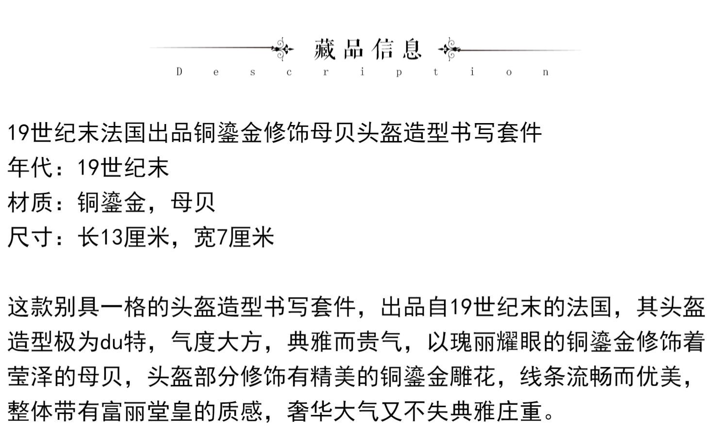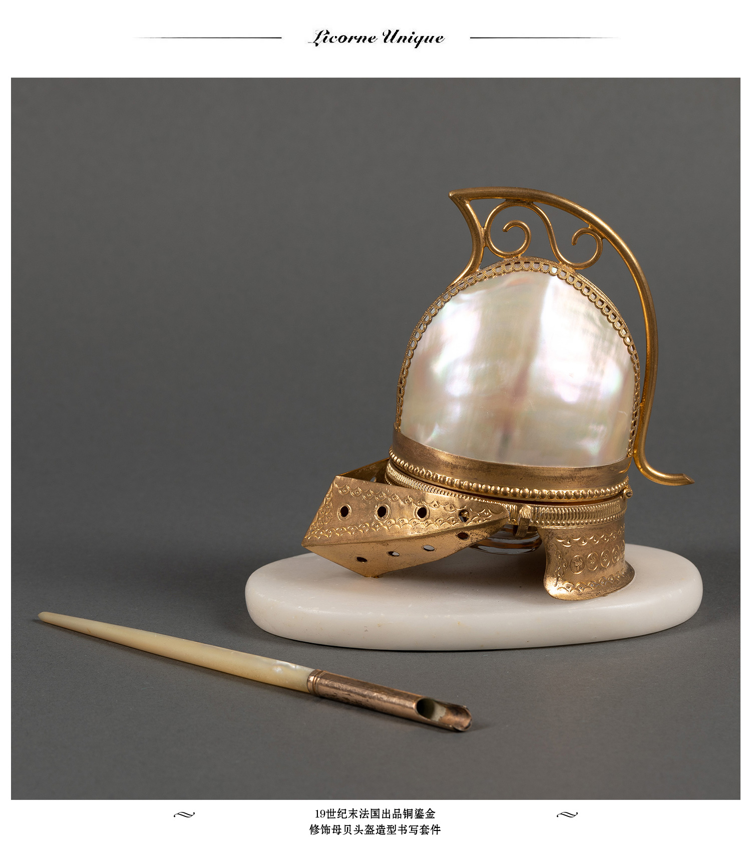独角鹿西洋古董法国铜鎏金修饰母贝头盔造型书写套件