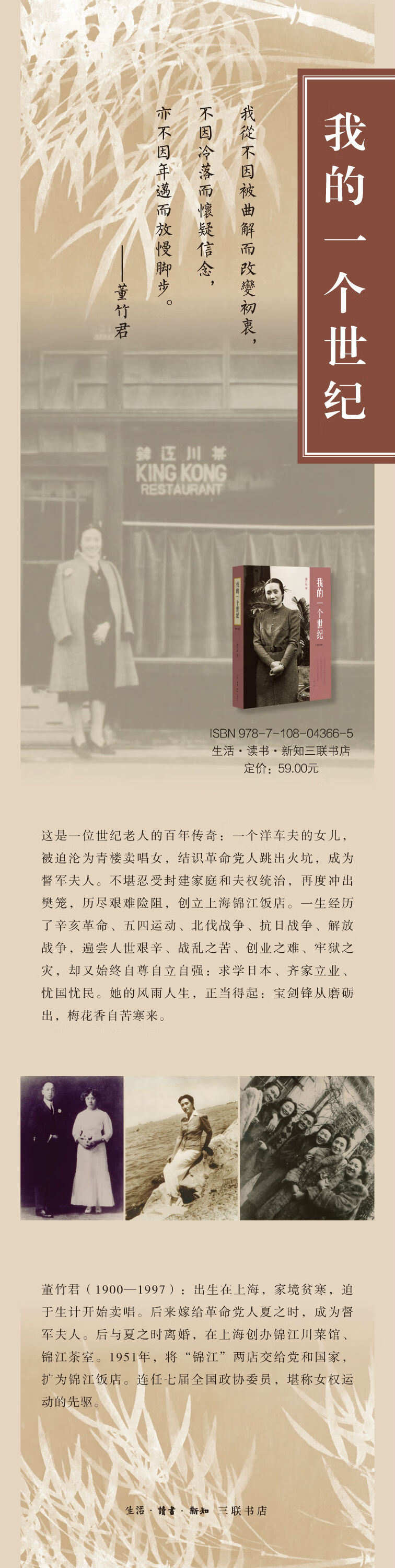 | 书 名:我的一个世纪(增订版) 书 号:ISBN 9787108043665 作 者:董竹君 著 出 版:生活·读书·新知 三联书店 版 次:2021年6月 规 格:16开 页 码:约633页 定 价:72元 |