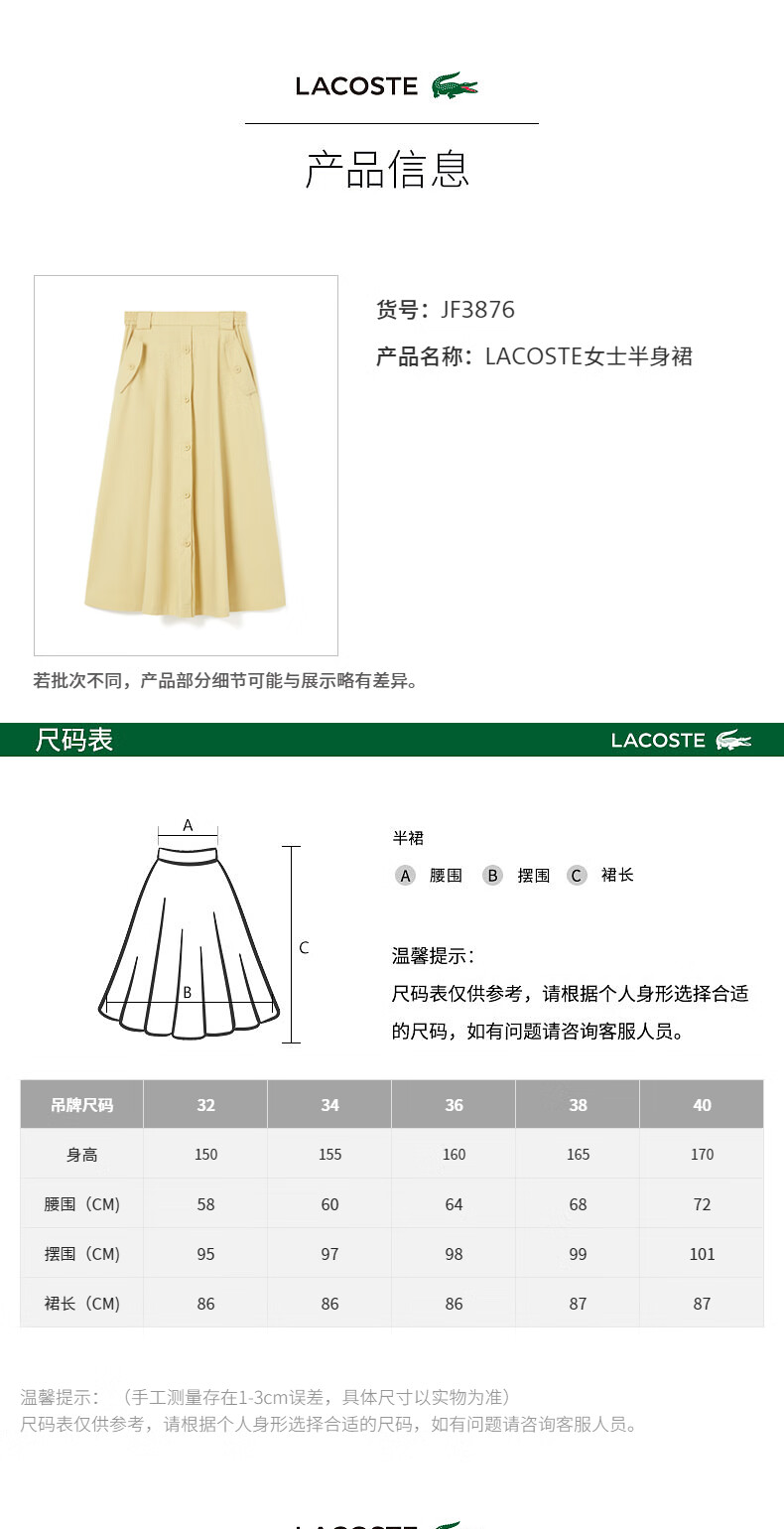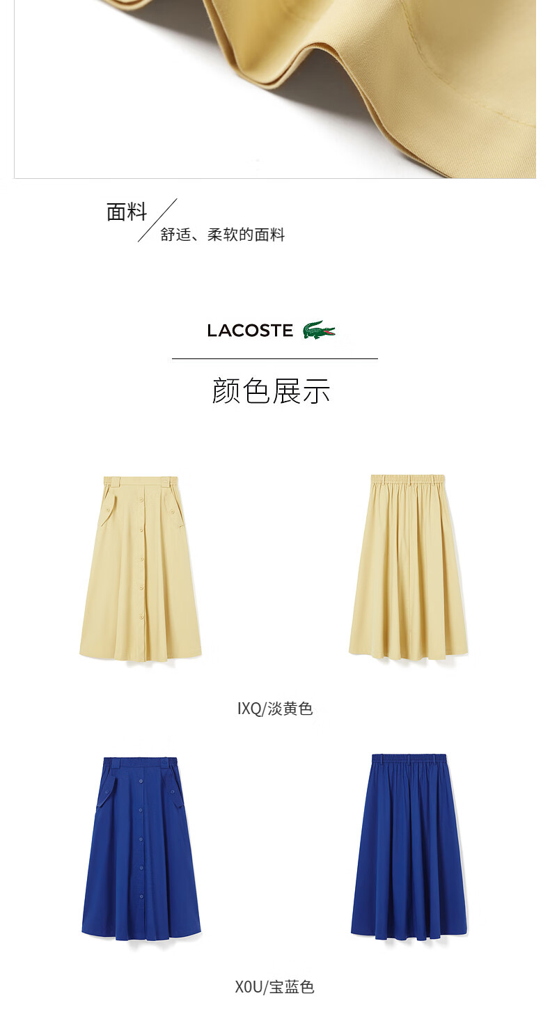 【海南专供价】Lacoste法国鳄鱼女装新款经典简约百褶半身裙裙子JF3876-98