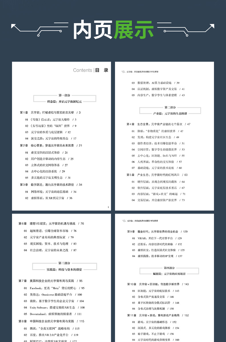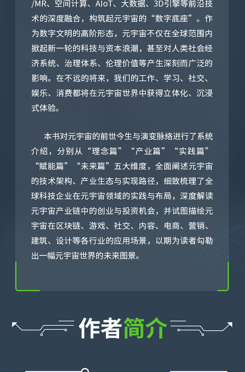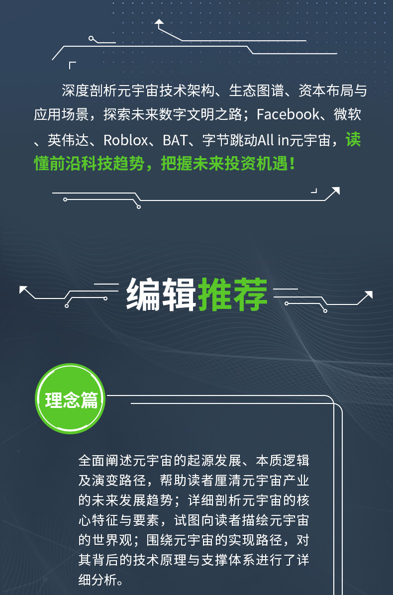 ◆理念篇:*阐述元宇宙的起源发展、本质逻辑及演变路径,帮助读者厘清元宇宙产业的未来发展趋势;详细剖析元宇宙的核心特征与要素,试图向读者描绘元宇宙的世界观;围绕元宇宙的实现路径,对其背后的技术原理与支撑体系进行了详细分析。