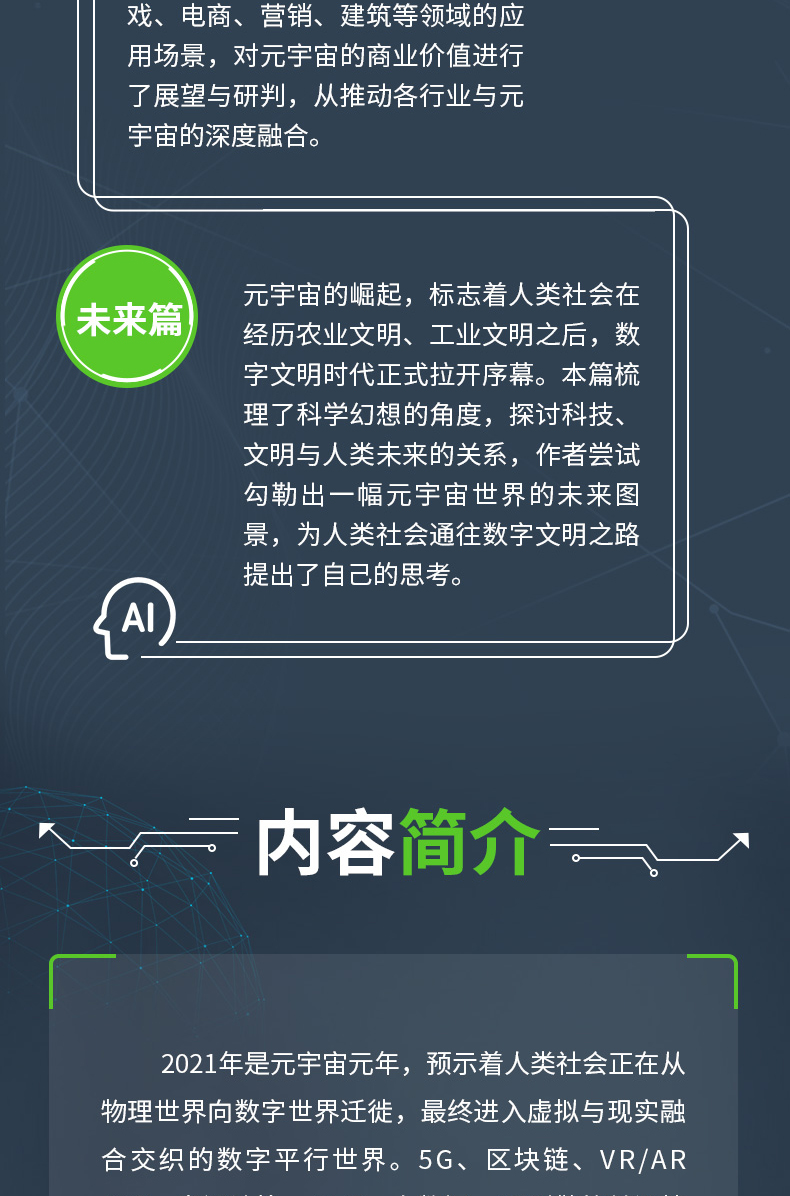 ◆未来篇:元宇宙的崛起,标志着人类社会在经历农业文明、工业文明之后,数字文明时代正式拉开序幕。本篇梳理了科学幻想的角度,探讨科技、文明与人类未来的关系,作者尝试勾勒出一幅元宇宙世界的未来图景,为人类社会通往数字文明之路提出了自己的思考。