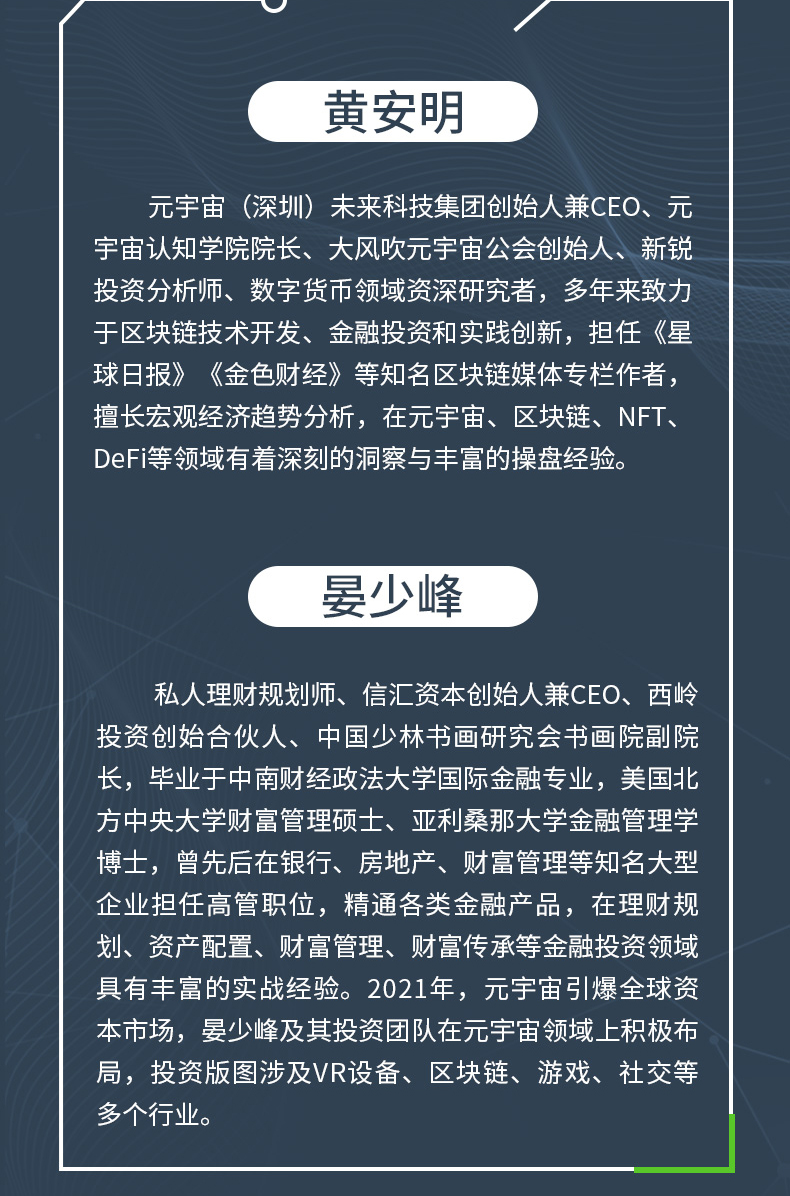 元宇宙(深圳)未来科技集团*兼CEO、元宇宙认知学院院长、大风吹元宇宙公会*、新锐投资分析师、数字货币领域*研究者,多年来致力于区块链技术开发、金融投资和实践创新,担任《星球日报》《金色财经》等知名区块链媒体专栏作者,擅长宏观经济趋势分析,在元宇宙、区块链、NFT、DeFi等领域有着深刻的洞察与丰富的实践经验。