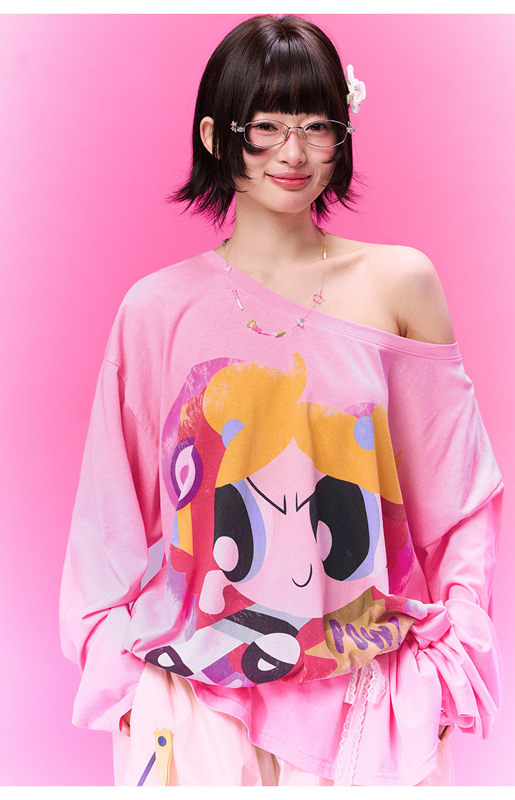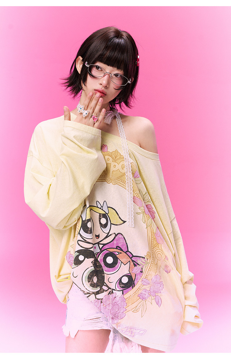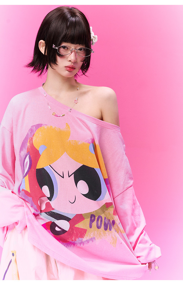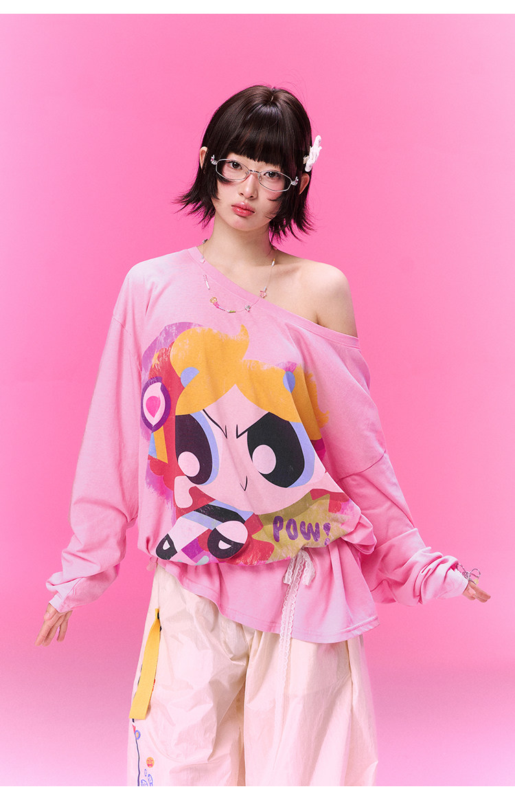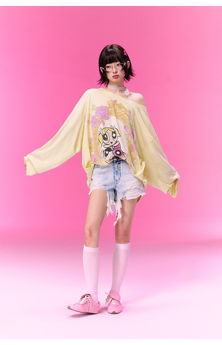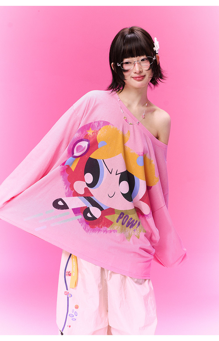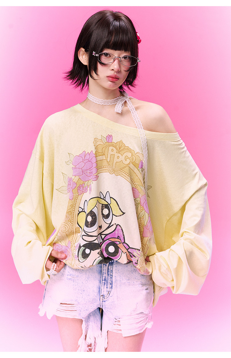 飞天小女警联名BJHG不计后果 长袖T恤罩衫女款夏季可外穿斜肩上衣