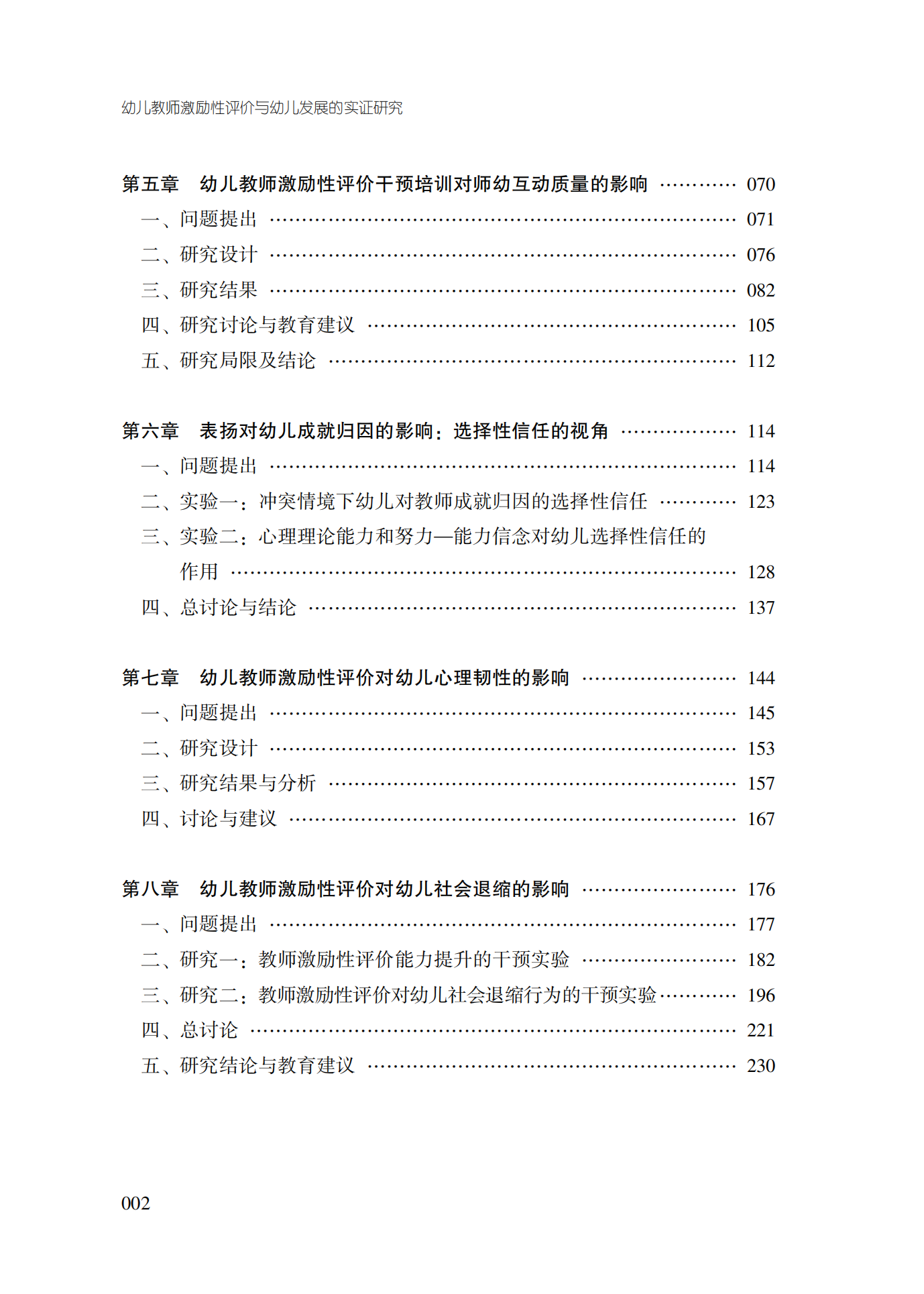 第四至八章,作者依次对幼儿教师激励性评价的影响因素(职业承诺和职业倦怠、干预培训)、激励性评价如何促进幼儿发展(成就归因、心理韧性、社会退缩)进行了研究,并对研究结果进行了分析和讨论,提出了有针对性的教育建议。