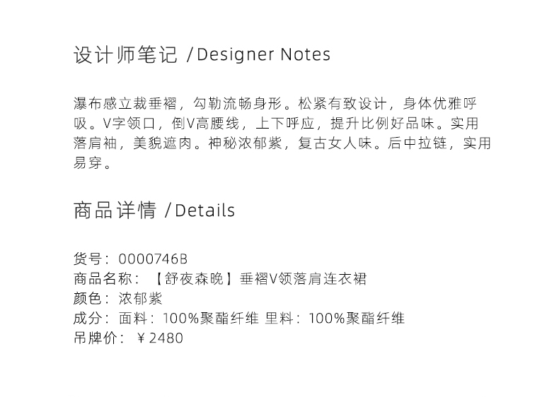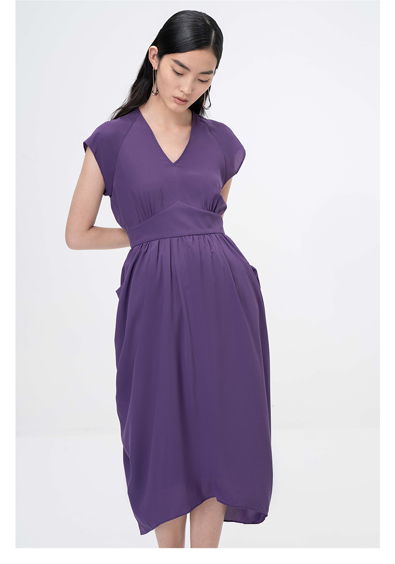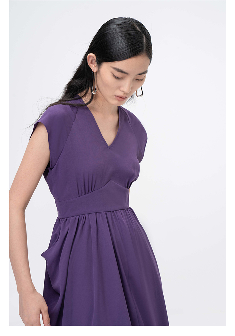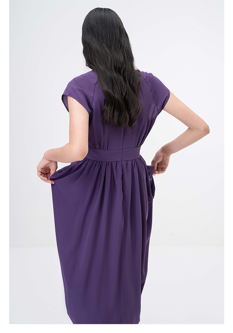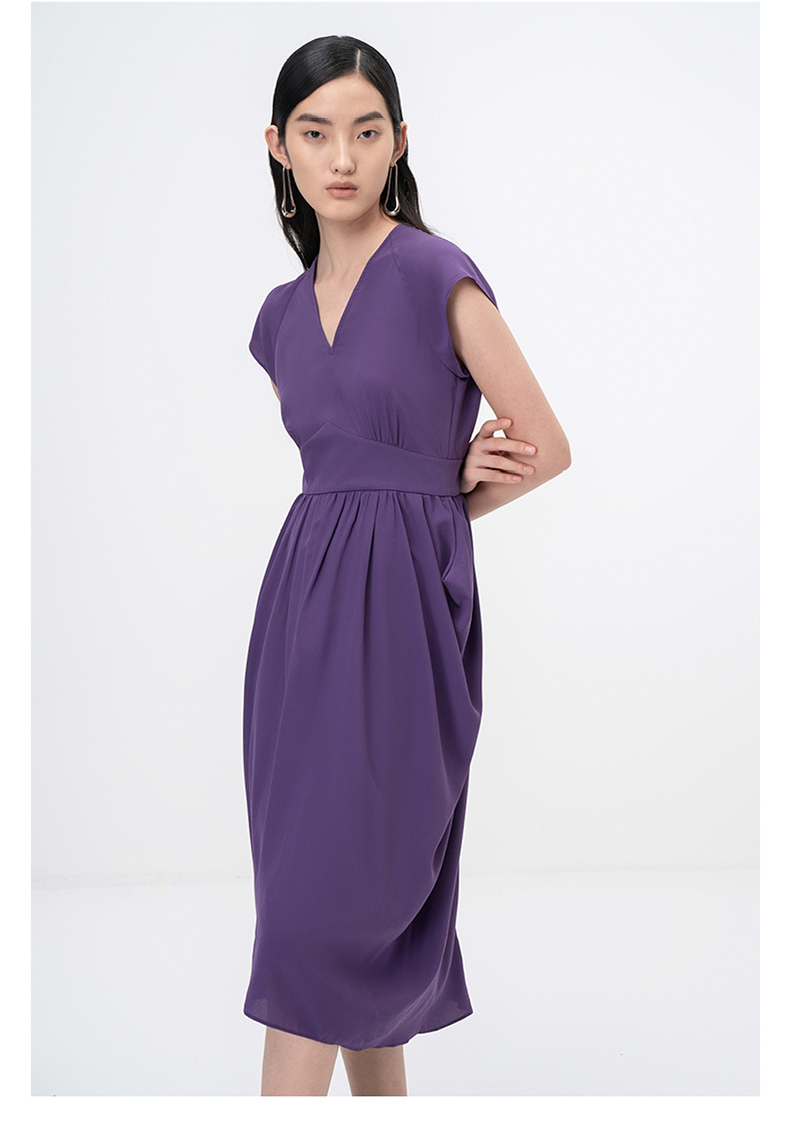 【舒夜森晚】浓郁紫立裁垂褶V领落肩收腰连衣裙/0000746B