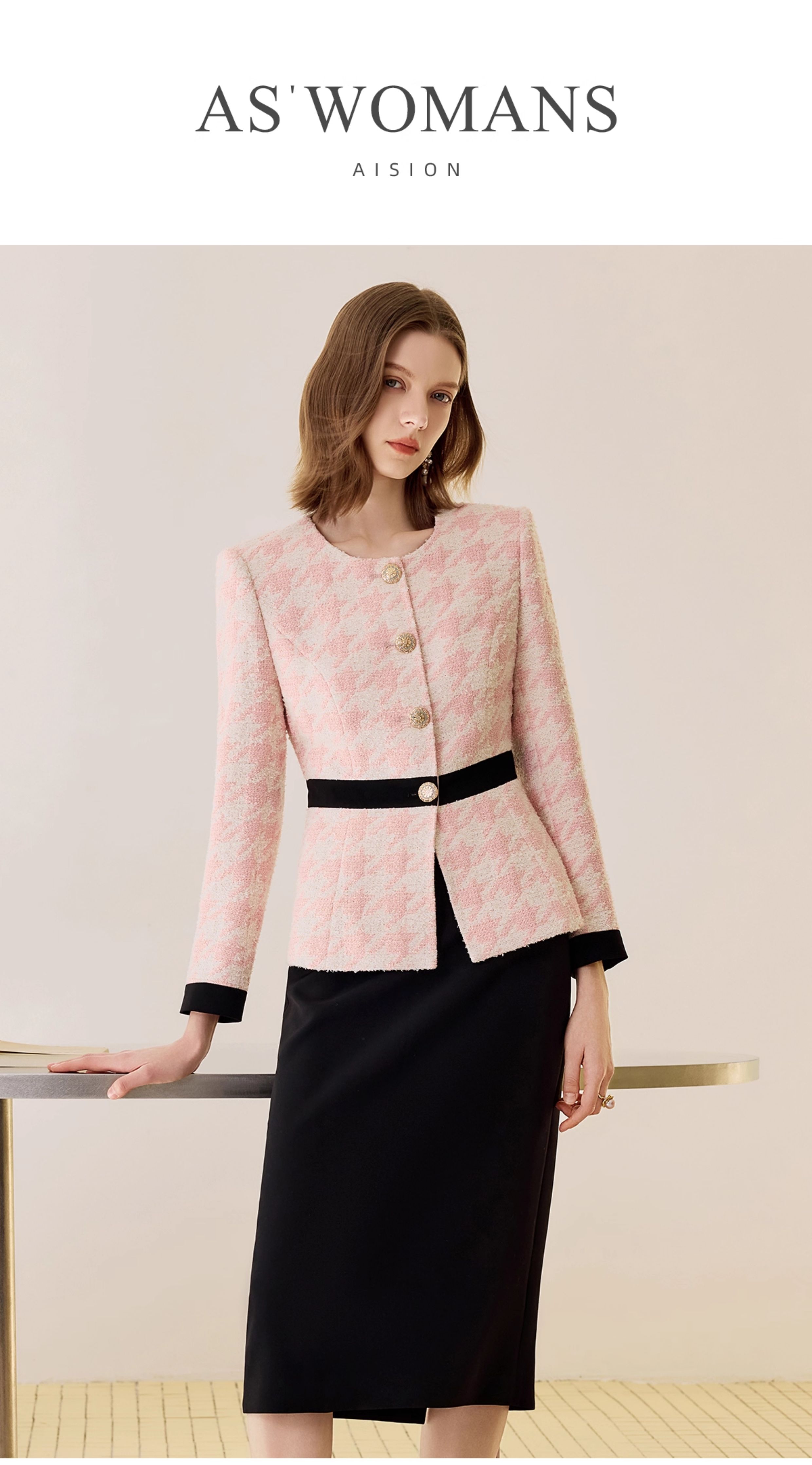 IWY/职业套裙女粉色千鸟格小香风西装套装轻奢女神范撞色高级感秋冬外套25C842+WS0128