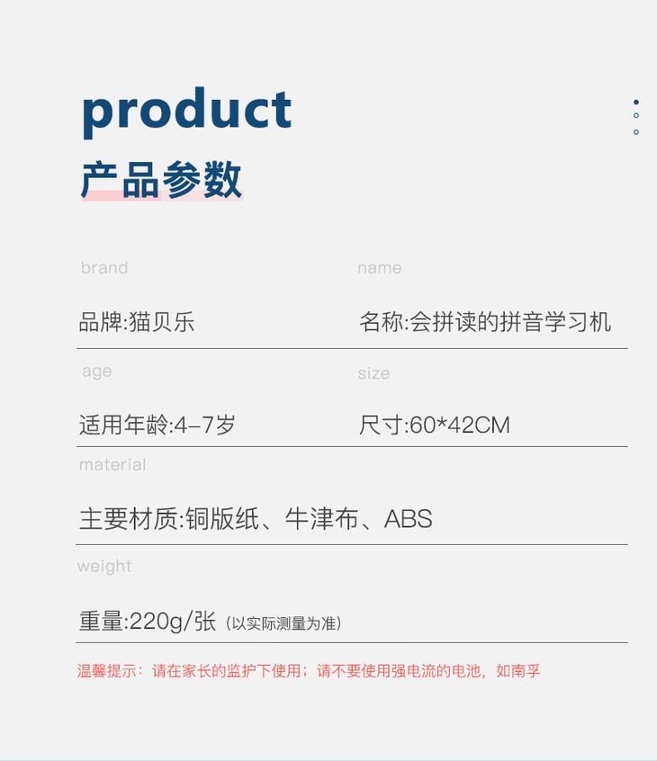 质量很好,没有味道,包装是比较高级的盒子,发音很准确 2020.12.09 解释:【一条来自巧连智的感谢信】亲,非常感谢您,在茫茫天猫店中选择了我们家,我们的产品都是采用环保材质生产加工而成的,我们精心挑选每一个内容,每一个配图,严格把控每一道工序,只为给宝宝最好的,我们一直注重顾客的体验和产品效果,根据宝宝早期特点,有针对性的去开发产品,挑选色彩鲜艳,比较容易吸引宝宝的注意力,产品的功能也相当丰富,可以满足宝宝的学习早教,非常适合宝宝的启蒙教学,还可以做到寓教于乐,让宝宝在玩耍中进行学习,锻炼宝宝的思维,拒绝*记硬背的学习方法,通过标准的发音,让宝宝可以边听边看,形象的画面加深宝宝的印象,功能按键也是很实用的,每一款产品都有不同的功能键,点读方式还可以增强宝宝与大人之间的交流互动,体验更好的亲子时光。能够得到您的认可,我们倍感荣幸,再次感谢您的光临,如果您在使用过程中有什么问题也可直接联系我们的在线客服进行咨询,我们会为您提供一个愉快的购物体验,祝您生活愉快,宝宝健康成长~ | 颜色分类:四声拼音全拼学习机+拼音识字卡(230)套装 | w***z(匿名) |