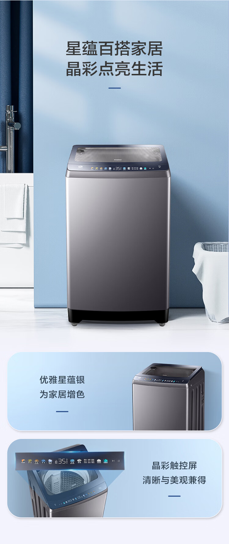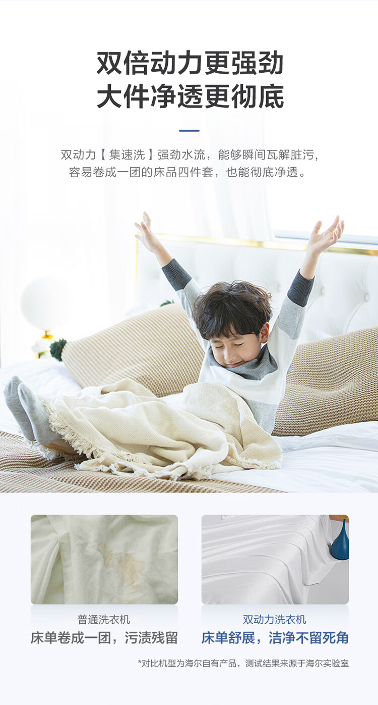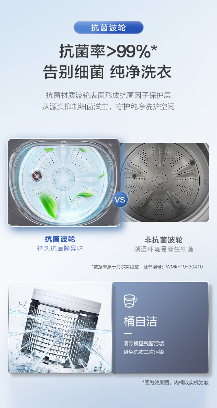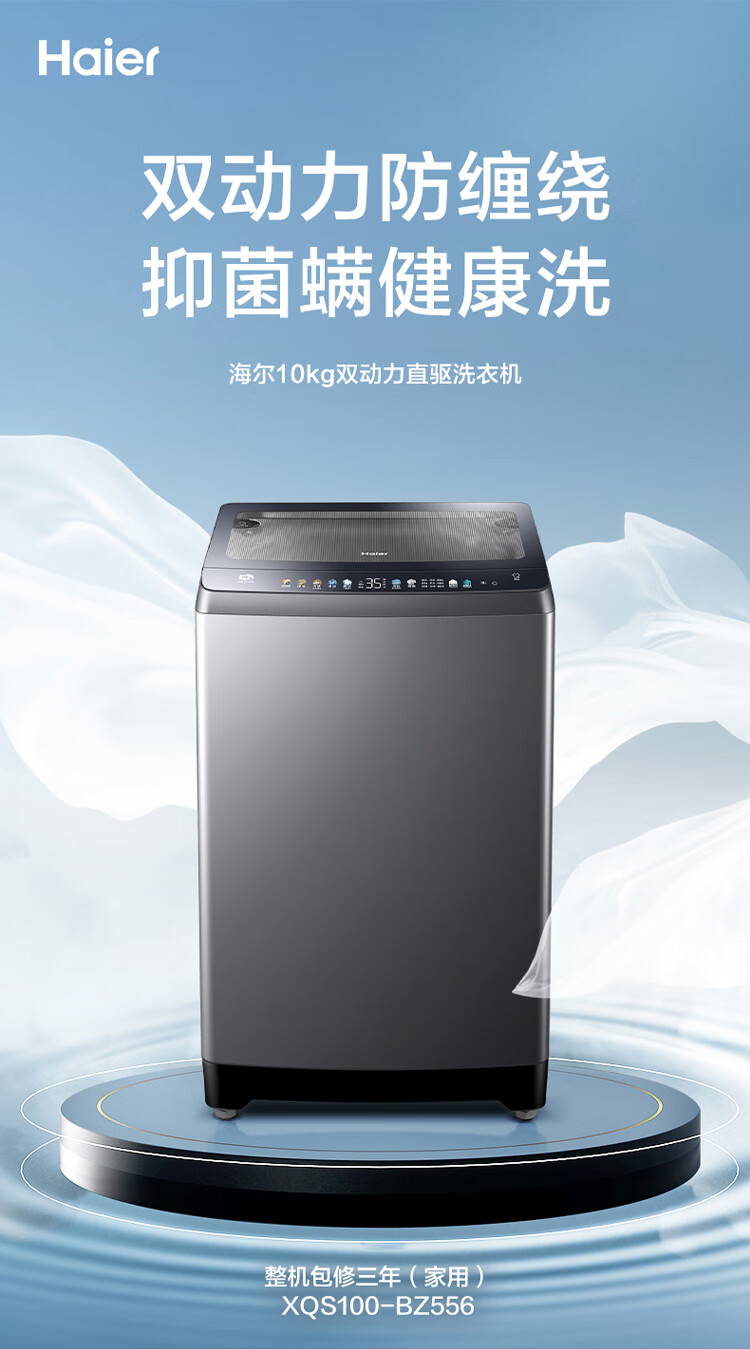 海尔(Haier)10公斤 波轮洗衣机 变频全自动 双动力系列 晶彩触控大屏 高洗净比 玻璃盖XQS100-BZ556