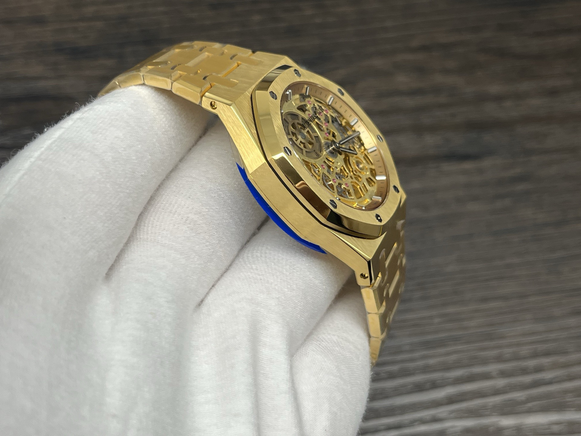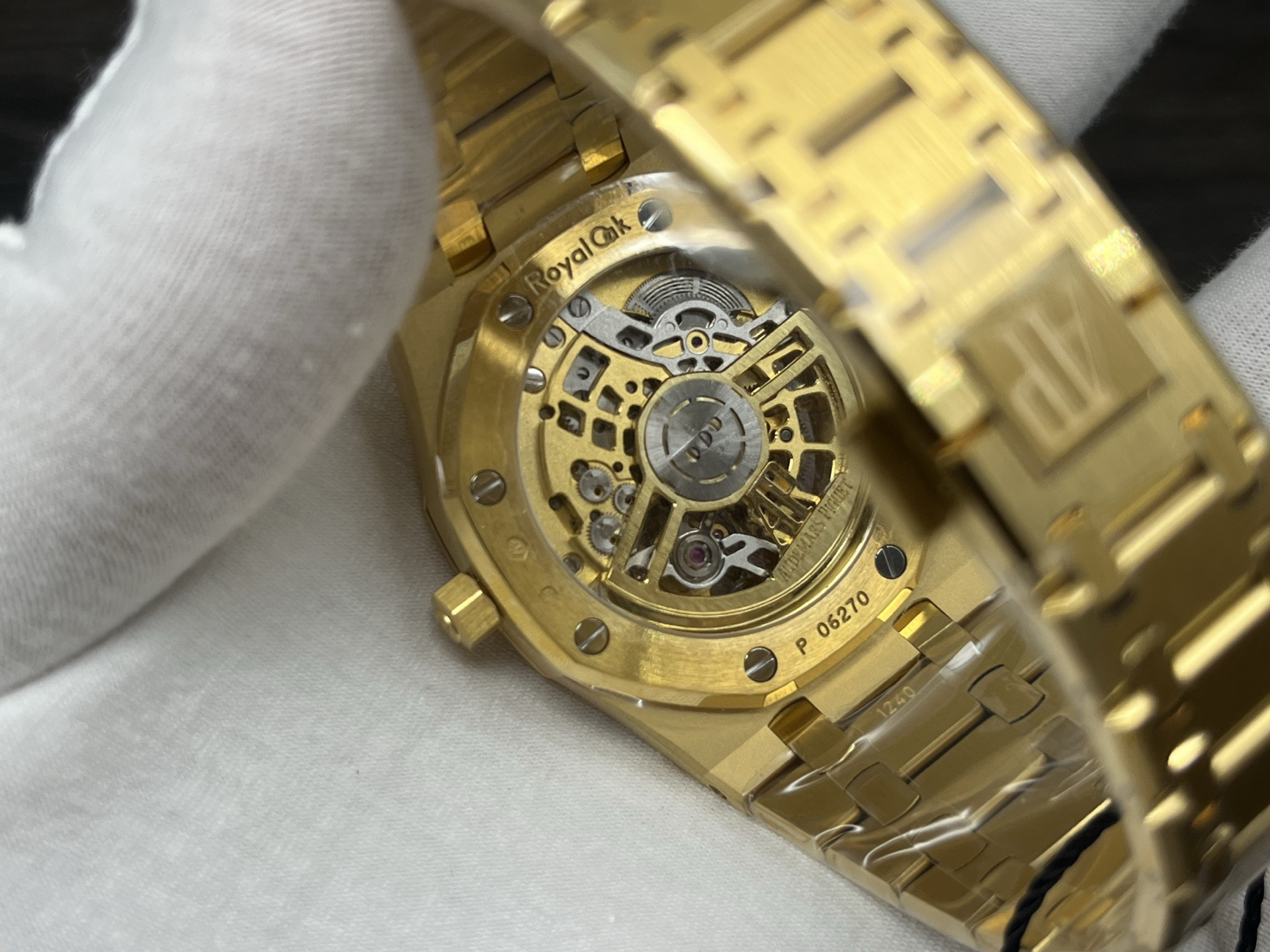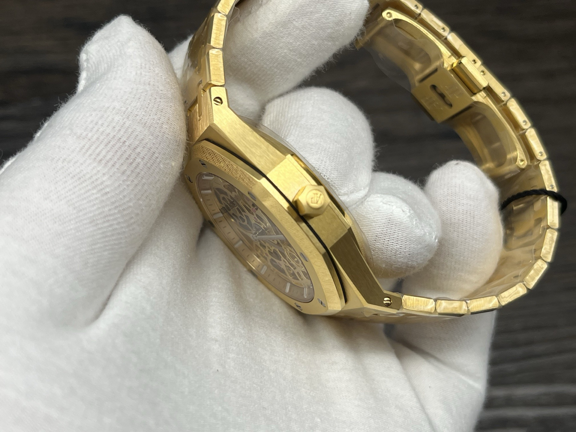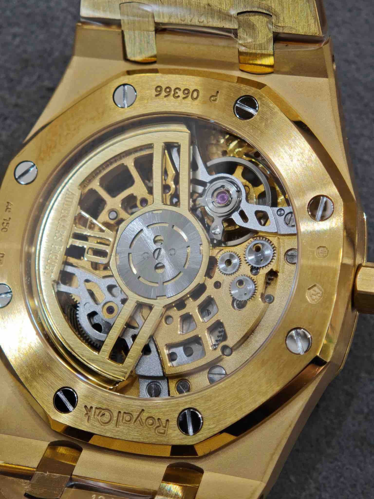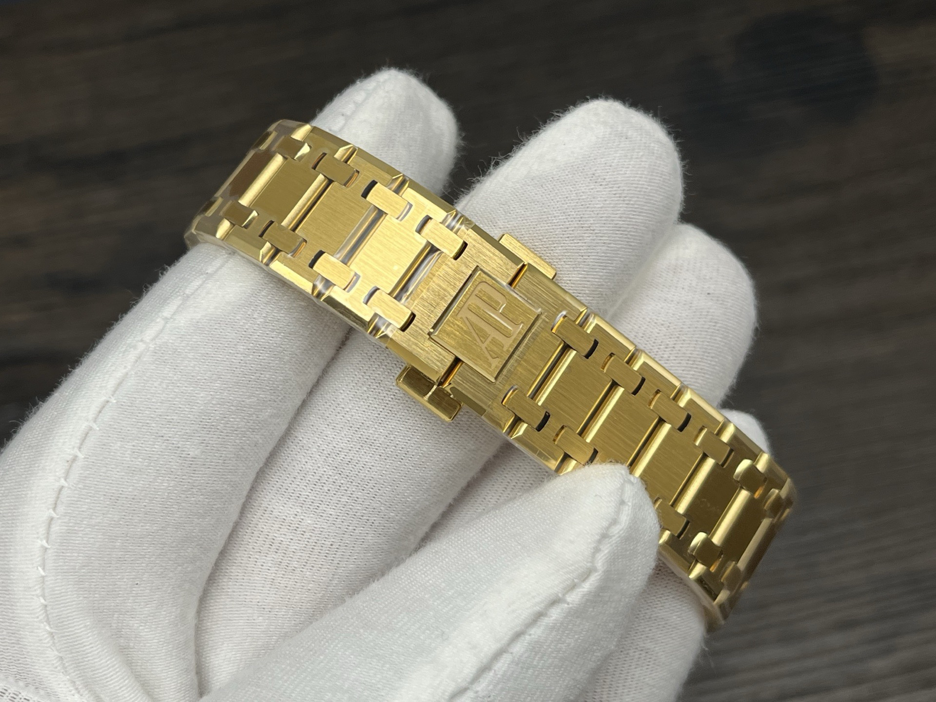 The highly recognizable octagonal 39MM case adopts advanced CNC machining technology to preliminarily cut and shape the stainless steel raw materials, and then uses exquisite wire drawing technology and forging surface polishing treatment to perfectly interweave on the case, presenting a unique luster and texture. The watch strap links are also produced through multiple complex polishing processes, making the surface of the links delicate, tightly connected, and flexible. Ensure comfort and fit when wearing. The AP logo on the watch buckle is finely carved, with clear lines and a three-dimensional steel structure. On the side of the case, the lugs naturally connect with the strap, creating a smooth transition and showcasing a harmonious beauty that is seamlessly integrated!