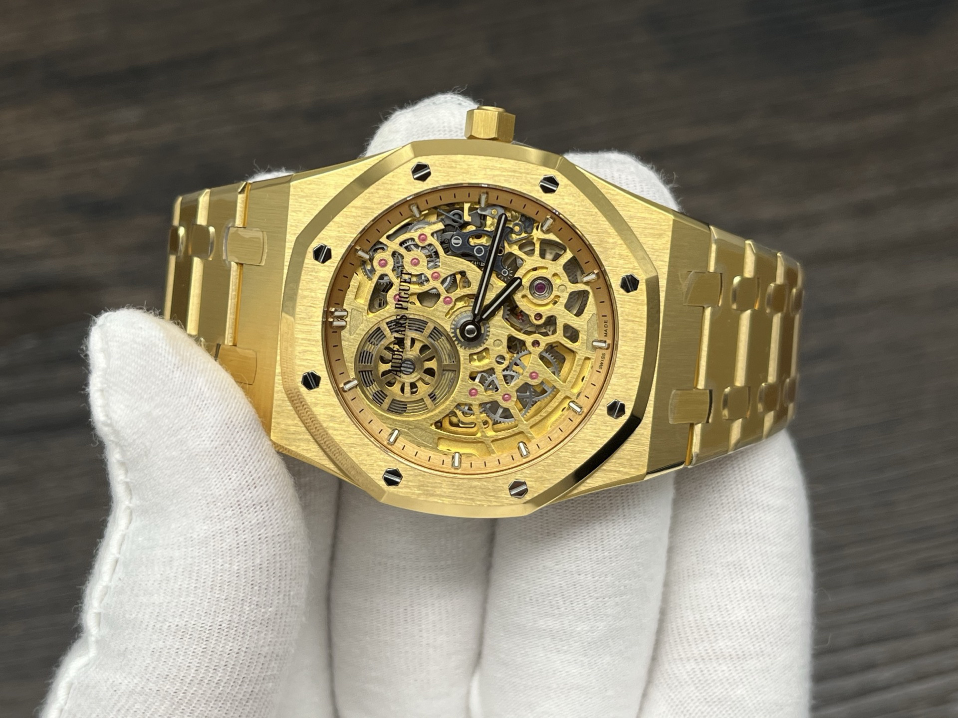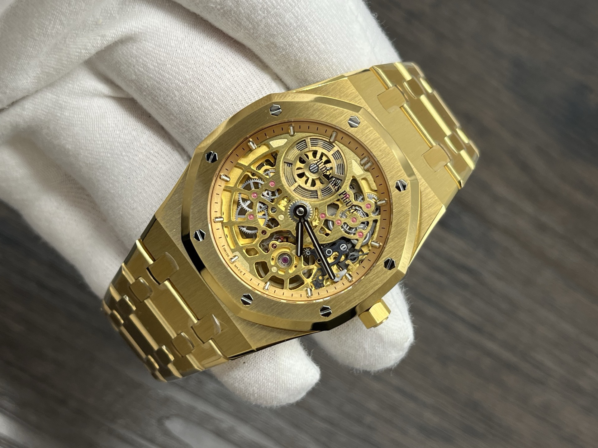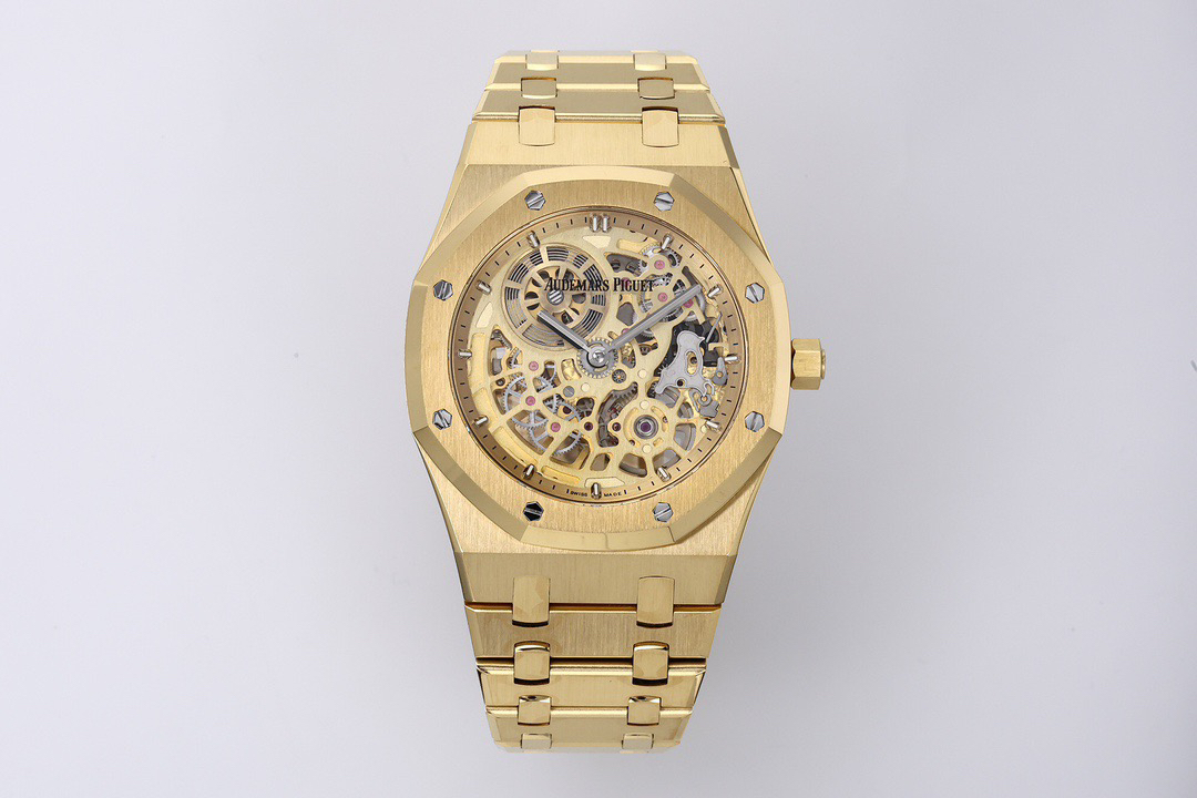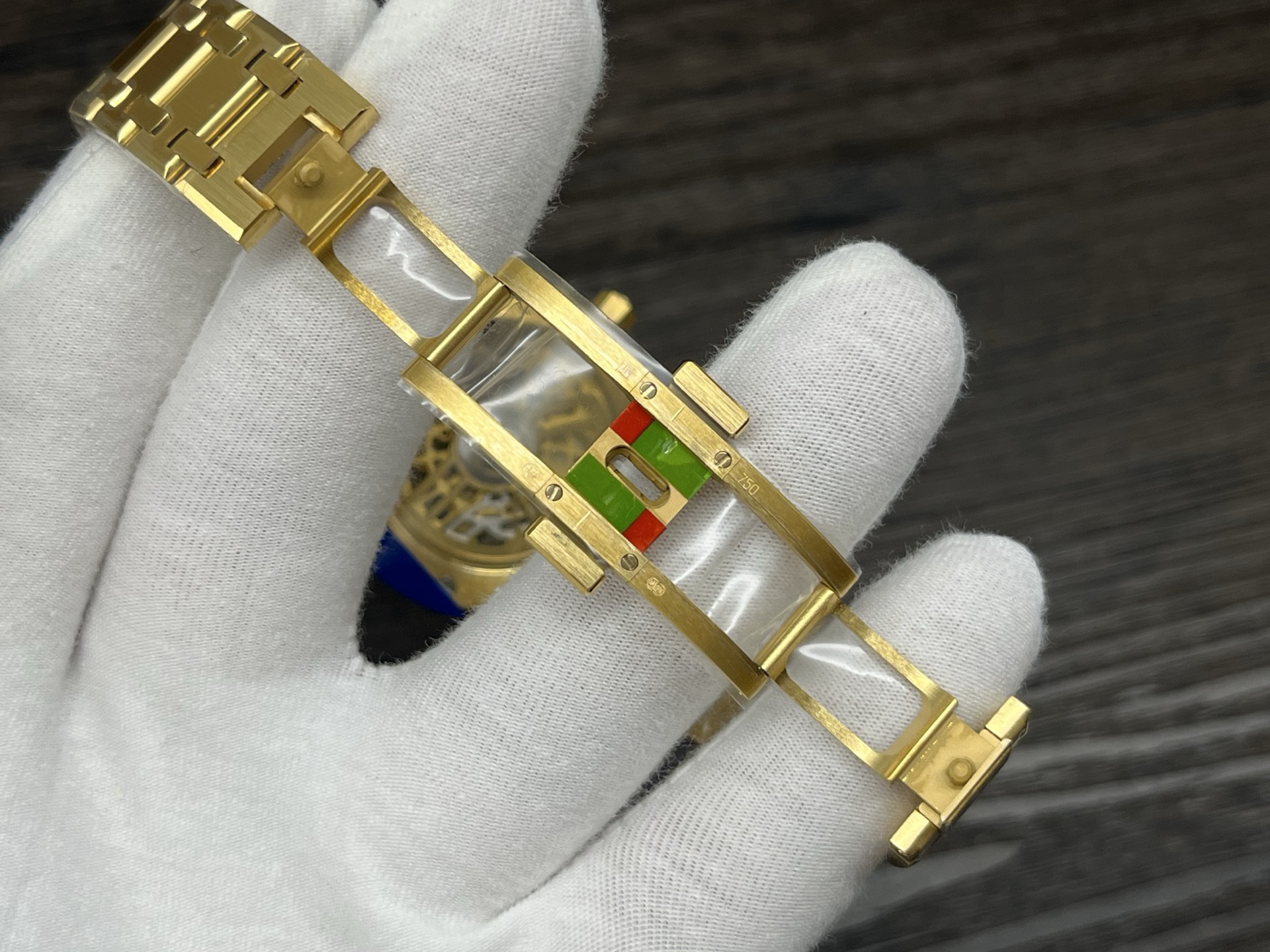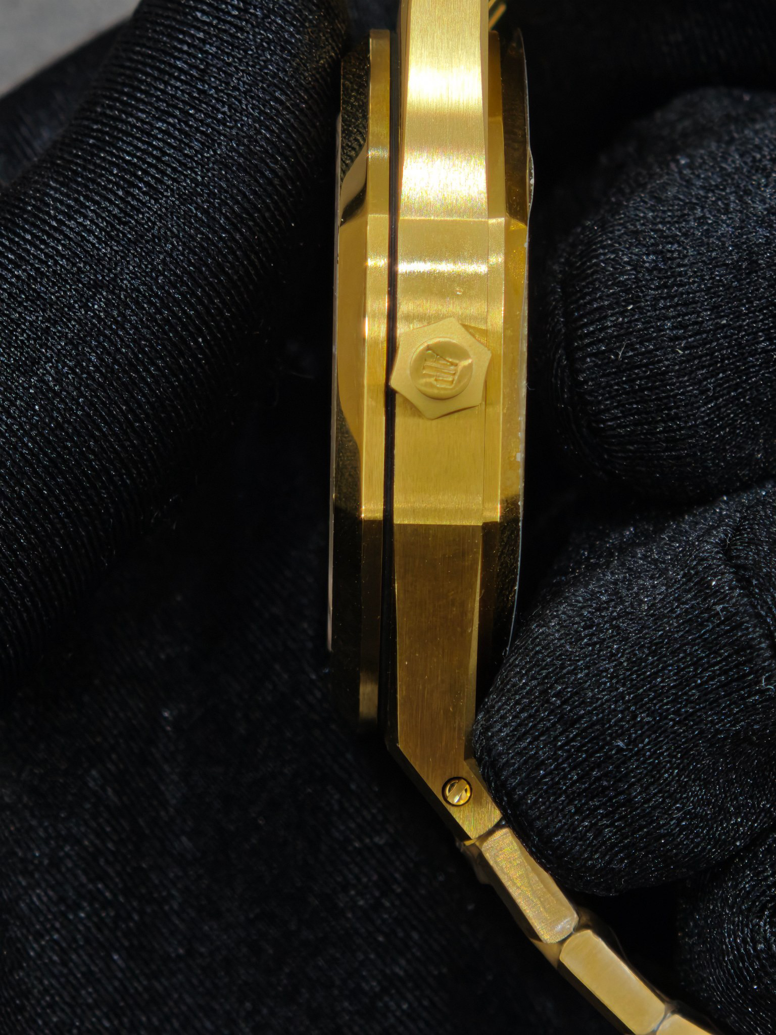 The highly recognizable octagonal 39MM case adopts advanced CNC machining technology to preliminarily cut and shape the stainless steel raw materials, and then uses exquisite wire drawing technology and forging surface polishing treatment to perfectly interweave on the case, presenting a unique luster and texture. The watch strap links are also produced through multiple complex polishing processes, making the surface of the links delicate, tightly connected, and flexible. Ensure comfort and fit when wearing. The AP logo on the watch buckle is finely carved, with clear lines and a three-dimensional steel structure. On the side of the case, the lugs naturally connect with the strap, creating a smooth transition and showcasing a harmonious beauty that is seamlessly integrated!