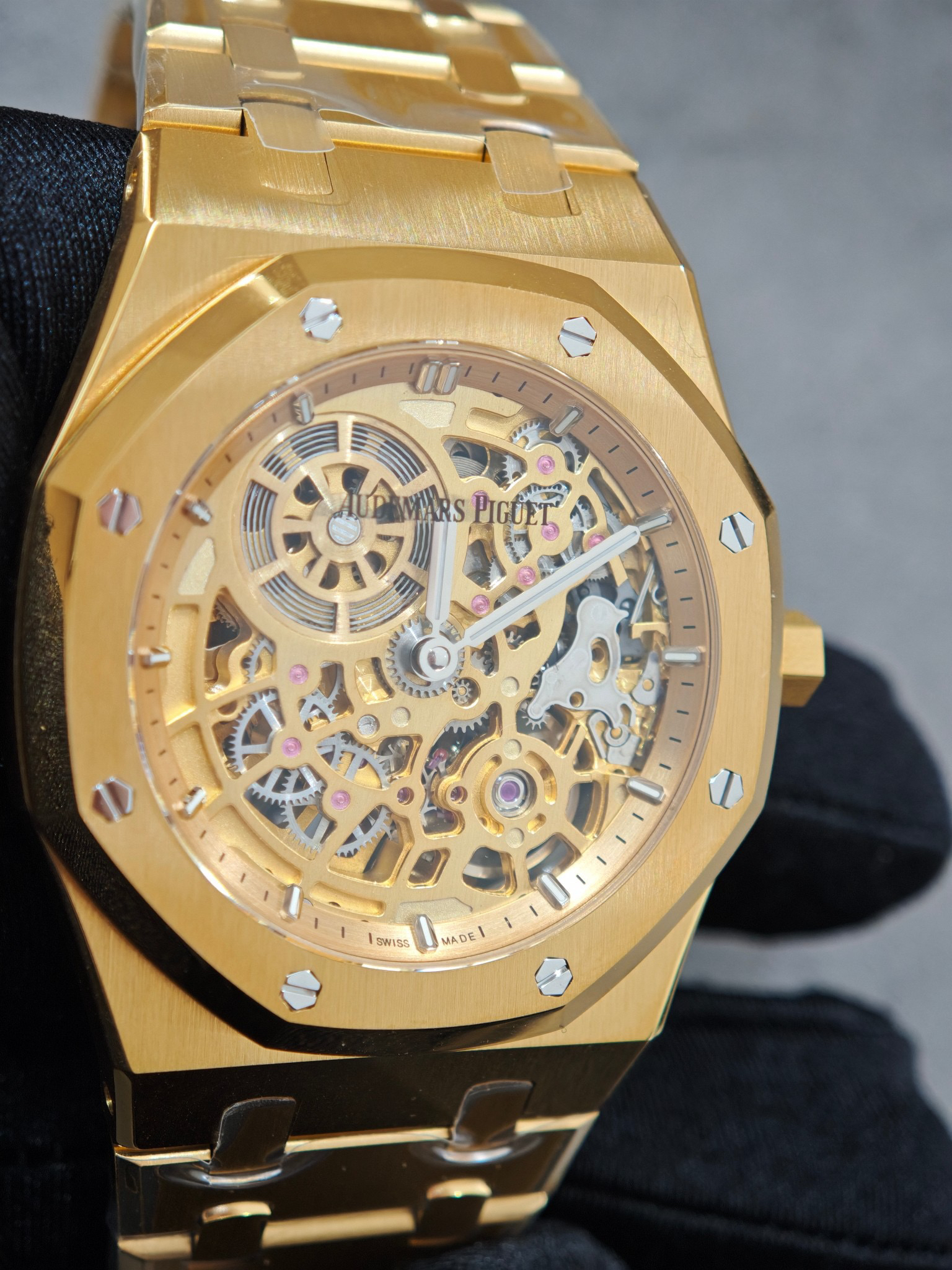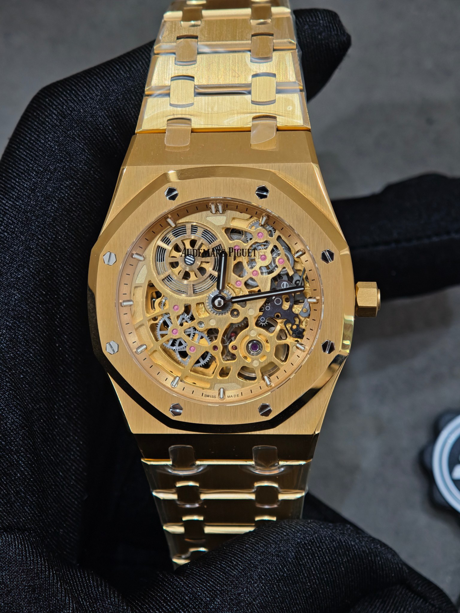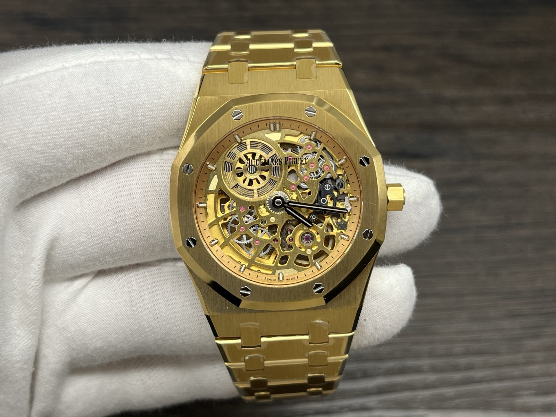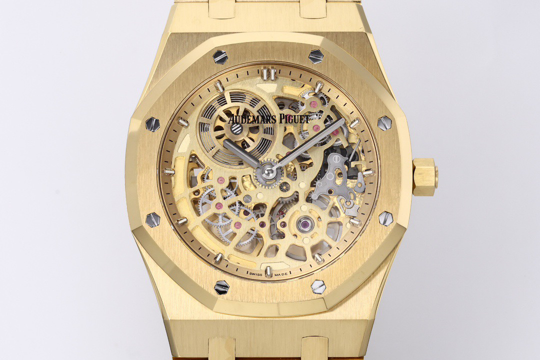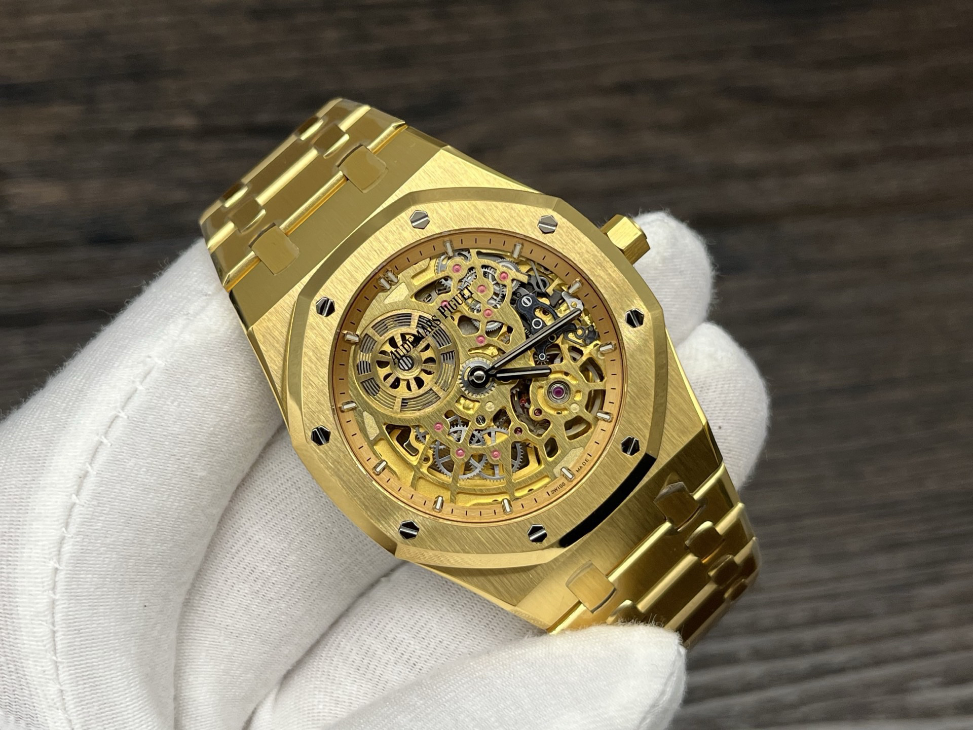 The highly recognizable octagonal 39MM case adopts advanced CNC machining technology to preliminarily cut and shape the stainless steel raw materials, and then uses exquisite wire drawing technology and forging surface polishing treatment to perfectly interweave on the case, presenting a unique luster and texture. The watch strap links are also produced through multiple complex polishing processes, making the surface of the links delicate, tightly connected, and flexible. Ensure comfort and fit when wearing. The AP logo on the watch buckle is finely carved, with clear lines and a three-dimensional steel structure. On the side of the case, the lugs naturally connect with the strap, creating a smooth transition and showcasing a harmonious beauty that is seamlessly integrated!