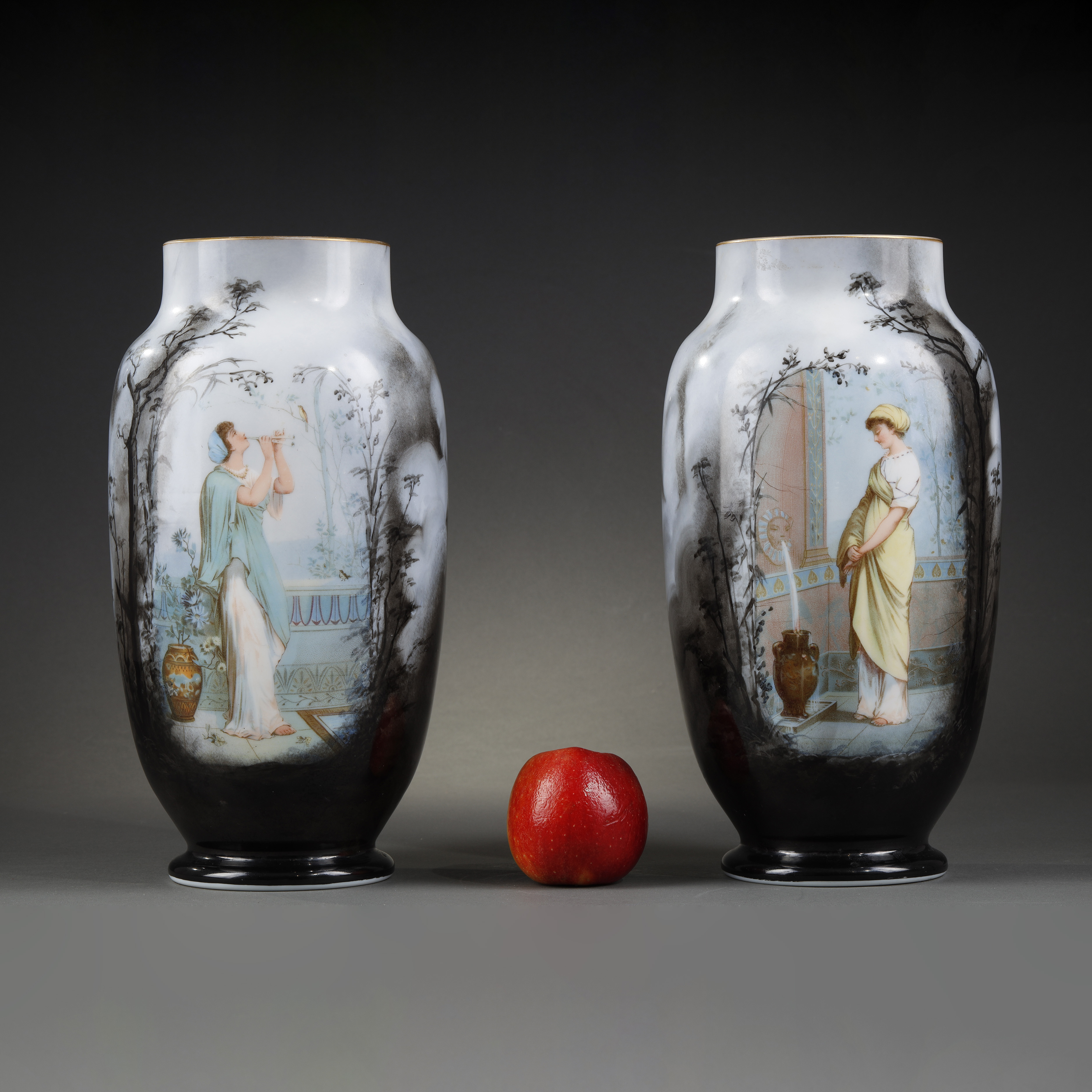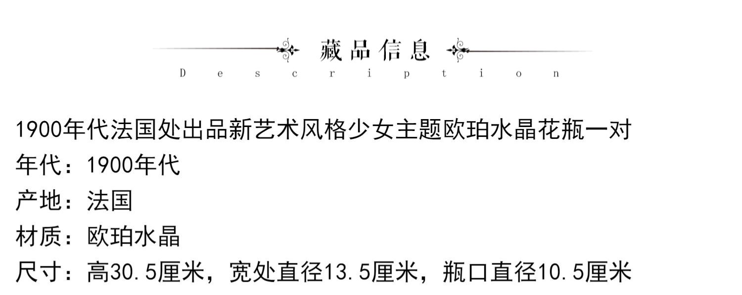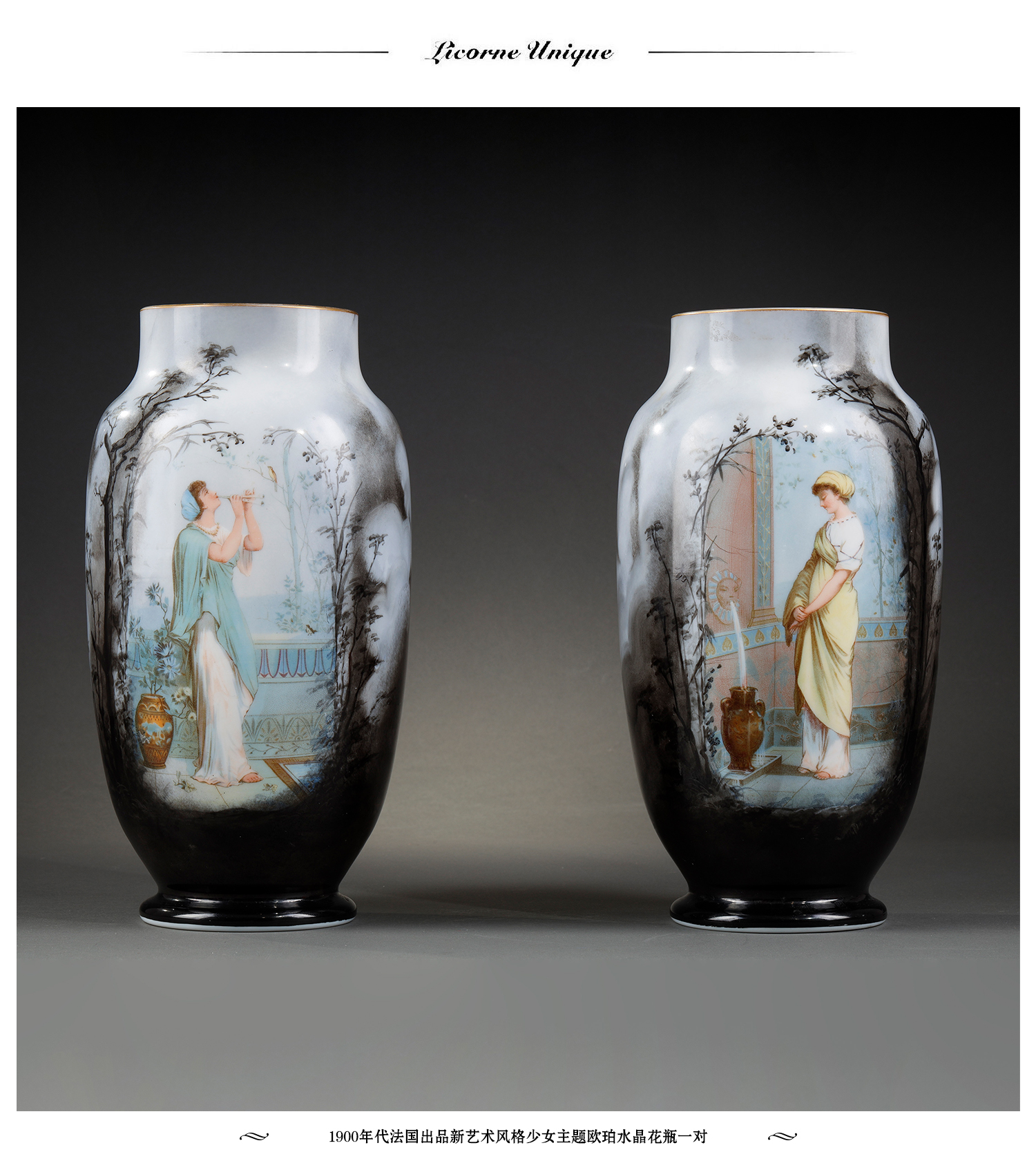 独角鹿西洋古董瓷器法国出品新艺术风格少女主题欧珀水晶花瓶一对