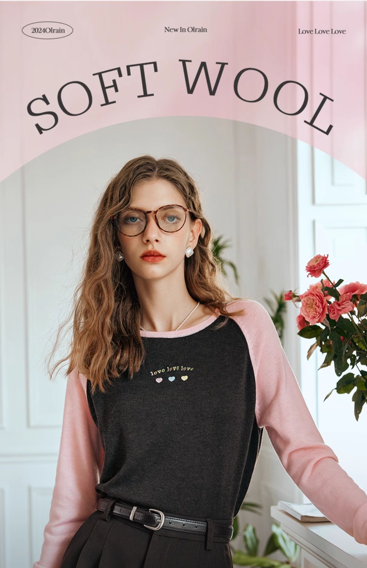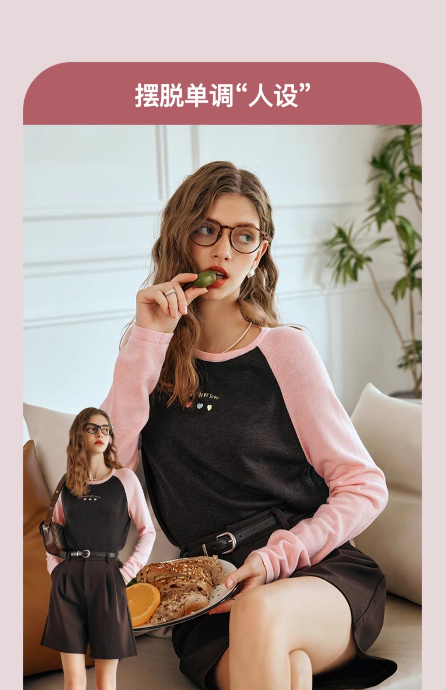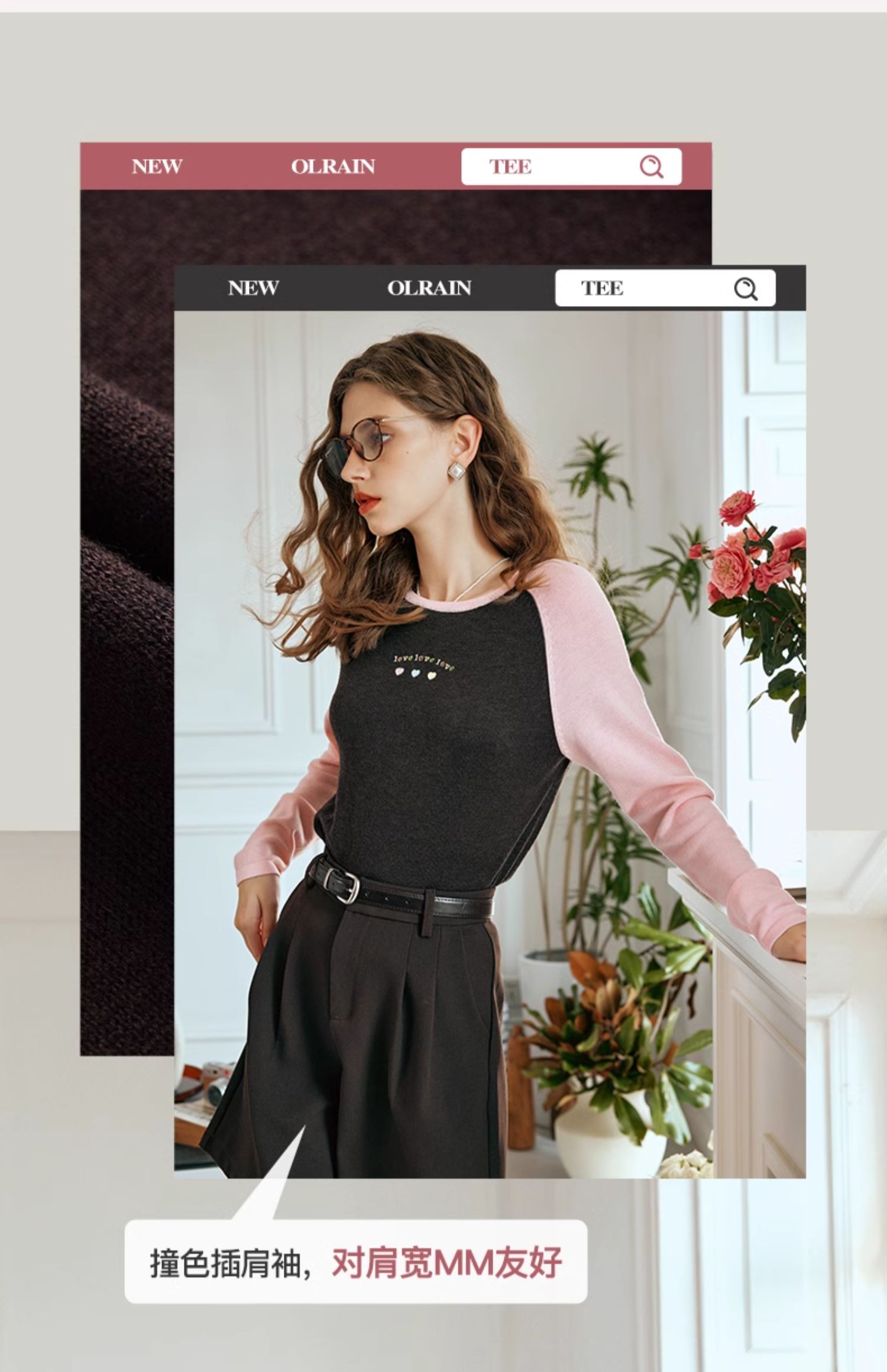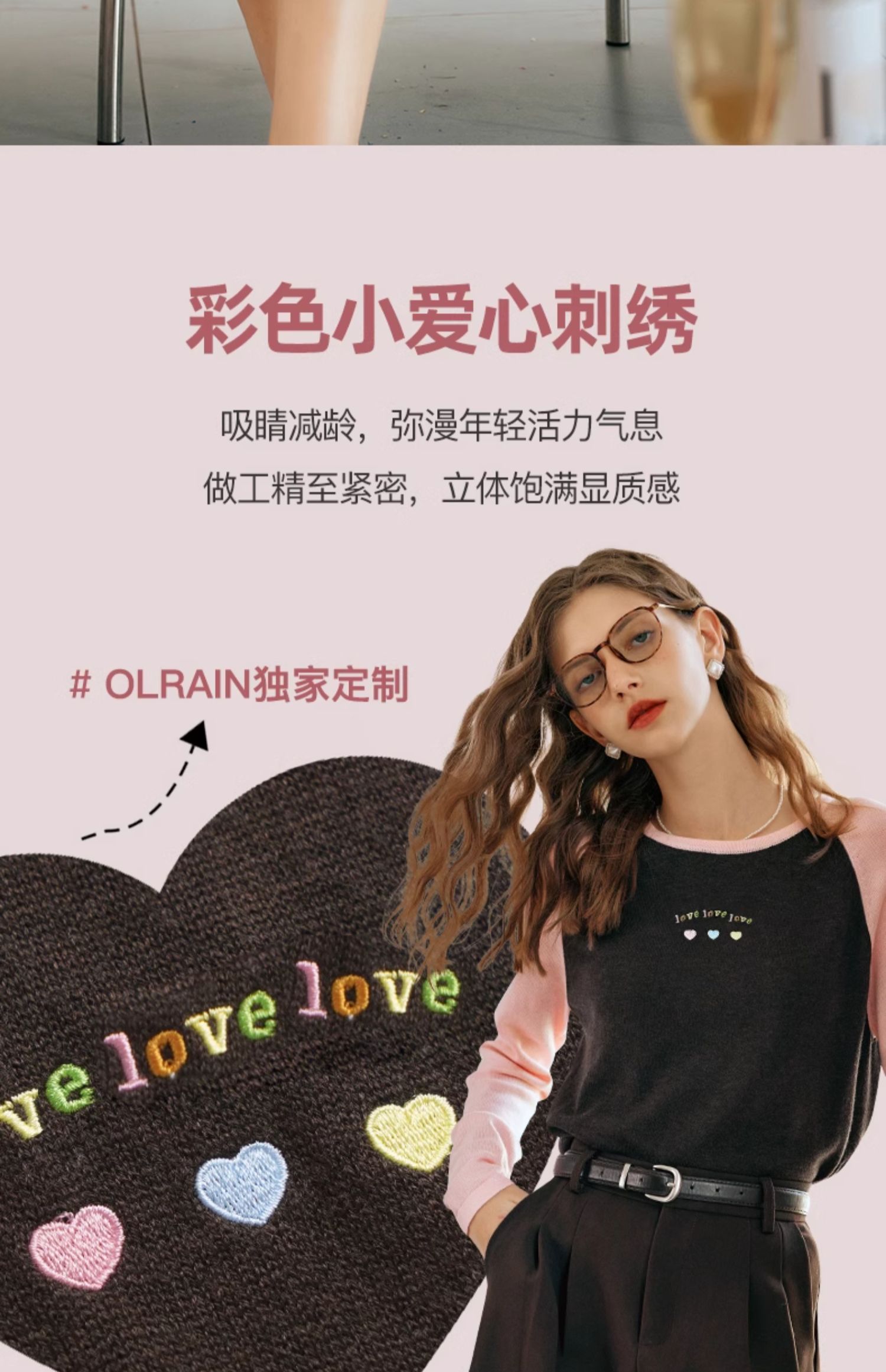 OLrain欧芮儿拼色针织衫女早春2024年新款修身设计感薄款打底衫