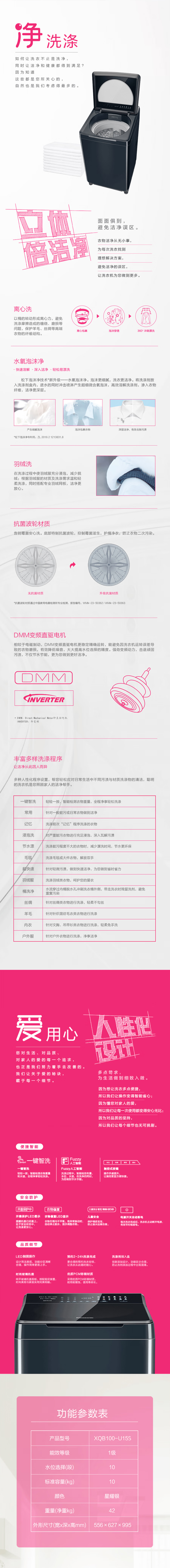 松下 洗衣机 XQB100-U15S 10KG 波轮 变频 一级能效 无烘干 爱捷净系列 顶开门 LED显示 不锈钢内筒 深色系