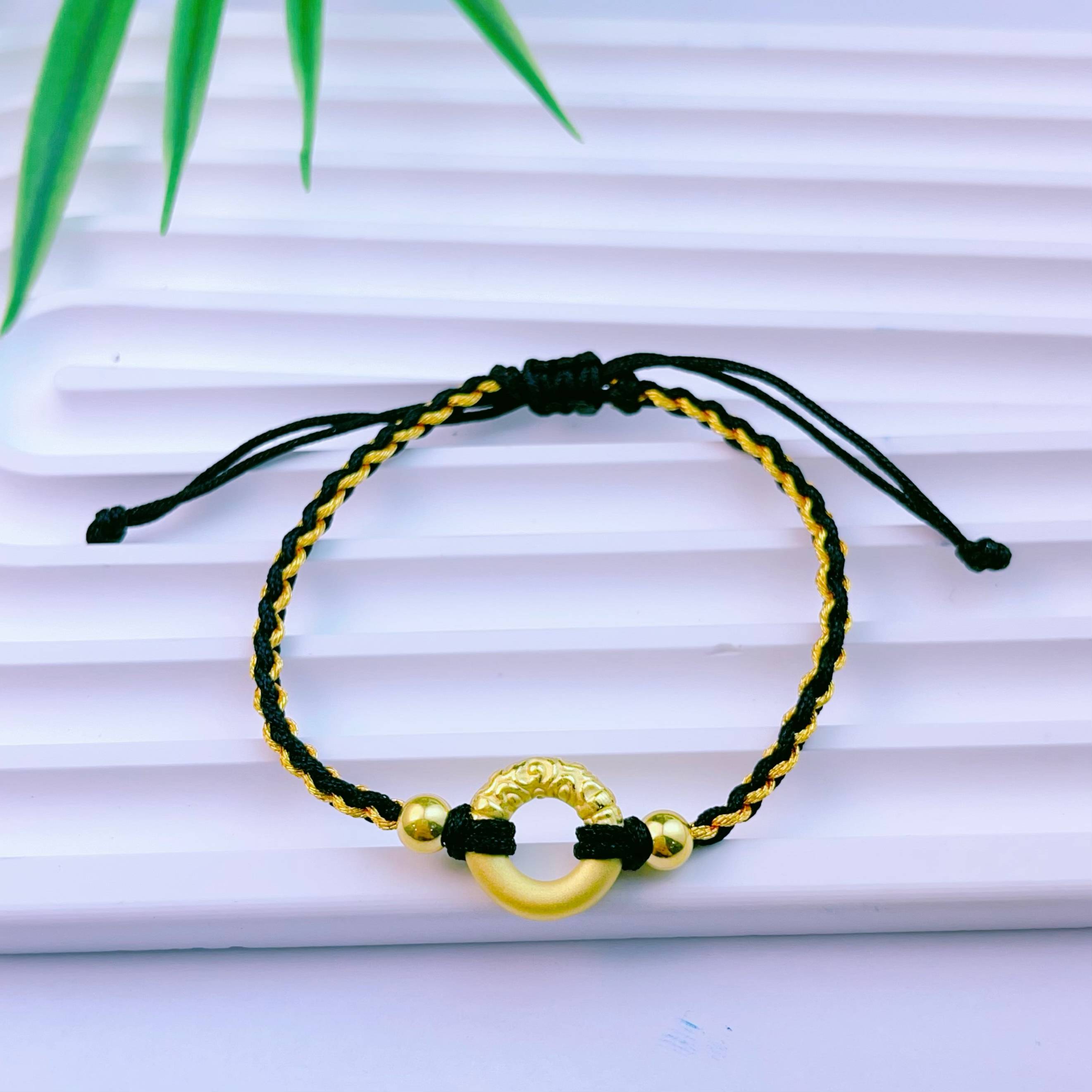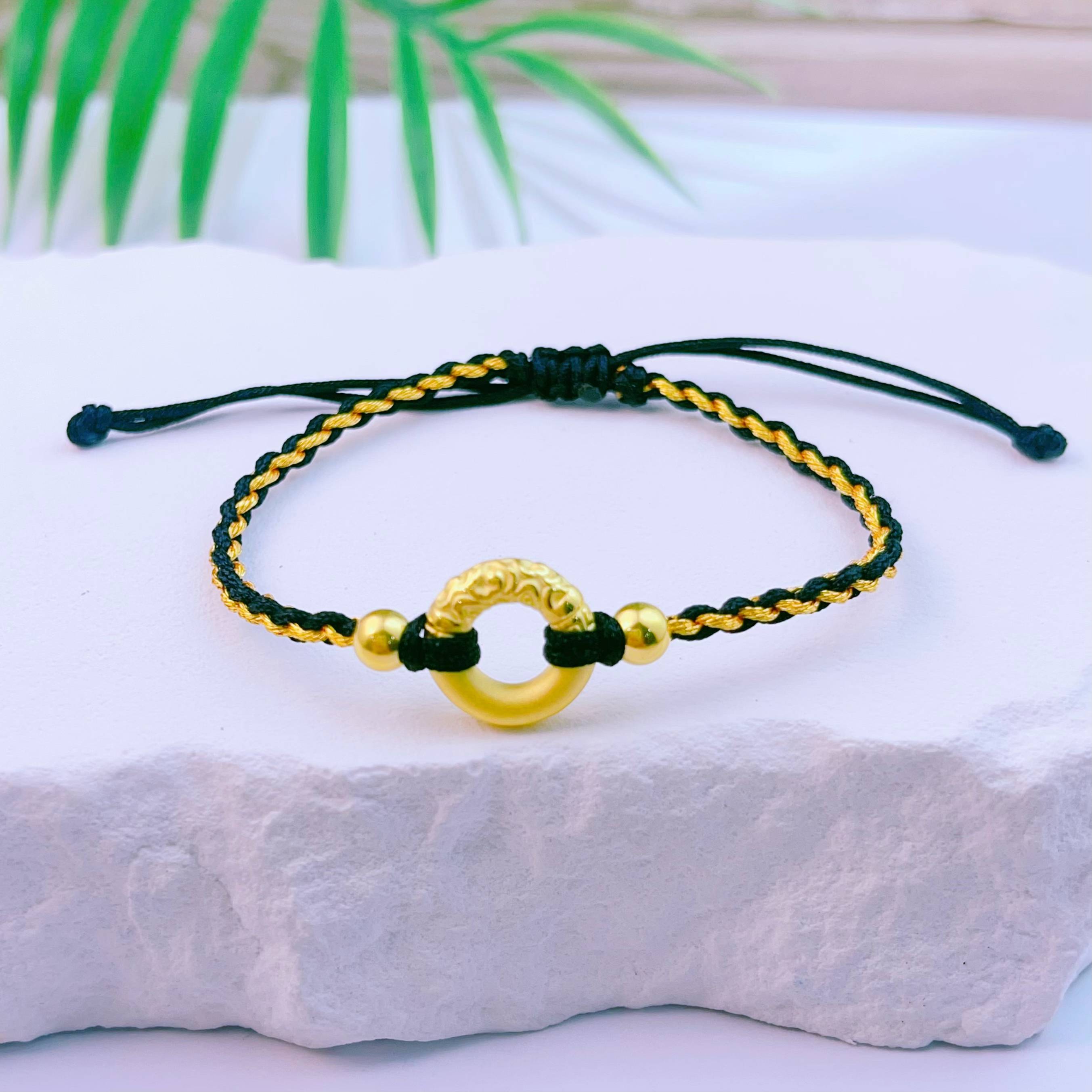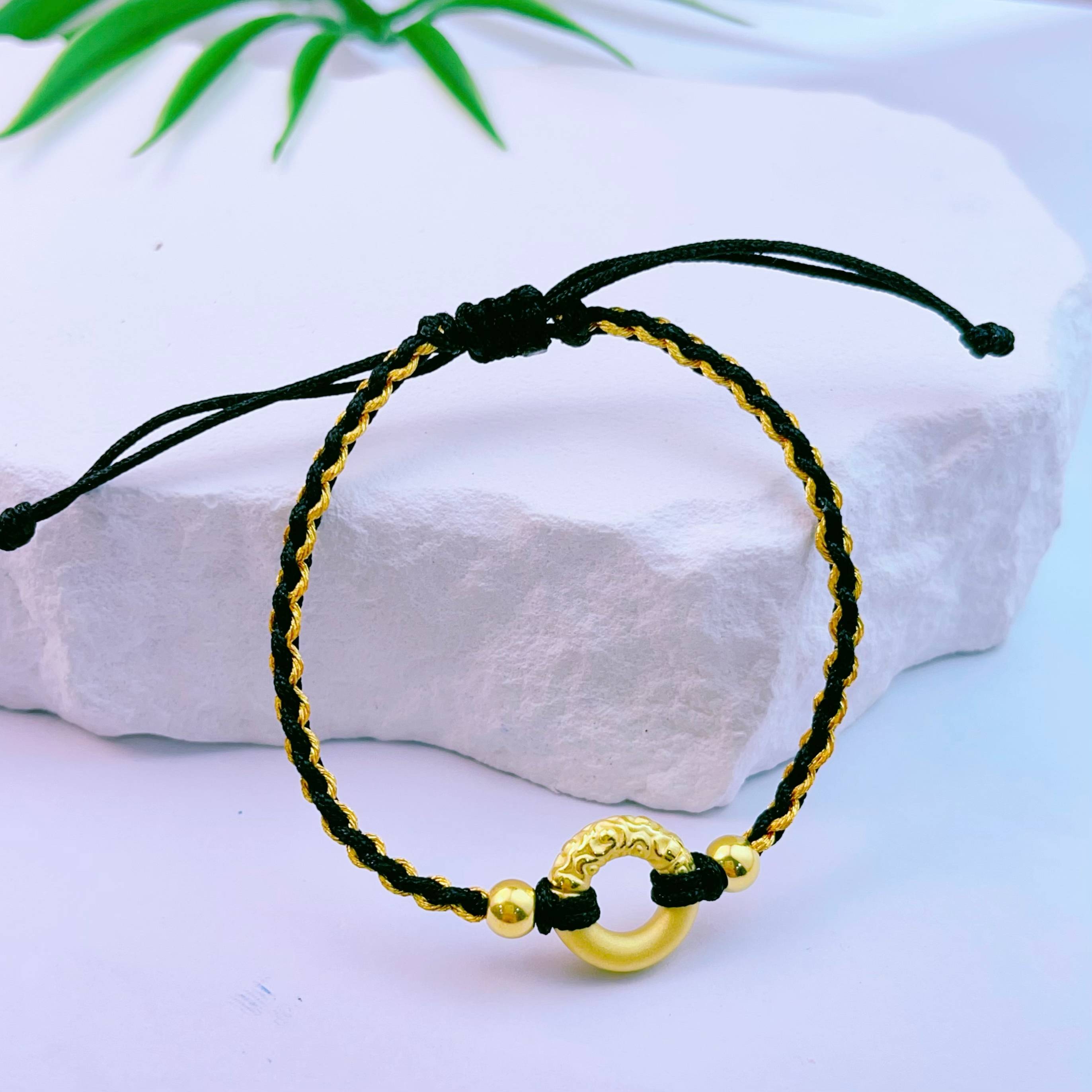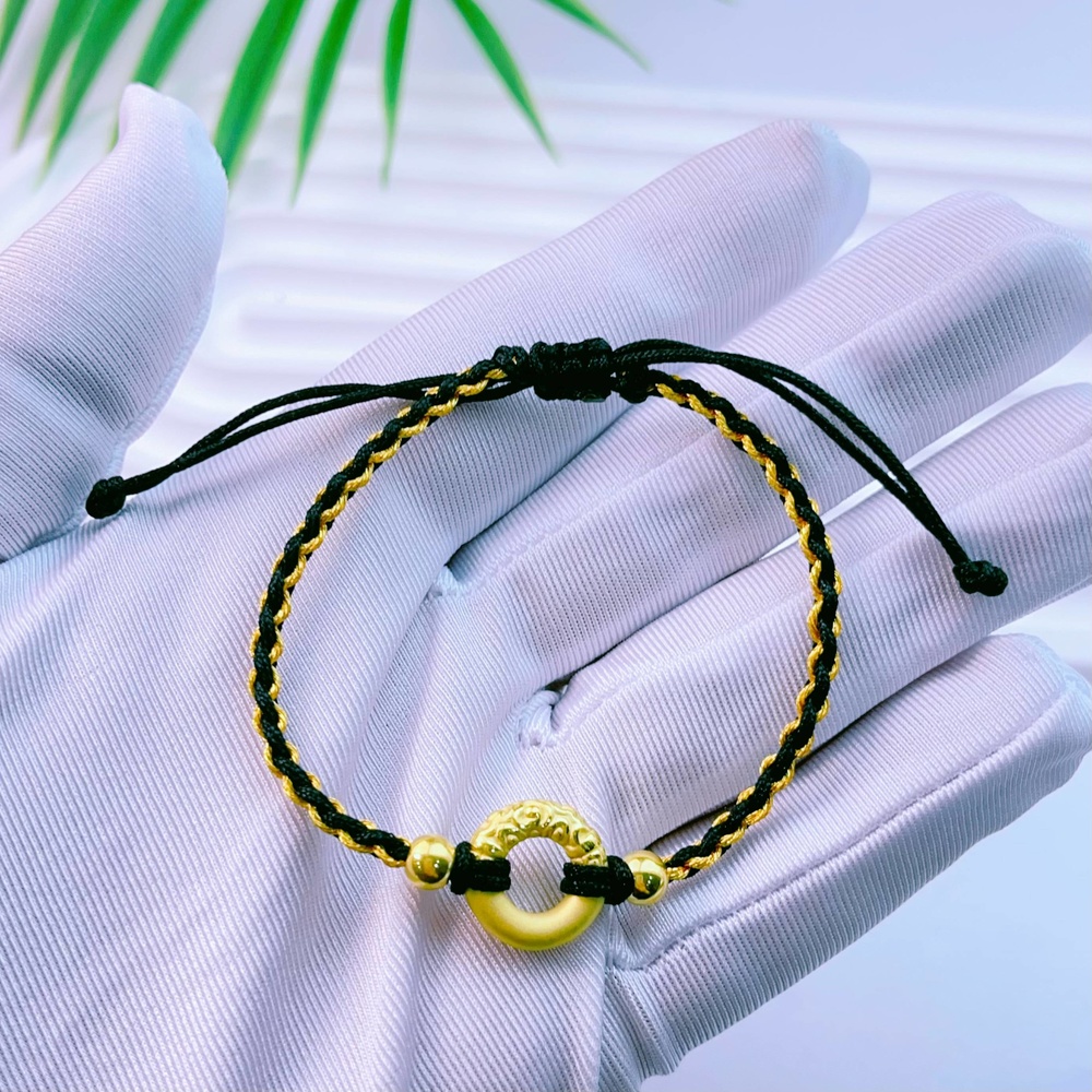 【限时7.5折】【定价黄金】足金 3D硬金空心祥云平安扣双珠黑金绳调节成品手串(AA3DSC00326)预售产品下单后不退款不退货不换货不补差价