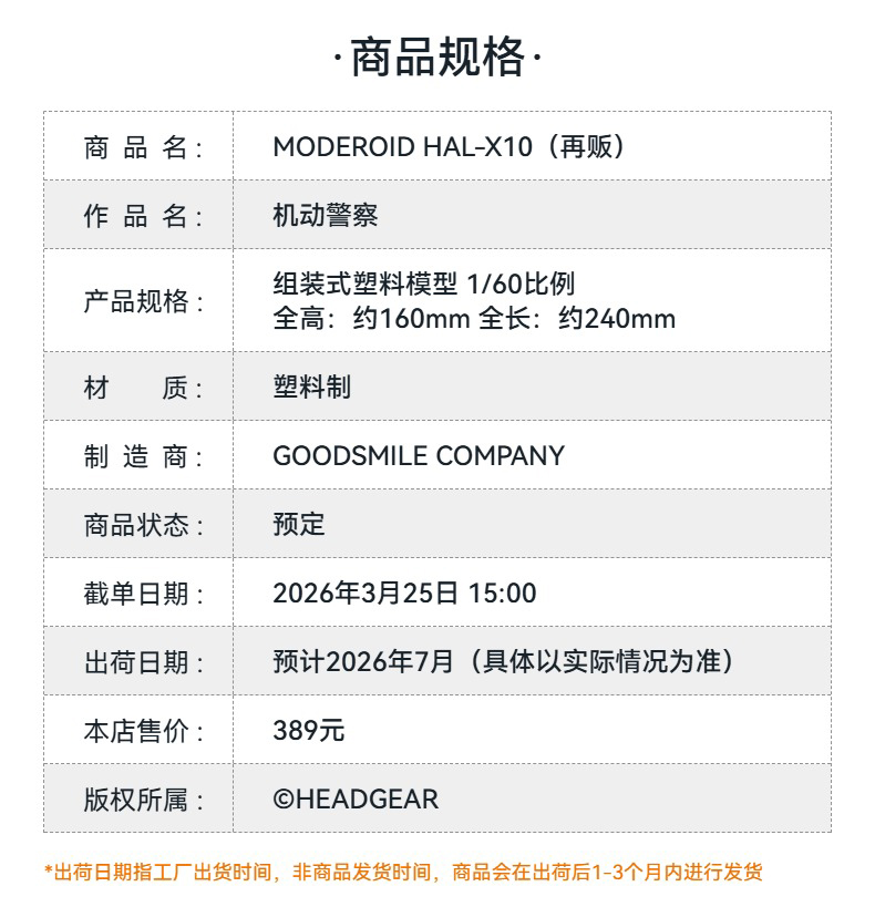 【GSC预售定金】MODEROID HAL-X10 机动警察 附官方限定特典 机动警察