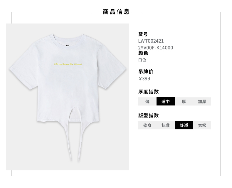 Lee商场同款22春夏新品舒适短身版印花多色女短袖T恤LWT0024212YV00FK14000/A00432