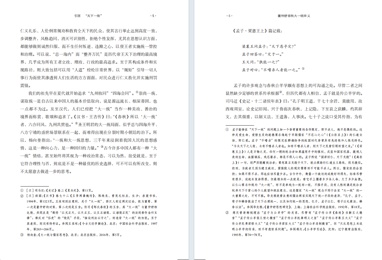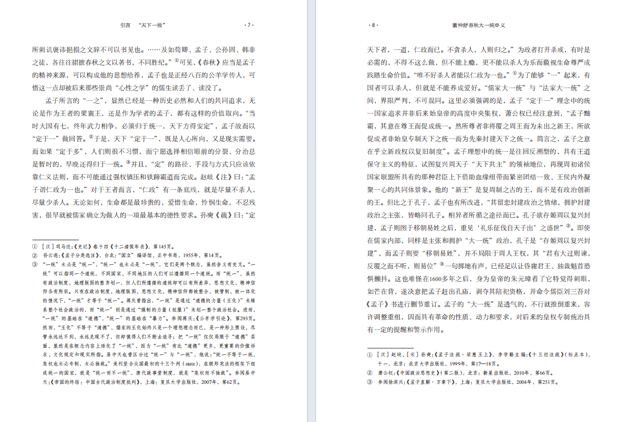 本书秉承董仲舒今文经学之风范,立足公羊家经典却不拘泥于章句训释,基于“亲亲、尊尊”原则,挖掘从“门内之治”的“恩揜义”推扩于“门外之治”的“义断恩”,进而实现“君天子”“臣诸侯”的“大一统”治理脉络,勾勒出王权天下封建制、皇权时代郡县制的精神基础,凸显出秦至汉初统一帝国实施郡县制、分封制的政治纠结与波澜壮阔的时代背景,梳理出从李斯变革“燔书坑儒”、《削藩策》,到“推恩令”、劝以利禄的历史选择过程。在公羊家“元年春,王正月”“三世异辞”的叙事结构中,强化以历史认知的维度,阐发“存二王之后”以“通三统”的古代政治文明优秀传统,使“大一统”的内涵充实饱满。