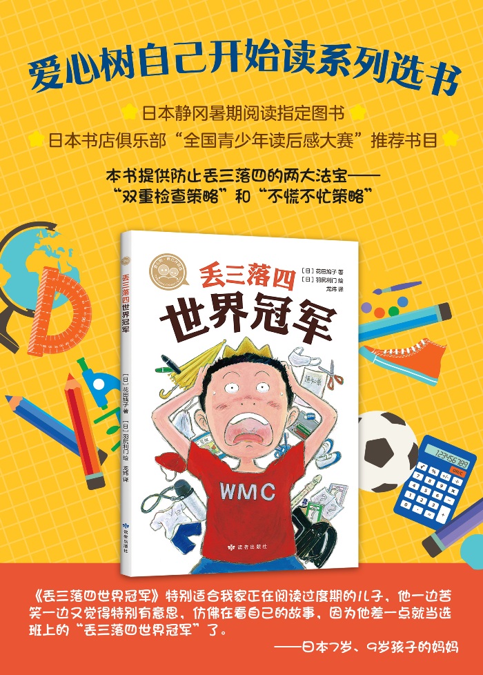 我儿子班上也在评选“丢三落四世界冠军”,他差一点就当选了。这时我发现了这本书,特别适合正在阅读过度期的儿子。儿子读的时候一边苦笑一边又觉得特别有意思。我决定在我们家也尝试一下“双重检查策略”和“不慌不忙策略”。——日本7岁、9岁孩子的妈妈