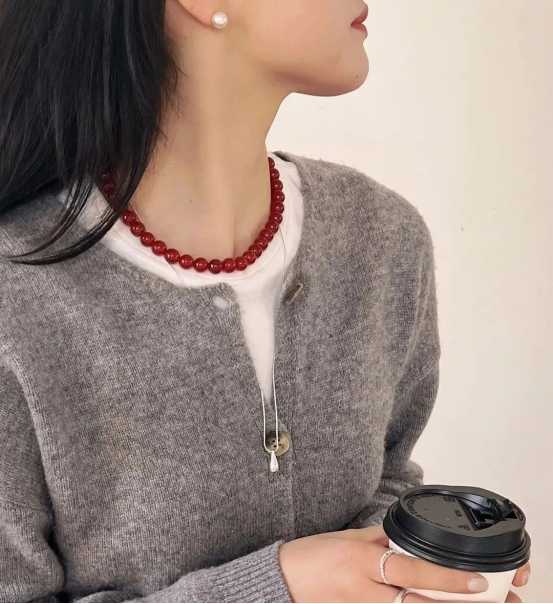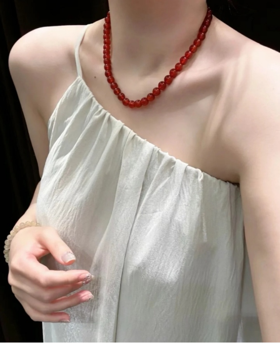 红玛瑙质地温润 东方传统色,一抹中国红 红色象征吉祥、喜庆与活力❤️ 也承载着深厚的历史与文化内涵 每一颗珠子紧密相连 浑然天成 是自然赋予的一体艺术品 彰显着简约而不失高雅的新中式韵味 红玛瑙项链与冬季的服装尤为相配 它可以与黑色、白色和灰色的衣服搭配 相得益彰,层次分明