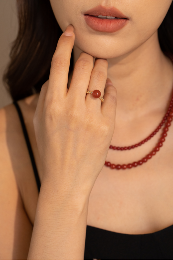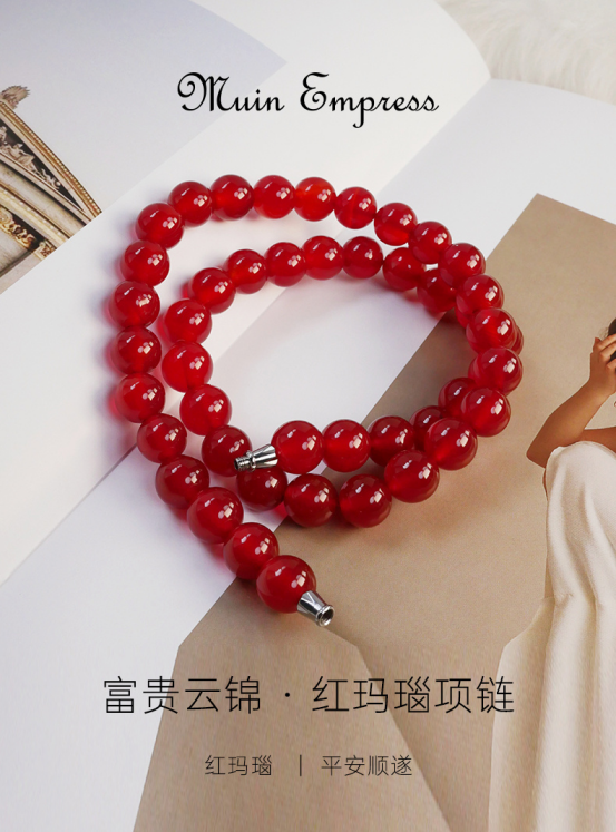 中国色,取之于天地万物,饱满丰富 而中国红更是别有一番韵味 红色寓意着: 吉祥、喜庆、热烈、奔放、激情... 一颗颗红玛瑙缠绕颈间 流动而不拘