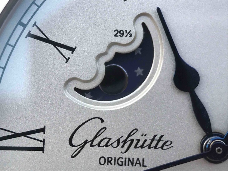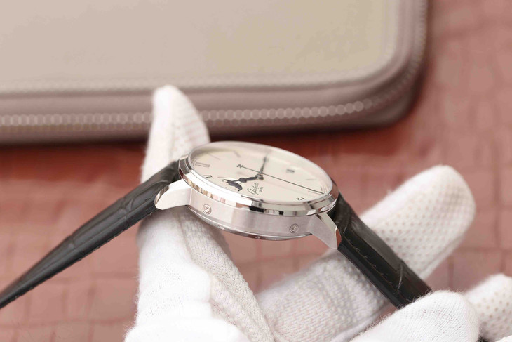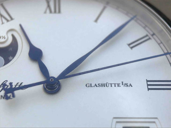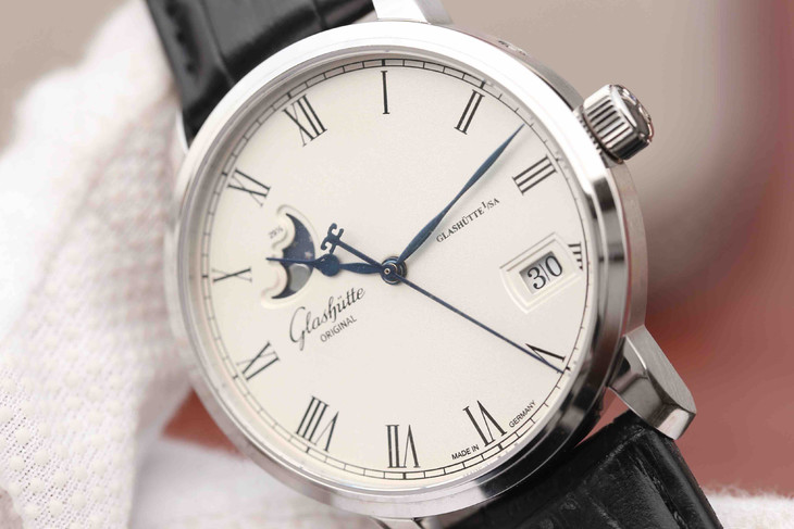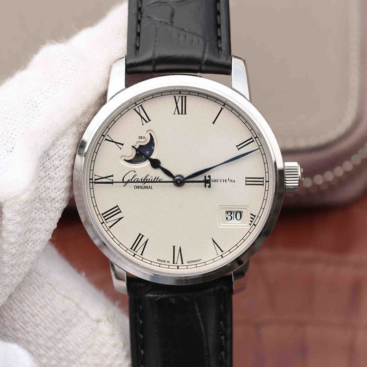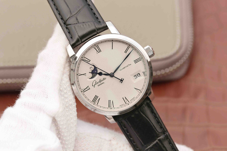 F格拉苏蒂原创议员大日历月相腕表100-04-32-12-04 。直径40mmx厚11mm。男士手表,皮表带,自动机械机芯,透底