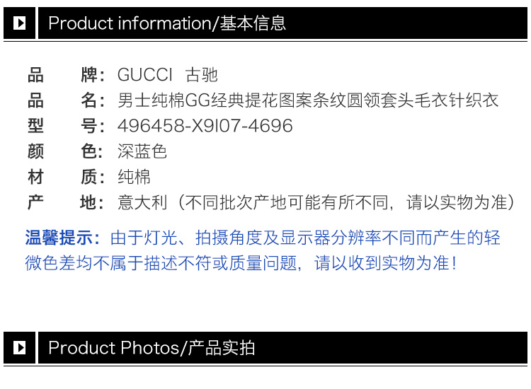 GUCCI 古驰 男士GG经典图案条纹上衣 496458-X9I07-4696