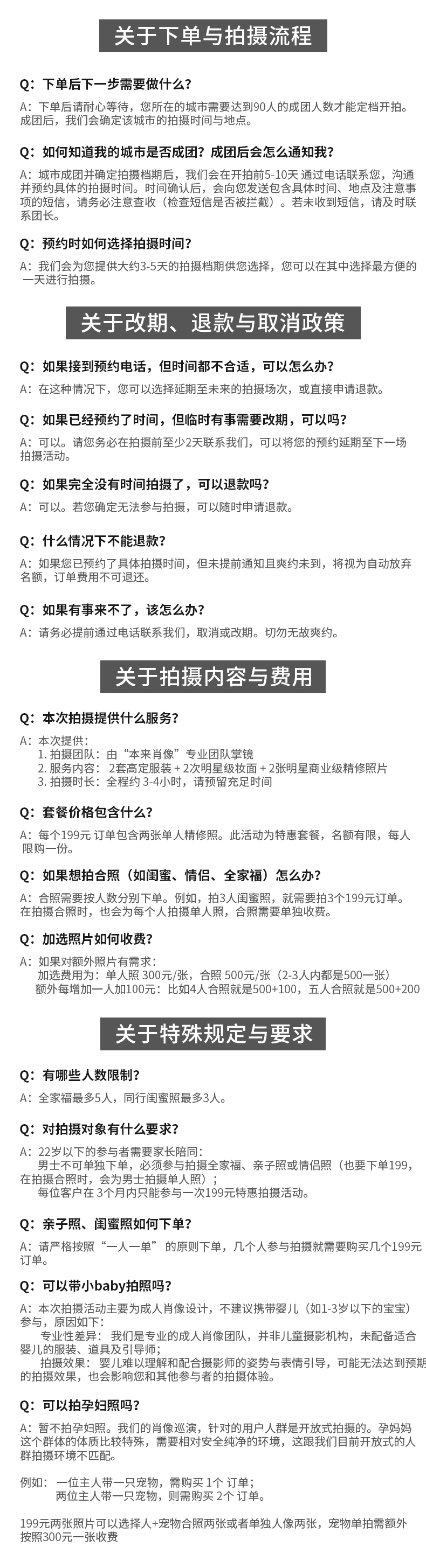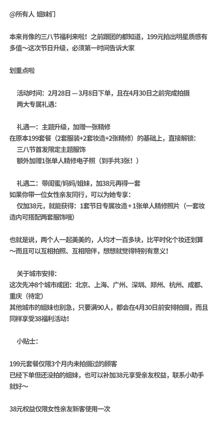 【提醒】:全国巡演,每个城市是全渠道90人成团,如人数达到,品牌方会安排小助理电话联系预约拍摄档期,这次女神节活动是3-4月的活动,一定要预约3-4月份的档期,才有199元3张精修的福利,如果约不上,会做退款处理,一经预约,不可取消不可更改,档期紧张,排期出来就要尽快预约,介意慎拍。