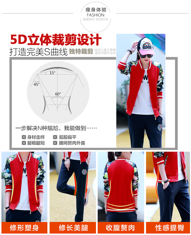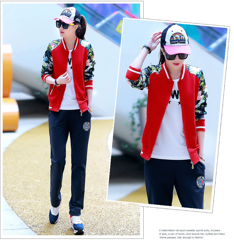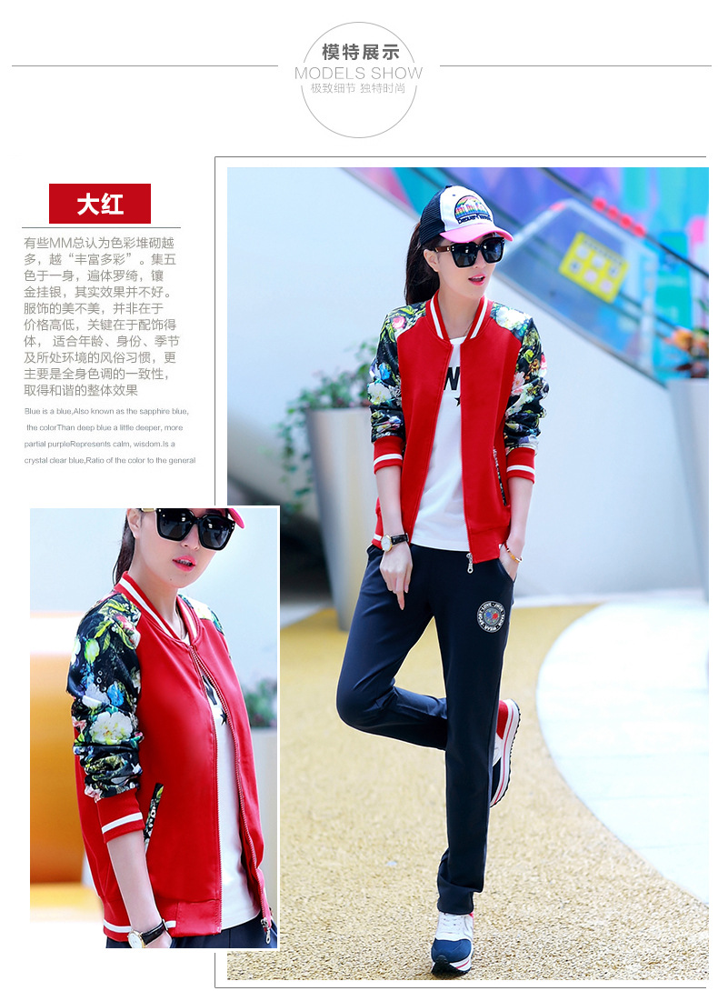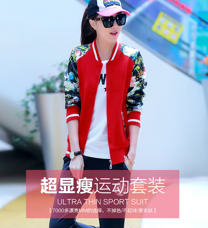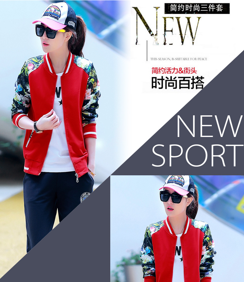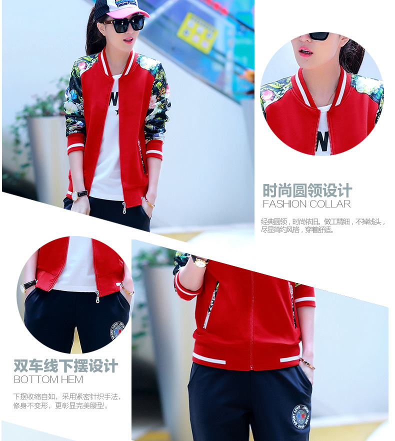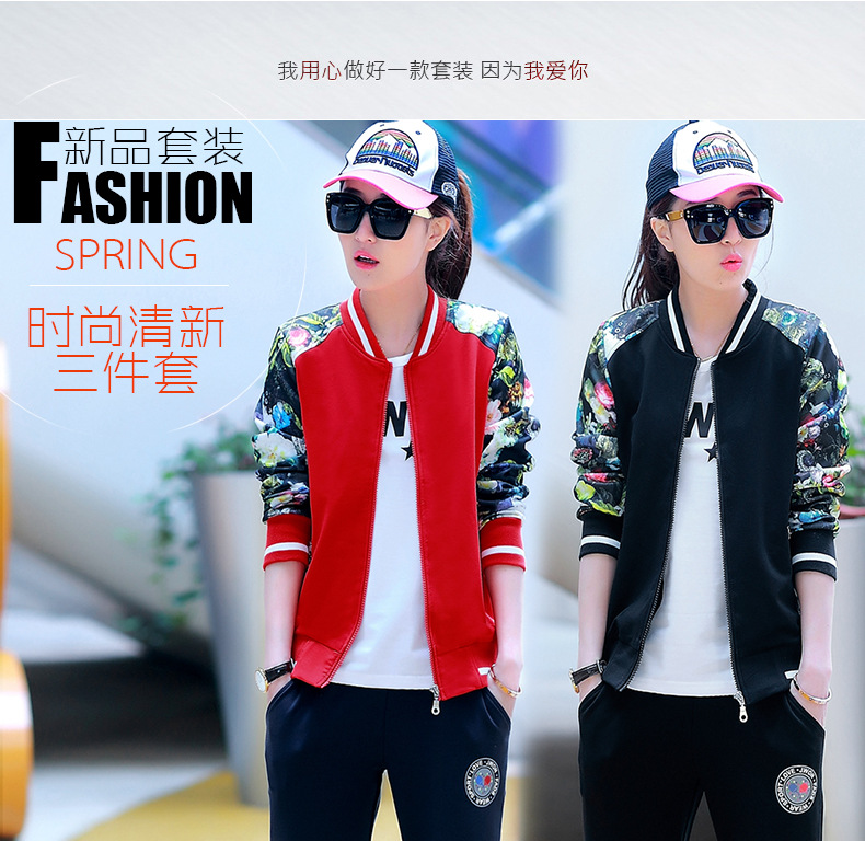 【女士休闲套装】运动套装女装靓丽春秋季韩版卫衣三件套棒球服袖子印花朵运动套装