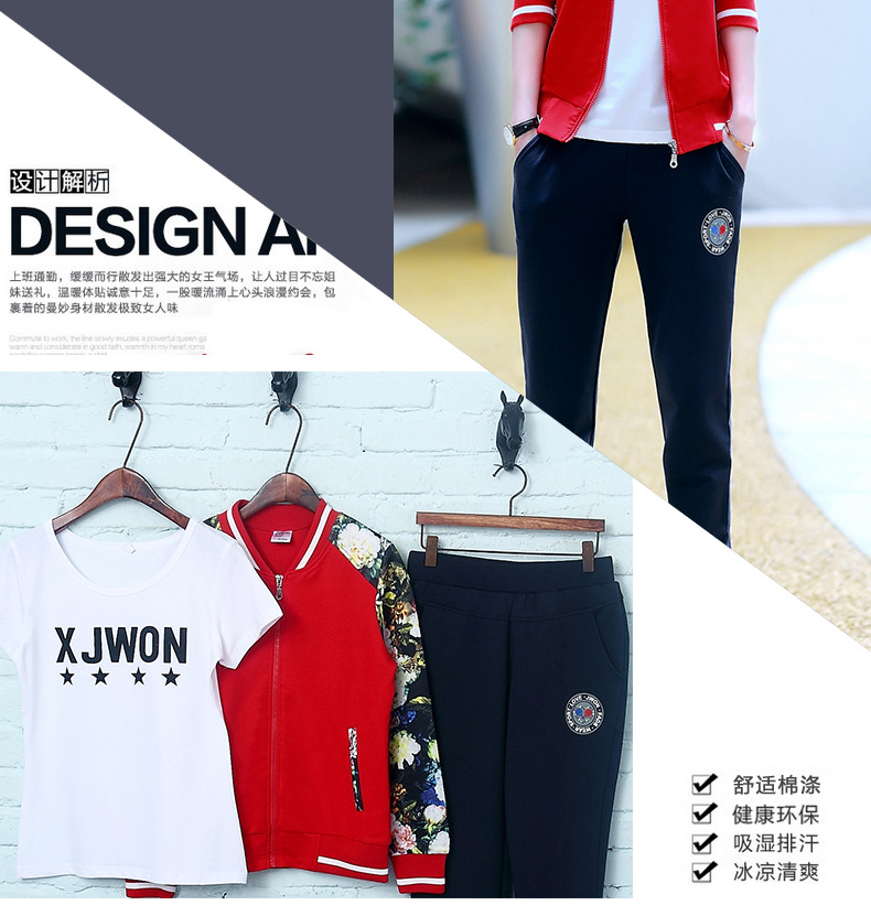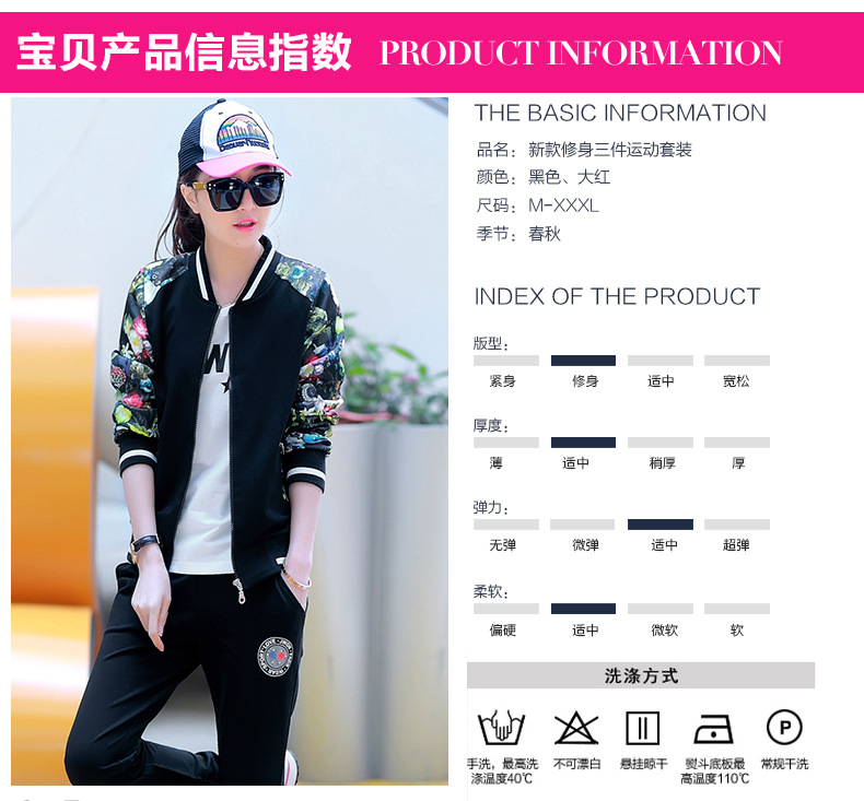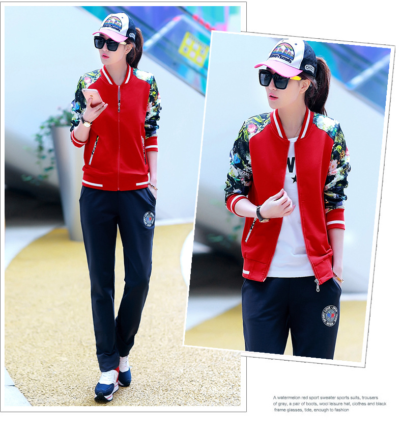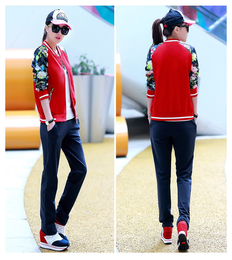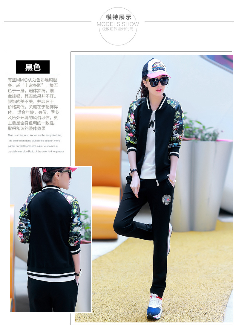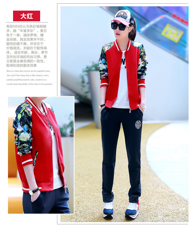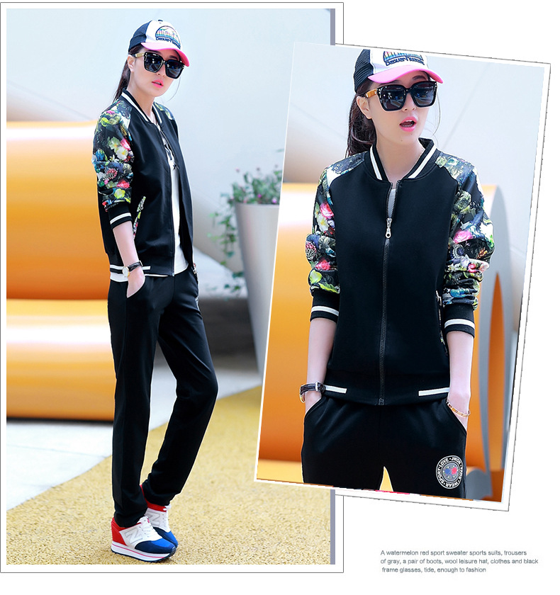 【女士休闲套装】运动套装女装靓丽春秋季韩版卫衣三件套棒球服袖子印花朵运动套装