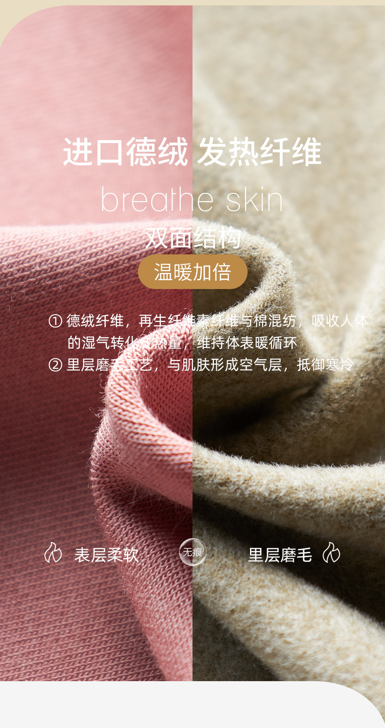 手感柔软亲肤,贴合身型,高弹力舒适不勒,不松垮不变形,不含涤纶,贴身无刺激,抗静电,显著提升体温,保暖锁热