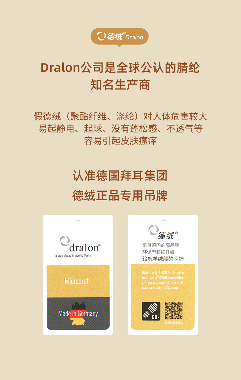 德绒专属吊牌,配质检报告,用数字说话,单件包装,可随机搭配产品,色系定制定染,适合不同年龄阶段。