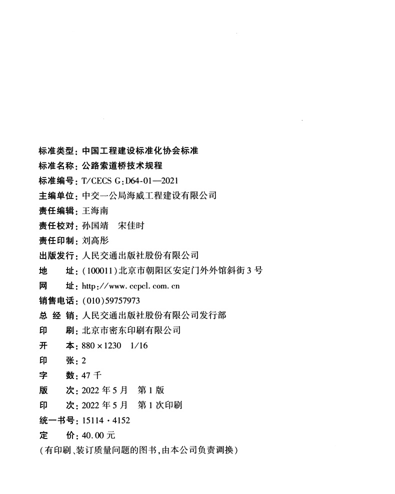书名:公路索道桥技术规程(T/CECS G:D64-01—2021)
