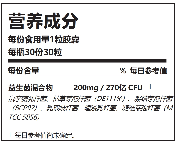 其他成分:大米麦芽糊精、缓释胶囊(羟丙甲纤维素、果胶、水)、中链甘油三酸酯。包含:树坚果(椰子)在没有牛奶、鸡蛋、鱼类、甲壳类动物、花生、小麦、大豆和麸质的情况下生产。在可能处理含有这些过敏原的其他成分的设施中生产。DE111®是Deerland Probiotics & Enzymes,Inc.的注册商标。