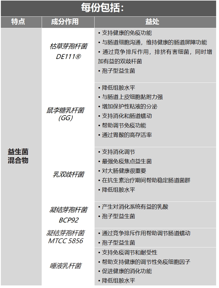 • 结合了基于孢子的菌株和传统活菌菌株的优点,消除了需要摄取多种益生菌的必要性。