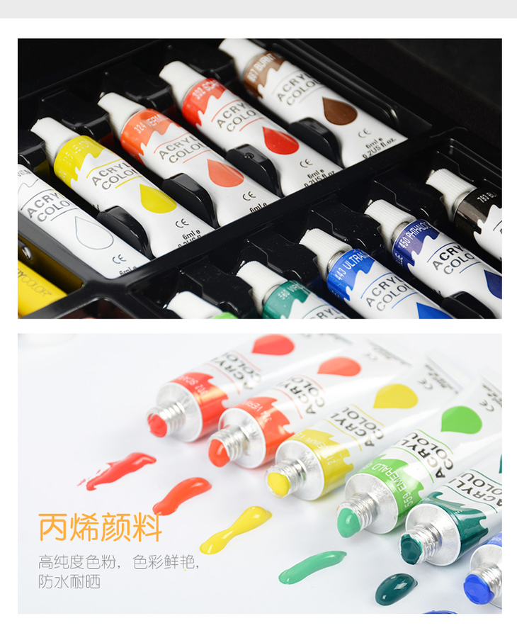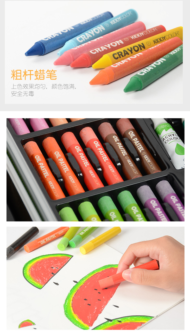 包含:36色油画棒,24色水溶性彩铅,20色水彩笔,18色蜡笔,12色固体粉饼,10色丙烯颜料,5支铅笔,2个调色盘,1个水壶,1块海绵,1支画笔,1个橡皮擦,1个卷笔刀