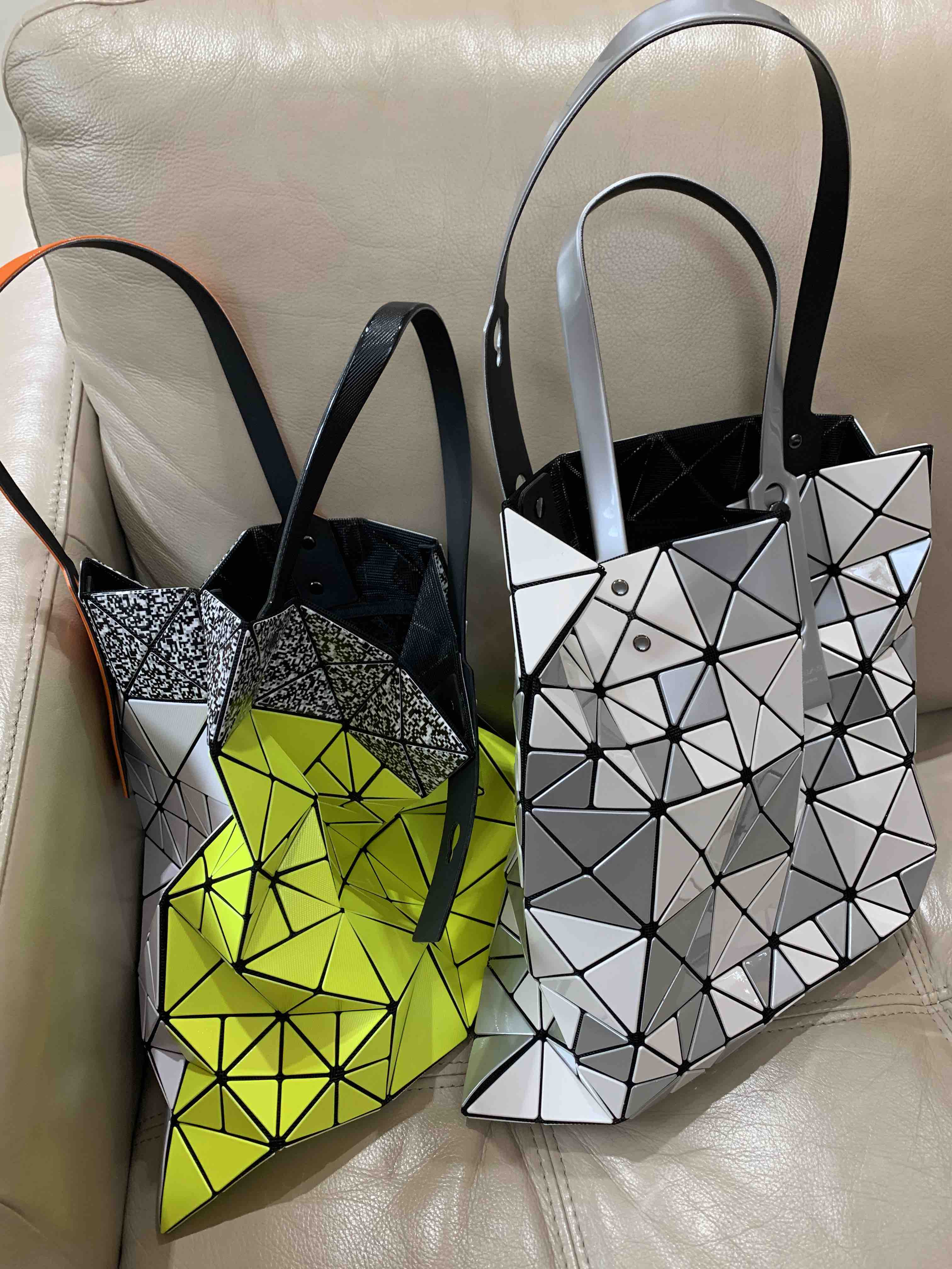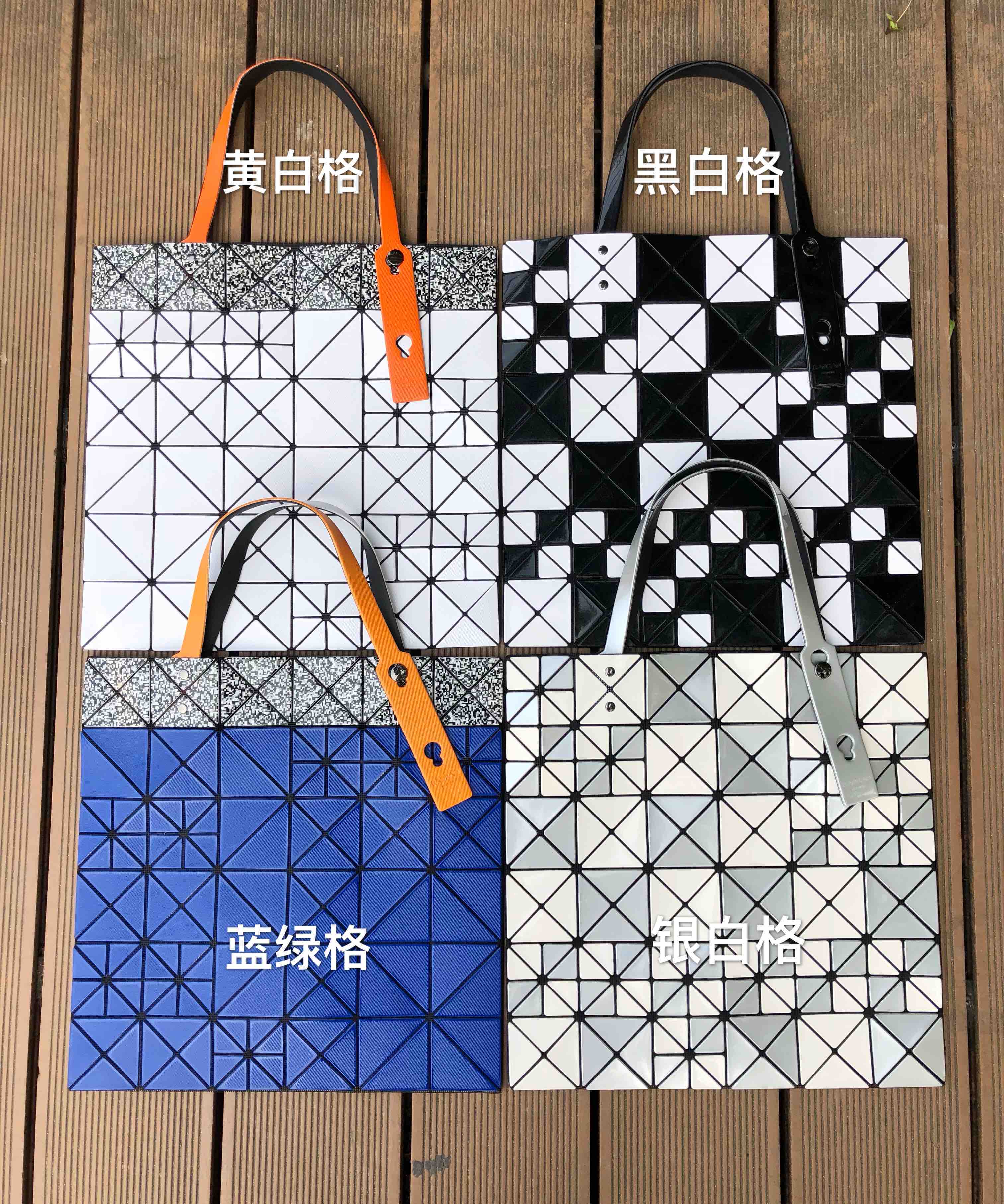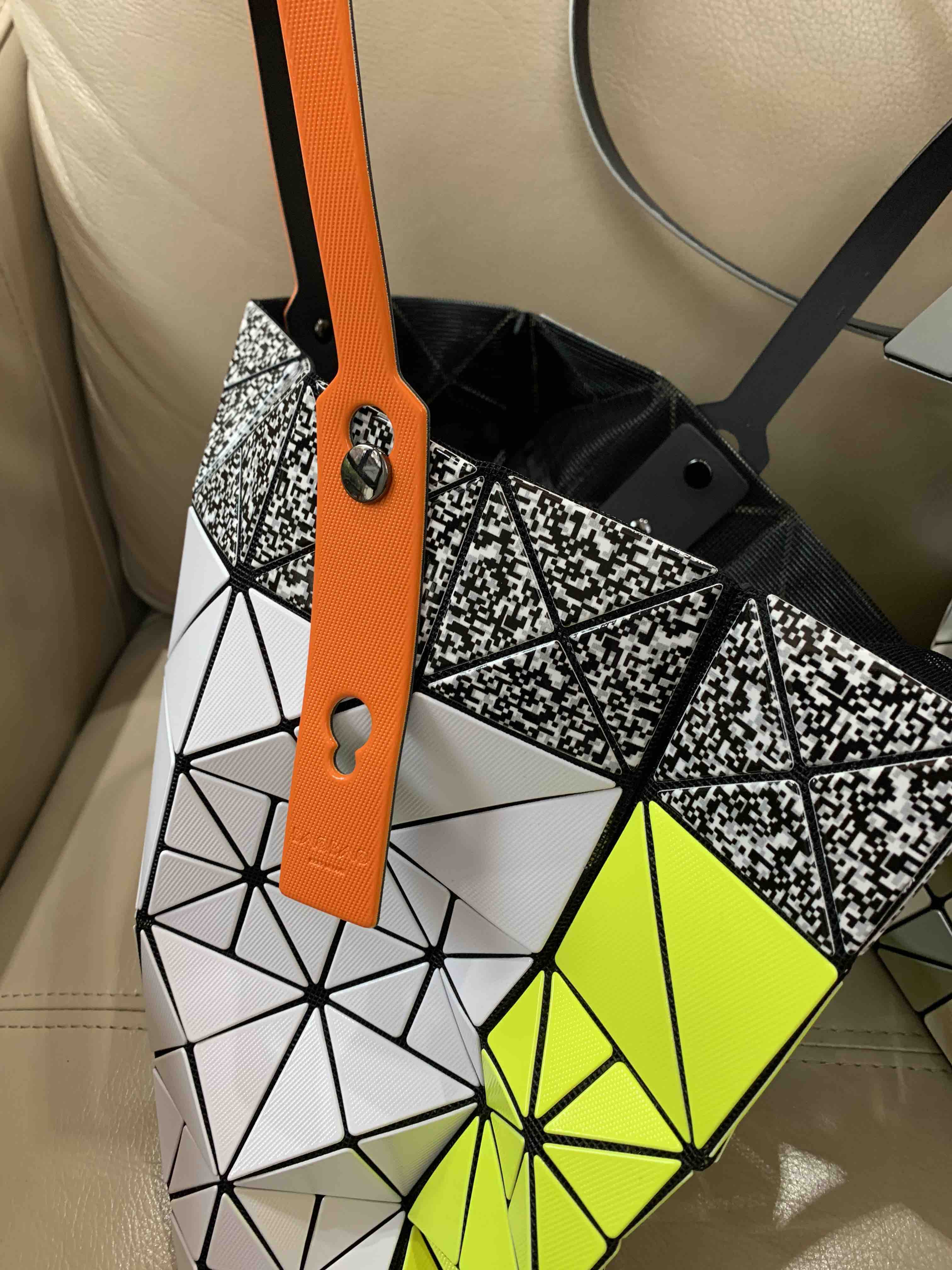 319-5:三宅21新撞色 双面拼色大小格 六格手提包。双面拼色大小格,正反撞色超炫超酷,手柄的颜色也不一样,每年都会推出撞色系,今年新色更加拉轰,钻石纹路的灵感,二维码图案的灵感,设计师独具慧眼,与时俱进。材质与经典款略不同,描述不上来,仔细看我实拍,手柄颜色也是不同,手柄长短可以调节,手提单肩都很适合。经典六格,size:34*34cm,记得区分颜色哦。239米特