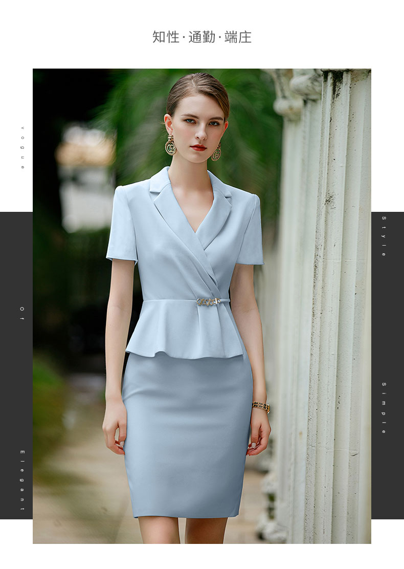 IWY/蓝色短袖连衣裙工作服女气质女神范职业装收腰假两件售楼部工装Q944