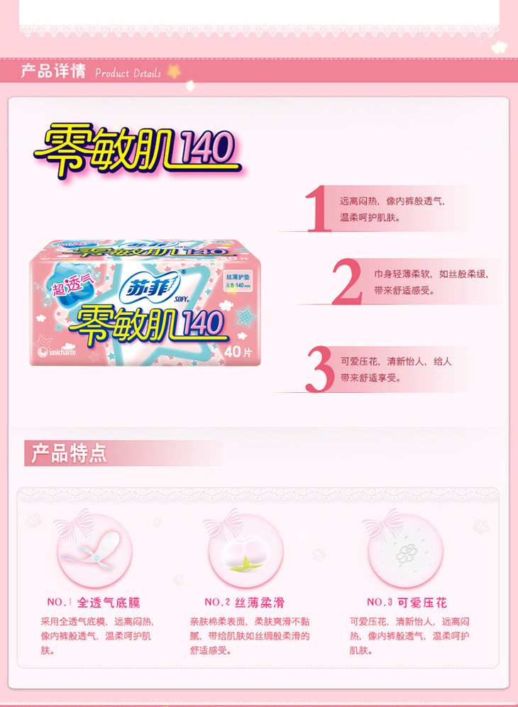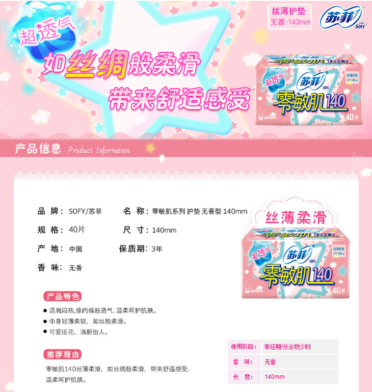苏菲零敏肌140丝薄柔滑无香型护垫日用40片