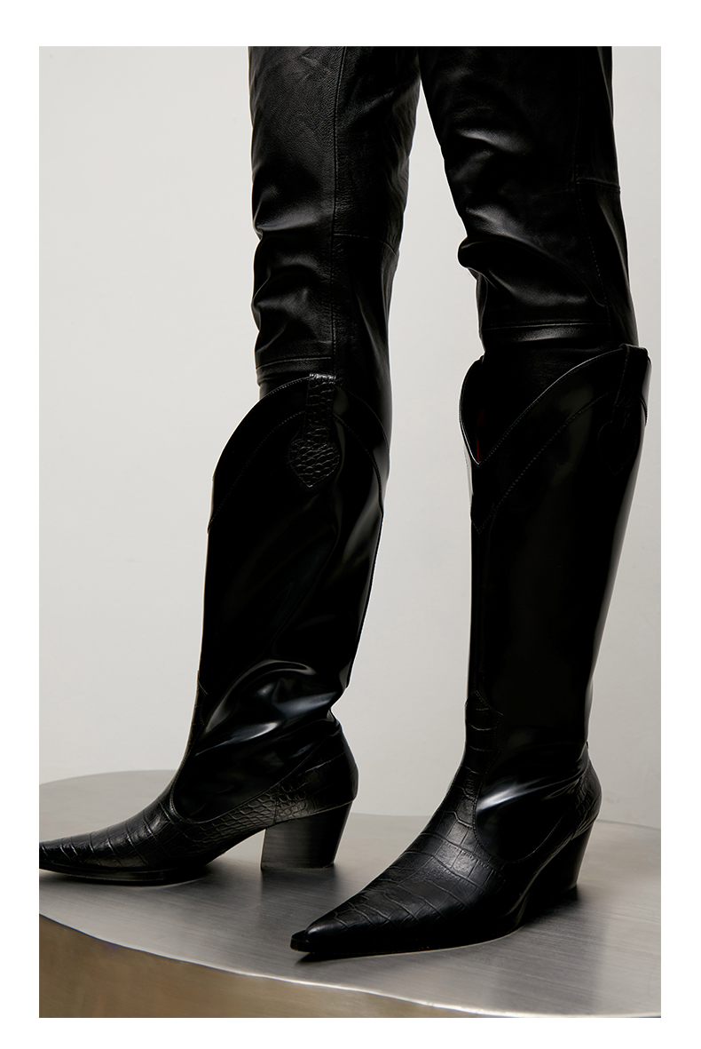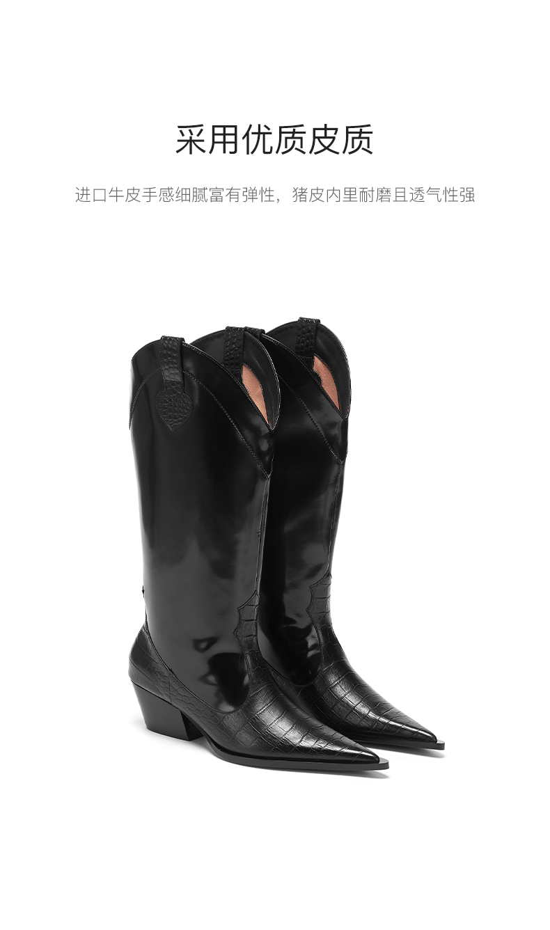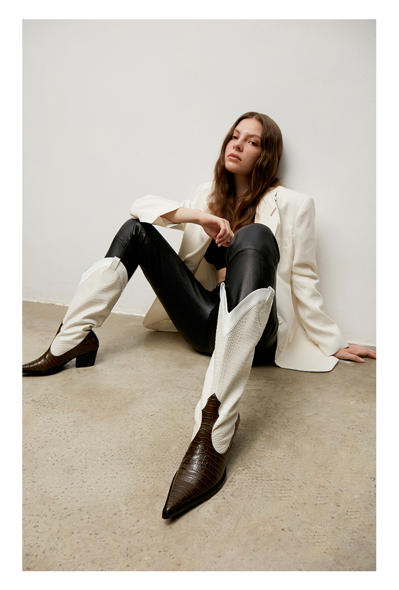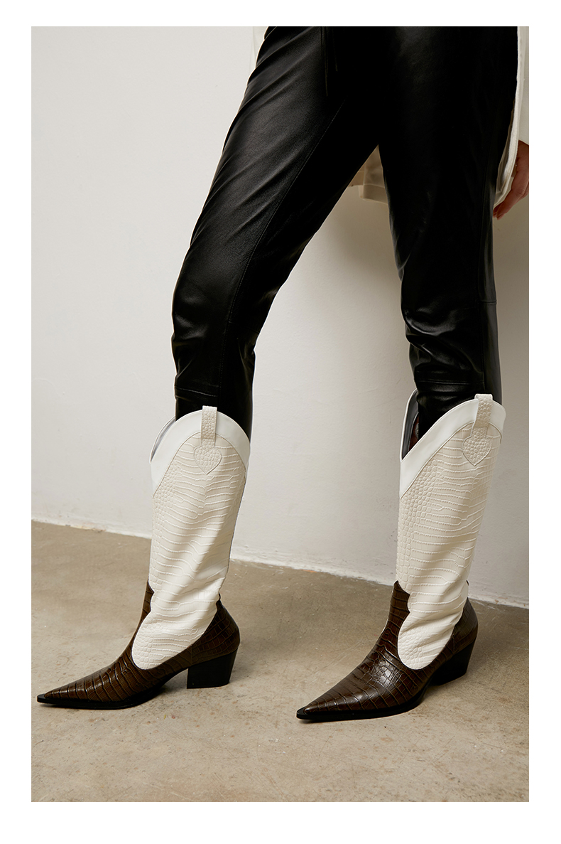 lost in echo 原创设计师品牌 尖头牛皮拼接西部中高筒靴