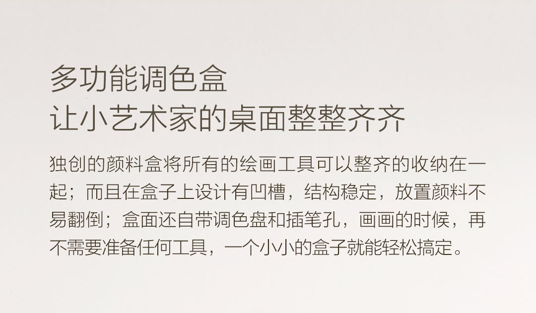 产品亮点:这是一款艺术启蒙教育玩具,多功能调色盒,方便整理收纳。
